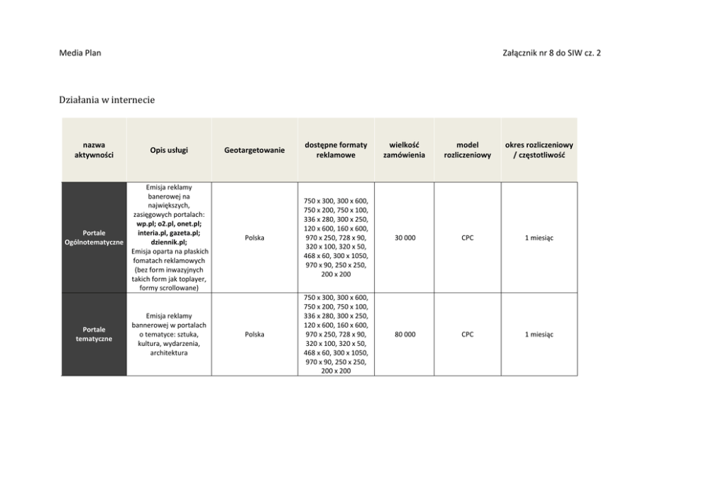 Media Plan Załącznik nr 8 do SIW cz. 2 Działania w internecie nazwa aktywności Opis usługi Portale Ogólnotematyczne Emisja reklamy banerowej na największych, zasięgowych portalach: wp.pl; o2.pl, onet.pl; interia.pl, gazeta.pl; dziennik.pl; Emisja oparta na płaskich fomatach reklamowych (bez form inwazyjnych takich form jak toplayer, formy scrollowane) Portale tematyczne Emisja reklamy bannerowej w portalach o tematyce: sztuka, kultura, wydarzenia, architektura Geotargetowanie dostępne formaty reklamowe wielkość zamówienia model rozliczeniowy okres rozliczeniowy / częstotliwość Polska 750 x 300, 300 x 600, 750 x 200, 750 x 100, 336 x 280, 300 x 250, 120 x 600, 160 x 600, 970 x 250, 728 x 90, 320 x 100, 320 x 50, 468 x 60, 300 x 1050, 970 x 90, 250 x 250, 200 x 200 30 000 CPC 1 miesiąc Polska 750 x 300, 300 x 600, 750 x 200, 750 x 100, 336 x 280, 300 x 250, 120 x 600, 160 x 600, 970 x 250, 728 x 90, 320 x 100, 320 x 50, 468 x 60, 300 x 1050, 970 x 90, 250 x 250, 200 x 200 80 000 CPC 1 miesiąc nazwa aktywności Geotargetowanie dostępne formaty reklamowe wielkość zamówienia model rozliczeniowy okres rozliczeniowy / częstotliwość Kierowanie behawioralne Emisja reklamy banerowej na podstawie zachowania użytkownika w sieci. Kryteria: wiek 18+, zainteresowania: teatr, sztuka, kultura, muzyka. Polska 750 x 300, 300 x 600, 750 x 200, 750 x 100, 336 x 280, 300 x 250, 120 x 600, 160 x 600, 970 x 250, 728 x 90, 320 x 100, 320 x 50, 468 x 60, 300 x 1050, 970 x 90, 250 x 250, 200 x 200 150 000 CPC 1 miesiąc GSP (Gmail Sponsored Promotion) Mailing wysyłany do posiadaczy kont mailowych Gmail. Kryteria: wiek 18+, zainteresowania: teatr, sztuka, kultura, muzyka. Polska Mailing HTML 10 000 CPO (za otwarte wiadomości) 1 miesiąc Google Display Network Display Select Keywords Emisja reklamy bannerowej w ramach Google Display Network (GDN), targetowana na podstawie wcześniejszych wyszukań użytkownika w Google. Kryteria: Słowa związane z ESK, kulturą, sztuką, wydarzeniami. Polska 750 x 300, 300 x 600, 750 x 200, 750 x 100, 336 x 280, 300 x 250, 120 x 600, 160 x 600, 970 x 250, 728 x 90, 320 x 100, 320 x 50, 468 x 60, 300 x 1050, 970 x 90, 250 x 250, 200 x 200 8 000 CPC 1 miesiąc Opis usługi nazwa aktywności Opis usługi Geotargetowanie dostępne formaty reklamowe wielkość zamówienia model rozliczeniowy okres rozliczeniowy / częstotliwość Facebook.com Emisja reklamy na portalu Facebook Kryteria: emisja na podstawie bazy email zapisanych do newslettera oraz osoby zainteresowane ESK, wydarzeniami i koncertami, wiek 18+, Polska reklama graficzna, video, canva, reklama karuzelowa 15 000 CPC 1 miesiąc Mobile Emisja reklamy w notyfikacjach urządzeń mobilnych Kryteria: osoby przebywające na Wrocławskim rynku oraz posiadające zainstalowane aplikacje z kategorii, sztuka, kultura, rozrywka Wrocław reklama w notyfikacjach 2 000 CPC 1 miesiąc Youtube Emisja reklamy video Kryteria: zainteresowania: muzyka poważna, klasyczna, teatr, wydarzenia kulturalne, wiek 18+ Polska pre-roll 200 000 CPV 1 miesiąc Video360 Emisja reklamy video w formacie interaktywnym video360 (umożliwiającym interakcje polegające na przesuwaniu obrazu sferycznego) Polska video 360 50 000 CPV 1 miesiąc nazwa aktywności Rich Media RTB Opis usługi Emisja interaktywnego formatu rich media Format musi mieć możliwość odtworzenia materiału wideo oraz zapoznania się z treściami bez konieczności przeklikania się na stronę (musi to umożliwiać z poziomu reklamy) Kryteria: osoby zainteresowane tematyką: sztuka, kultura, muzyka, teatr, architektura Emisja reklamy banerowej za pomocą platformy DoubleClick. Kryteria: kierowanie Audience Targeting z wykorzystaniem third i second party data. Emisja docierajaca do osób zainteresowanych wydarzeniami wokół ESK2016 oraz intersujących się kulturą, sztuką, teatrem. Geotargetowanie dostępne formaty reklamowe wielkość zamówienia model rozliczeniowy okres rozliczeniowy / częstotliwość Polska Banner rich media z wideo 30 000 CPE 1 miesiąc Polska 750 x 300, 300 x 600, 750 x 200, 750 x 100, 336 x 280, 300 x 250, 120 x 600, 160 x 600, 970 x 250, 728 x 90, 320 x 100, 320 x 50, 468 x 60, 300 x 1050, 970 x 90, 250 x 250, 200 x 200 14 000 000 CPM 1 miesiąc nazwa aktywności Opis usługi Mailing Emisja reklamy mailingowej Kryteria: wiek 18+, zainteresowanie kultura, sztuka, nauka, design. Mailing z video E-mail retargeting Retargeting Emisja reklamy mailingowej, kreacja mailingowa zawierająca wideo Kryteria: osoby zainteresowane kulturą, sztuką, designem, muzyką, wiek 20+. Emisja reklamy mailingowe Kryteria: wysyłka wiadomości e-mail do osób, które odwiedziły stronę: www.wroclaw2016.pl Emisja powinna wykorzystywać zewnętrzne dane - nie dysponujemy bazą mailingową. Emisja reklamy banerowej Kryteria: osoby, które odwiedziły stronę www.wroclaw2016.pl Geotargetowa dostępne formaty nie reklamowe wielkość zamówienia model rozliczeniowy okres rozliczeniowy / częstotliwość Polska Mailing HTML 40 000 CPC 1 miesiąc Polska Mailing HTML z wideo 10 000 CPC 1 miesiąc Polska Mailing HTML 1 000 CPC 1 miesiąc Polska 750 x 300, 300 x 600, 750 x 200, 750 x 100, 336 x 280, 300 x 250, 120 x 600, 160 x 600, 970 x 250, 728 x 90, 320 x 100, 320 x 50, 468 x 60, 300 x 1050, 970 x 90, 250 x 250, 200 x 200 5 000 CPC 1 miesiąc nazwa aktywności Opis usługi Produkcja materiałów graficznych i kreacji Produkcja wszystkich, niezbędnych do realizacji kampanii form reklamowych z nieniejszej/powyższej tabeli (zgodnie z formatemi, technologią oraz specyfikacjmi wydawców). Kreacje do kampanii internetowej powinny być animowane, przygotwane w technologii HTML5 na podstawie przekazanych przez Zamawiającego informacji, wytycznych i materiałów. Prawa do publikacji na okres 6 miesięcy miesiąca, cała Europa, Internet, eventy, TV nazwa aktywności Opis usługi Web Analityka Weryfikacja i konfiguracja narzędzia Google Analytics oraz Google Tag Manager.