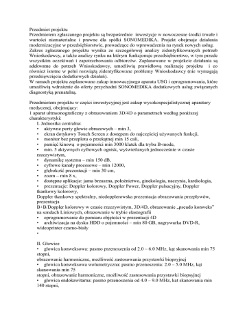 Przedmiot projektu Przedmiotem zgłaszanego projektu są bezpośrednie inwestycje w nowoczesne środki trwałe i wartości niematerialne i prawne dla spółki SONOMEDIKA. Projekt obejmuje działania modernizacyjne w przedsiębiorstwie, prowadzące do wprowadzenia na rynek nowych usług. Zakres zgłaszanego projektu wynika ze szczegółowej analizy zidentyfikowanych potrzeb Wnioskodawcy, a także analizy rynku na którym funkcjonuje przedsiębiorstwo, w tym przede wszystkim oczekiwań i zapotrzebowania odbiorców. Zaplanowane w projekcie działania są adekwatne do potrzeb Wnioskodawcy, umożliwią prawidłową realizację projektu i co również istotne w pełni rozwiążą zidentyfikowane problemy Wnioskodawcy (nie wymagają przedsięwzięcia dodatkowych działań). W ramach projektu zaplanowano zakup innowacyjnego aparatu USG i oprogramowania, które umożliwią wdrożenie do oferty przychodni SONOMEDIKA dodatkowych usług związanych diagnostyką prenatalną. Przedmiotem projektu w części inwestycyjnej jest zakup wysokospecjalistycznej aparatury medycznej, obejmujący: 1 aparat ultrasonograficzny z obrazowaniem 3D/4D o parametrach według poniższej charakterystyki: I. Jednostka centralna: • aktywne porty głowic obrazowych – min 3, • ekran dotykowy Touch Screen z dostępem do najczęściej używanych funkcji, • monitor bez przeplotu o przekątnej min 15 cali, • pamięć kinową o pojemności min 3000 klatek dla trybu B-mode, • min. 5 aktywnych cyfrowych ognisk, wyświetlanych jednocześnie w czasie rzeczywistym, • dynamikę systemu – min 150 dB, • cyfrowe kanały procesowe – min 12000, • głębokość prezentacji – min 30 cm, • zoom – min 8 x, • dostępne aplikacje: jama brzuszna, położnictwo, ginekologia, naczynia, kardiologia, • prezentacje: Doppler kolorowy, Doppler Power, Doppler pulsacyjny, Doppler tkankowy kolorowy, Doppler tkankowy spektralny, niedopplerowska prezentacja obrazowania przepływów, prezentacja B+B/Doppler kolorowy w czasie rzeczywistym, 3D/4D, obrazowanie „pseudo konweks” na sondach Liniowych, obrazowanie w trybie elastografii • oprogramowanie do pomiaru objętości w prezentacji 4D • archiwizacja na dysku HDD o pojemności – min 80 GB, nagrywarka DVD-R, wideoprinter czarno-biały • II. Głowice • głowica konweksowa: pasmo przenoszenia od 2.0 – 6.0 MHz, kąt skanowania min 75 stopni, obrazowanie harmoniczne, możliwość zastosowania przystawki biopsyjnej • głowica konweksowa wolumetryczna: pasmo przenoszenia: 2.0 – 5.0 MHz, kąt skanowania min 75 stopni, obrazowanie harmoniczne, możliwość zastosowania przystawki biopsyjnej • głowica endokawitarna: pasmo przenoszenia od 4.0 – 9.0 MHz, kat skanowania min 140 stopni, możliwość zastosowania przystawki biopsyjnej • głowica liniowa: pasmo przenoszenia od 6.0 – 18.0 MHz, obrazowanie harmoniczne, możliwość zastosowania przystawki biopsyjnej III. Opcje do rozbudowy • obrazowanie w trybie skrzyżowanych ultradźwięków • obrazowanie tomograficzne • obrazowanie panoramiczne • doppler ciągły Określone, szczegółowe parametry sprzętu, planowanego do zakupu, pozwalają mieć pewność, że aparatura będzie spełniała wymagane standardy i normy światowe dla tego typu urządzeń. Z racji precyzji, możliwości programowych aparatury i jej zaawansowania technologicznego, możliwe będzie w oparciu o ten sprzęt, świadczenie nowych usług medycznych, takich jak: 1. usg genetyczne i echokardiograficzne w I trymestrze ciąży, wdrożenie 2-stopniowego modelu obliczania ryzyka wystąpienia abberacji chromosomalnych (markery usg- NT, kość nosowa, niedomykalność zastawki trójdzielnej, przepływ w prz. żylnym, analiza kąta FMF) - I trymestr ciąży 2. usg genetyczne, II trymestru ciąży 3. badanie echokardiograficzne II tr. Ciąży 4. STIC, TUI w projekcji 3D 5. diagnostyka porodu przedwczesnego przy wykorzystaniu nowatorskiej metody oceny czynności szyjki macicy za pomocą opcji elastografii. Bardzo istotnym czynnikiem, mającym znaczenie przy określaniu parametrów technicznych urządzenia jest możliwość pewnej diagnostyki wad rozwojowych, niemożliwych lub bardzo trudnych do zaobserwowania w oparciu o dotychczas eksploatowany sprzęt. Z długiej listy tych schorzeń, wymienić należy: 1/ Wady ośrodkowego układu nerwowego: • agenezja ciała modzelowatego • zespół Dandy – Walker – agenezja robaka móżdżku • holoprosencephalia płatowa • tętniaki zatoki Galena 2/ Wady serca • VSD – ubytek przegrody międzykomorowej • zespoły heterotaksji • koarktacja aorty • HLHS – zespół hipoplazji lewego serca • stenoza tętnicy płucnej • TGA – przełożenie wielkich naczyń Tetralogia Fallota • Patologia Ebsteina 3/ Wady układu oddechowego: • CCAM – zwyrodnienie pęcherzykowe płuc – typ mikrocystyczny • sekwestracja płuca • CDH – wrodzona przepuklina przeponowa 4/ Wady przedniej ściany jamy brzusznej • przepuklina pępkowa – małego stopnia – niezwykle istotny marker wad genetycznych W ramach projektu Wnioskodawca zaplanował również zakup specjalistyczne oprogramowanie wspomagające przeprowadzenie badań USG. Oprogramowanie to jest dedykowane do prowadzenia badań USG, w tym badań prenatalnych. Planowane do zakupu w ramach projektu oprogramowanie będzie zgodne z wytycznymi FMF (Fetal Medicine Foundation http://www.fetalmedicine.com/fmf/) czyli organizacją, która wytycza standardy przeprowadzania badań prenatalnych. Zgodnie z jej wytycznymi są prowadzone te badania na całym świecie, również NFZ wymaga aby lekarz przeprowadzający te badania miał certyfikat FMF oraz aby jednostka miała licencję na oprogramowanie FMF. Oprogramowanie to jest potrzebne aby na podstawie obrazu z USG z I-II trymestru ciąży oraz badań laboratoryjno-genetycznych określić ryzyko, że dziecko urodzi się z wadą wrodzoną. Wszystkie zaplanowane w projekcie wydatki są niezbędne dla 