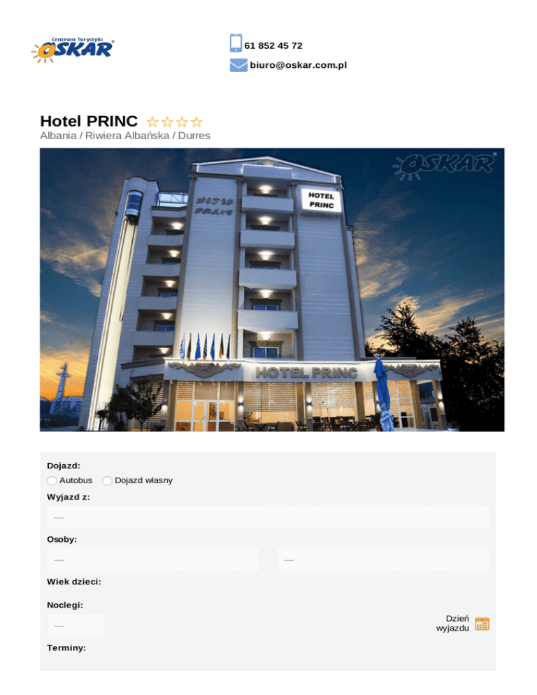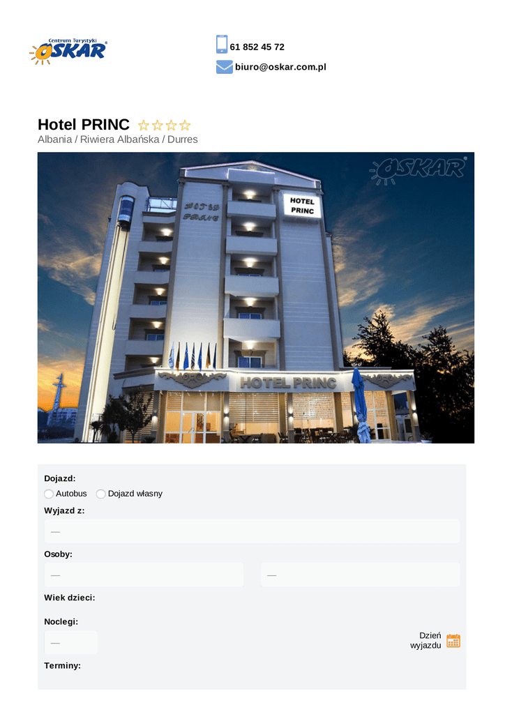 61 852 45 72 [email protected] Hotel PRINC Albania / Riwiera Albańska / Durres Dojazd: Autobus Dojazd własny Wyjazd z: Osoby: Wiek dzieci: Noclegi: Dzień wyjazdu Terminy: Pokój: Wyżywienie: Najtańsza oferta First Minute cena katalogowa do 5 marca 2017: 1048,20 zł do 5 marca 2017: 1048,20 zł do 6 kwietnia 2017: 2445,80 zł do 6 kwietnia 2017: 2445,80 zł Suma:3494,00 zł Suma: 3494,00 zł Opis oferty Miejscowość Atuty nowo otwarty obiekt Opinie położenie w turystycznej części miasta - Golem prywatna piaszczysta plaża oraz taras słoneczny Rozkład jazdy bezpłatne leżaki dla gości hotelowych bezpłatna klimatyzacja bezpłatne Wi-Fi dostępne w pokojach Położenie Hotel Princ **** to nowoczesny, otwarty w 2016 roku obiekt. Położony jest w turystycznej dzielnicy Durres – Golem. W okolicy znajduje się wiele barów, restauracji oraz sklepów. Hotel dysponuje prywatną piaszczystą plażą, oddaloną o ok. 600 metrów. Zakwaterowanie Zakwaterowanie w pokojach z łazienkami z prysznicem, klimatyzacją, lodówką oraz telewizorem LCD z kanałami kablowymi. Większość pokoi posiada balkon, widok na morze dostępny jest z wyższych pięter budynku. Na parterze hotelu znajduje się bar oraz restauracja. Dostępne opcje zakwaterowania pokój 2 osobowy z balkonem pokój 2 osobowy bez balkonu pokój 3 osobowy z balkonem pokój 3 osobowy bez balkonu apartament 4 osobowy z balkonem Dostępne opcje wyżywienia śniadania śniadania i obiadokolacje Pakiet KOMFORT gwarancja wyboru miejsca w autokarze napoje w autokarze w cenie (6 x do wyboru: kawa, herbata, zimny napój 0,2l) cena: 50 zł/os Pakiet PRESTIGE gwarancja wyboru miejsca w autokarze napoje w autokarze w cenie (6 x do wyboru: kawa, herbata, zimny napój 0,2l) pierwszeństwo wejścia na pokład autokaru nadbagaż 5 kg w cenie suchy prowiant na drogę powrotną cena: 100 zł/os Ubezpieczenie Warunki ubezpieczenia Bezpieczne Podróże Signal Iduna dokument do pobrania www.oskar.com.pl/zalaczniki/owu Warunki ubezpieczenia Kosztów Imprezy Turystycznej Signal Iduna dokument do pobrania www.oskar.com.pl/zalaczniki/owurg Karta Dużej Rodziny www.oskar.com.pl/zalaczniki/karta_duzej_rodziny Turystyczny Fundusz Gwarancyjny W związku z powołaniem do życia w dniu 26.11.2016 Turystycznego Funduszu Gwarancyjnego każdy klient Biura Podróży Oskar zobowiązany jest do zapłaty kwoty w wysokości 10zł/os. przy każdorazowej rezerwacji imprezy turystycznej (obowiązuje od dnia 26.11.2016). Kwota przeznaczona na Turystyczny Fundusz Gwarancyjny zostanie automatycznie doliczona do wartości rezerwacji (w momencie jej dokonania). Wyjątkiem są imprezy turystyczne odbywające się w krajach posiadających granicę z Rzeczpospolitą Polską. Składka nie jest przychodem biura. Udogodnienia Klimatyzacja Regulowane fotele Tacki GPS Multimedia Nowoczesna flota Zawodowy kierowca Pasy bezpieczeństwa Toaleta w autokarze Podnóżki Dla rodzin z dziećmi Wi-Fi Centrum rozrywek Winda Życie nocne Bez paszportu Blisko plaży Parking Restauracja hotelowa Region nadmorski Sport Program ramowy Dzień 1 Wyjazd z Polski zgodnie z rozkładem jazdy autokarów. Przejazd przez Czechy, Słowację, Węgry, Serbię, Macedonię. Dzień 2 Przyjazd do Vlory w godzinach południowych. Zakwaterowanie. Spotkanie informacyjne z rezydentem. Dzień 3-10 Pobyt na miejscu, możliwość korzystania z dodatkowych wycieczek fakultatywnych. Dzień 11 Wykwaterowanie do godz. 09.00. Czas wolny. Wyjazd do Polski w godzinach popołudniowych. Dzień 12 Przejazd przez Macedonię, Serbię, Węgry, Słowację, Czechy. Przyjazd do Polski. Orientacyjne godziny powrotu do poszczególnych miast zgodnie z rozkładem jazdy autokarów. Cena obejmuje Cena obejmuje przejazd autokarem klasy LUX (klimatyzacja, cafe - bar, DVD, WC) zakwaterowanie: 9 noclegów w Hotelu PRINC **** wyżywienie BB: 9 śniadań opiekę pilota w czasie podróży opiekę rezydenta na miejscu ubezpieczenie KL 10000 euro, NNW 10000 zł, BP (utrata 500 zł) Cena nie obejmuje Dopłaty wymagane na miejscu opłata klimatyczna - 10 euro/os; dzieci do 12 lat płacą 50% - płatne u pilota w autokarze Dopłaty opcjonalne ubezpieczenie od chorób przewlekłych KL 20000 euro, NNW 10000 zł, BP (utarta 500 zł): 160 zł/os ubezpieczenie od kosztów rezygnacji: 3,5% wartości rezerwacji Informacje dodatkowe dokumenty: paszport lub dowód osobisty (zgodnie z obowiązującymi przepisami) zaleca się wyrobienie karty EKUZ brak aneksów kuchennych chyba, że oferta stanowi inaczej Chcesz wiedzieć szybciej? Polub nas na facebooku OSKAR Sp. z o.o. pl.Wolności 2/4c, 61-738 Poznań Potrzebujesz pomocy? Zadzwoń lub napisz: 61 852 45 72 [email protected] Zadzwoń Projekt i wdrożenie: Simply User