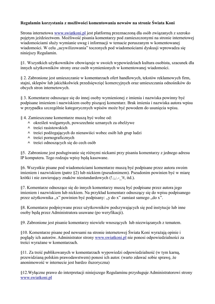 Regulamin korzystania z możliwości komentowania newsów na stronie Świata Koni Strona internetowa www.swiatkoni.pl jest platformą przeznaczoną dla osób związanych z szeroko pojętym jeździectwem. Możliwość pisania komentarzy pod zamieszczonymi na stronie internetowej wiadomościami służy wymianie uwag i informacji w temacie poruszanym w komentowanej wiadomości. W celu „ucywilizowania” toczonych pod wiadomościami dyskusji wprowadza się niniejszy Regulamin. §1. Wszystkich użytkowników obowiązuje w swoich wypowiedziach kultura osobista, szacunek dla innych użytkowników strony oraz osób wymienionych w komentowanej wiadomości. § 2. Zabronione jest umieszczanie w komentarzach ofert handlowych, tekstów reklamowych firm, stajni, sklepów lub jakichkolwiek przedsięwzięć komercyjnych oraz umieszczania odnośników do obcych stron internetowych. § 3. Komentarze odnoszące się do innej osoby wymienionej z imienia i nazwiska powinny być podpisane imieniem i nazwiskiem osoby piszącej komentarz. Brak imienia i nazwiska autora wpisu w przypadku szczególnie kategorycznych wpisów może być powodem do usunięcia wpisu. § 4. Zamieszczane komentarze muszą być wolne od: określeń wulgarnych, powszechnie uznanych za obelżywe treści rasistowskich treści podżegających do nienawiści wobec osób lub grup ludzi treści pornograficznych treści odnoszących się do cech osób §5. Zabronione jest posługiwanie się różnymi nickami przy pisaniu komentarzy z jednego adresu IP komputera. Tego rodzaju wpisy będą kasowane. §6. Wszystkie pisane pod wiadomościami komentarze muszą być podpisane przez autora swoim imieniem i nazwiskiem (patrz §2) lub nickiem (pseudonimem). Pseudonim powinien być w miarę krótki i nie zawierający znaków niestandardowych (!.;,:.-_'#, itd.). §7. Komentarze odnoszące się do innych komentarzy muszą być podpisane przez autora jego imieniem i nazwiskiem lub nickiem. Na przykład komentarz odnoszący się do wpisu podpisanego przez użytkownika „x” powinien być podpisany: „y do x” zamiast samego „do x”. §8. Komentarze podpisywane przez użytkowników podszywających się pod instytucje lub inne osoby będą przez Administratora usuwane (po weryfikacji). §9. Zabronione jest pisanie komentarzy niewiele wnoszących lub niezwiązanych z tematem. §10. Komentarze pisane pod newsami na stronie internetowej Świata Koni wyrażają opinie i poglądy ich autorów. Administrator strony www.swiatkoni.pl nie ponosi odpowiedzialności za treści wyrażane w komentarzach. §11. Za treść publikowanych w komentarzach wypowiedzi odpowiedzialność (w tym karną, przewidzianą polskim prawodawstwem) ponosi ich autor. (warto zdawać sobie sprawę, że anonimowość w internecie jest bardzo iluzoryczna) §12.Wyłączne prawo do interpretacji niniejszego Regulaminu przysługuje Administratorowi strony www.swiatkoni.pl §13. Administratorowi strony www.swiatkoni.pl przysługuje prawo do usuwania wpisów naruszających niniejszy Regulamin. W przypadkach powtarzającego się naruszania przez użytkownika postanowień niniejszego Regulaminu Administratorowi przysługuje prawo do czasowego lub stałego blokowania możliwości pisania komentarzy przez takiego użytkownika.