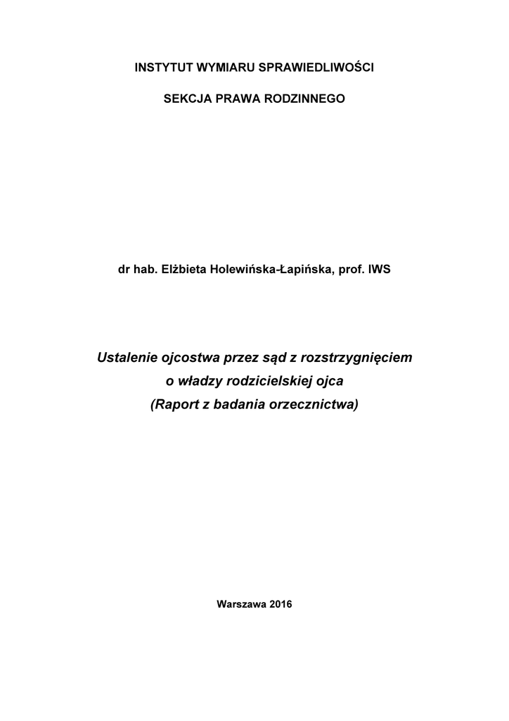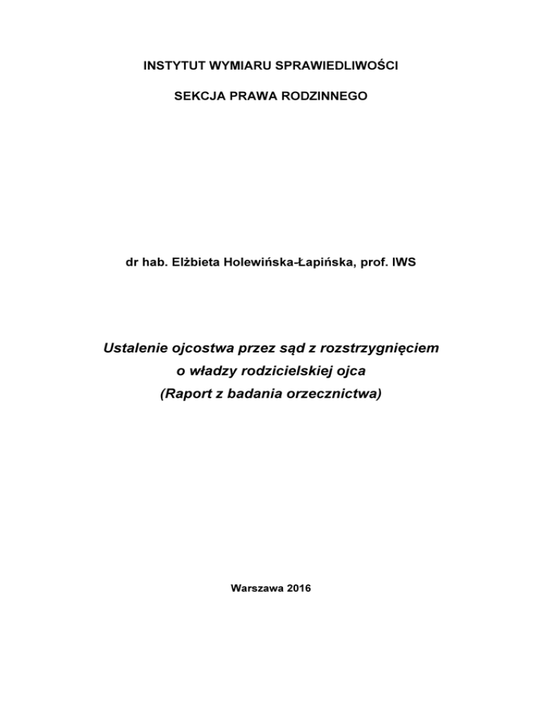 INSTYTUT WYMIARU SPRAWIEDLIWOŚCI SEKCJA PRAWA RODZINNEGO dr hab. Elżbieta Holewińska-Łapińska, prof. IWS Ustalenie ojcostwa przez sąd z rozstrzygnięciem o władzy rodzicielskiej ojca (Raport z badania orzecznictwa) Warszawa 2016 Spis treści Uwagi wprowadzające ................................................................................................ 2 I. Urodzenia pozamałżeńskie w Polsce ...................................................................... 7 1. Informacje statystyczne .................................................................................... 7 2. Prawdopodobne przyczyny wzrostu urodzeń pozamałżeńskich w Polsce (sygnalizacja problemu) ................................................................................... 9 2.1. Ustalenie ogólne ..................................................................................... 9 2.2. Próby wyjaśnienia przyczyn zwiększania się urodzeń pozamałżeńskich ..................................................................................................................... 14 2.2.1. Teoria przejścia demograficznego .............................................. 14 2.2.2. Przykładowe koncepcje wyjaśniające terytorialne zróżnicowanie wzrostu urodzeń pozamałżeńskich w Polsce ....................................... 16 II. Demograficzno-społeczna charakterystyka stron ................................................. 20 1. Matki............................................................................................................... 20 1.1. Wiek matek w dniu urodzenia dziecka, którego dotyczyło postępowanie ..................................................................................................................... 20 1.2. Stan cywilny i sytuacja życiowa matek w dniu orzekania przez sąd pierwszej instancji ........................................................................................ 22 1.3. Wykształcenie, zatrudnienie, źródła utrzymania matek w dniu orzekania przez sąd pierwszej instancji........................................................................ 24 2. Ojcowie .......................................................................................................... 28 2.1. Wiek ojców w dniu urodzenia dziecka, którego dotyczyło postępowanie ..................................................................................................................... 28 2.2. Stan cywilny i sytuacja życiowa ojców w dniu orzekania przez sąd pierwszej instancji ........................................................................................ 28 2.3. Wykształcenie, zatrudnienie, źródła utrzymania ojców w dniu orzekania przez sąd pierwszej instancji........................................................................ 30 3. Charakterystyka matek i ojców (zestawienia porównawcze) .......................... 32 3.1. Wiek w dniu urodzenia dziecka ............................................................. 32 3.2. Stan cywilny, wykształcenie, sytuacja osobista i zarobkowa w dniu wyrokowania ................................................................................................ 33 3.3. Uwagi podsumowujące ......................................................................... 40 4. Stosunki pomiędzy rodzicami w okresie poprzedzającym wniesienie pozwu o ustalenie ojcostwa ....................................................................................... 41 5. Dzieci ............................................................................................................. 45 5.1. Wiek, stan zdrowia i rozwoju dzieci ....................................................... 45 5.2. Sytuacja prawna i opiekuńcza dzieci w dniu orzekania......................... 47 III. Informacje ogólne o procesach............................................................................ 48 1. Powodowie i pozwy ........................................................................................ 48 1.1. Powodowie............................................................................................ 48 1.2. Pełnomocnicy........................................................................................ 50 1.3. Pozwy ................................................................................................... 51 1.3.1. Formalna poprawność pozwu..................................................... 51 1.3.2. Żądania pozwu ........................................................................... 51 2. Strona pozwana ............................................................................................. 53 2.1. Kurator dla pozwanego dziecka ............................................................ 53 2.2. Kurator dla pozwanego o nieznanym miejscu pobytu ........................... 55 3. Wykazywanie podstawy domniemania z art. 85 § 1 k.r.o. .............................. 59 4. Stanowisko strony pozwanej .......................................................................... 60 4.1. Forma wyrażenia stanowiska (odpowiedź na pozew) ........................... 60 4.2. Stanowisko pozwanych matek .............................................................. 61 4.3. Stanowisko pozwanych domniemanych ojców ..................................... 62 5. Postępowanie dowodowe i rozstrzygnięcia merytoryczne w wyrokach ustalających ojcostwo .................................................................................... 64 5.1. Ogólne informacje o przeprowadzonych dowodach i aktywności stron w postępowaniu ........................................................................................... 64 5.2. Postępowanie w przedmiocie ustalenia pochodzenia dziecka od mężczyzny wskazanego w pozwie, jako jego ojciec .................................... 66 5.3. Postępowanie w przedmiocie władzy rodzicielskiej .............................. 71 5.4. Rozstrzygnięcia merytoryczne w wyrokach ustalających ojcos