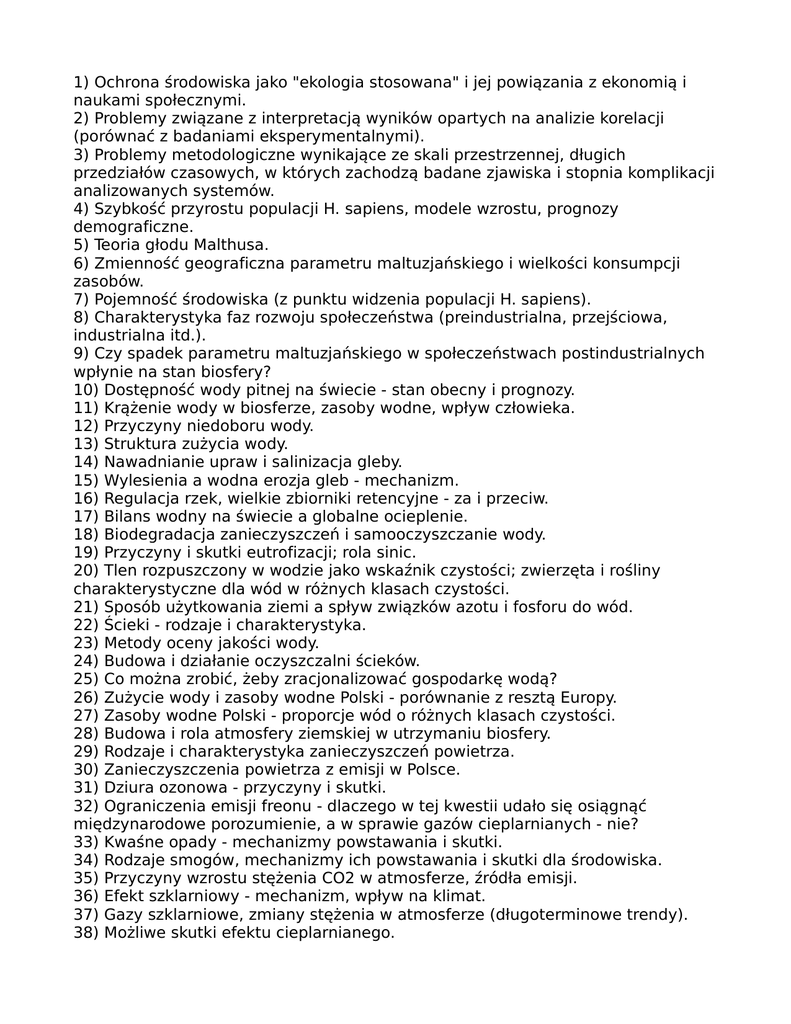 1) Ochrona środowiska jako "ekologia stosowana" i jej powiązania z ekonomią i naukami społecznymi. 2) Problemy związane z interpretacją wyników opartych na analizie korelacji (porównać z badaniami eksperymentalnymi). 3) Problemy metodologiczne wynikające ze skali przestrzennej, długich przedziałów czasowych, w których zachodzą badane zjawiska i stopnia komplikacji analizowanych systemów. 4) Szybkość przyrostu populacji H. sapiens, modele wzrostu, prognozy demograficzne. 5) Teoria głodu Malthusa. 6) Zmienność geograficzna parametru maltuzjańskiego i wielkości konsumpcji zasobów. 7) Pojemność środowiska (z punktu widzenia populacji H. sapiens). 8) Charakterystyka faz rozwoju społeczeństwa (preindustrialna, przejściowa, industrialna itd.). 9) Czy spadek parametru maltuzjańskiego w społeczeństwach postindustrialnych wpłynie na stan biosfery? 10) Dostępność wody pitnej na świecie - stan obecny i prognozy. 11) Krążenie wody w biosferze, zasoby wodne, wpływ człowieka. 12) Przyczyny niedoboru wody. 13) Struktura zużycia wody. 14) Nawadnianie upraw i salinizacja gleby. 15) Wylesienia a wodna erozja gleb - mechanizm. 16) Regulacja rzek, wielkie zbiorniki retencyjne - za i przeciw. 17) Bilans wodny na świecie a globalne ocieplenie. 18) Biodegradacja zanieczyszczeń i samooczyszczanie wody. 19) Przyczyny i skutki eutrofizacji; rola sinic. 20) Tlen rozpuszczony w wodzie jako wskaźnik czystości; zwierzęta i rośliny charakterystyczne dla wód w różnych klasach czystości. 21) Sposób użytkowania ziemi a spływ związków azotu i fosforu do wód. 22) Ścieki - rodzaje i charakterystyka. 23) Metody oceny jakości wody. 24) Budowa i działanie oczyszczalni ścieków. 25) Co można zrobić, żeby zracjonalizować gospodarkę wodą? 26) Zużycie wody i zasoby wodne Polski - porównanie z resztą Europy. 27) Zasoby wodne Polski - proporcje wód o różnych klasach czystości. 28) Budowa i rola atmosfery ziemskiej w utrzymaniu biosfery. 29) Rodzaje i charakterystyka zanieczyszczeń powietrza. 30) Zanieczyszczenia powietrza z emisji w Polsce. 31) Dziura ozonowa - przyczyny i skutki. 32) Ograniczenia emisji freonu - dlaczego w tej kwestii udało się osiągnąć międzynarodowe porozumienie, a w sprawie gazów cieplarnianych - nie? 33) Kwaśne opady - mechanizmy powstawania i skutki. 34) Rodzaje smogów, mechanizmy ich powstawania i skutki dla środowiska. 35) Przyczyny wzrostu stężenia CO2 w atmosferze, źródła emisji. 36) Efekt szklarniowy - mechanizm, wpływ na klimat. 37) Gazy szklarniowe, zmiany stężenia w atmosferze (długoterminowe trendy). 38) Możliwe skutki efektu cieplarnianego. 39) Źódła energii - alternatywy dla węglowodorów kopalnych. 40) Biokoncentracja, bioakumulacja i biomagnifikacja związków toksycznych. 41) Mechanizm biomagnifikacji. 42) Toksyny ulegające- i nie ulegające biomagnifikacji. 43) Rodzaje pestycydów, argumenty za- i przeciw stosowaniu. 44) Metody biologicznego zwalczania "szkodników". 45) Metody oceny toksyczności. 46) Charakterystyka dioksyn, metali ciężkich, cyjanków i polichlorowanych bifenyli. 47) Źródła odpadów, metody ich zagospodarowania. 48) Technologia bezpiecznego składowania odpadów - budowa i obsługa wysypiska śmieci. 49) Kompostowanie - budowa i obsługa kompostowni. 50) Spalarnie śmieci - argumenty za- i przeciw. 51) Wady i zalety różnych metod pochówku zmarłych. 52) Produkcja żywności a wzrost populacji H. sapiens: stan obecny i prognozy. 53) Przyczyny spadku (w przeliczeniu na osobę) produkcji żywności. 54) Przepływ energii między poziomami troficznymi w biocenozie. 55) Zalety diety wegetariańskiej z punktu widzenia ekologii. 56) Perspektywy zwiększenia produkcji żywności. 57) "Zielona rewolucja" i "rewolucja genetyczna" - porównanie metod zwiększania plonów, efektywności. 58) Największe zagrożenia dla rolnictwa w przyszłości. 59) Wymieranie gatunków - podstawowe fakty z paleontologii i ekologii. 60) Szacunki aktualnej liczby gatunków i proporcji zagrożonych wymarciem. 61) Czy obecne wymieranie gatunków ma cechy "wielkiego wymierania"? 62) Klasyfikacja gatunków pod względem podatności na wymarcie; charakterystyczne cechy gatunków wrażliwych. 63) Przyczyny wymierania. 64) Model foremkowy. 65) Od czego zależy minimalna wielkość trwałej populacji? 66) Wymieranie w biocenozach - efekt domina. 67) Co to są "ecosystem services"? 68) Na czym polega globalne znaczenie tropikalnych lasów deszczowych? 69) Kurczenie się powierzchni tropikalnych lasów deszczowych - skala i przyczyny zjawiska, prognozy. 70) Skutki ekologiczne wycinania tropikalnych lasów deszczowych. 71) Czym zajmuje się etnobiologia? 72) Na czym mogłaby polegać zrównoważona eksploatacja tropikalnych lasów deszczowych.