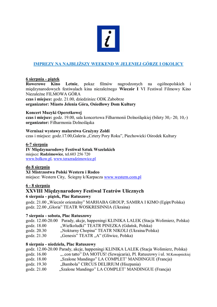 IMPREZY NA NAJBLIŻSZY WEEKEND W JELENIEJ GÓRZE I OKOLICY 6 sierpnia - piątek Rowerowe Kino Letnie, pokaz filmów nagrodzonych na ogólnopolskich i międzynarodowych festiwalach kina niezależnego Wieczór I VI Festiwal Filmowy Kino Niezależne FILMOWA GÓRA czas i miejsce: godz. 21.00, dziedziniec ODK Zabobrze organizator: Miasto Jelenia Góra, Osiedlowy Dom Kultury Koncert Muzyki Operetkowej czas i miejsce: godz. 19.00, sala koncertowa Filharmonii Dolnośląskiej (bilety 30,- 20, 10,-) organizator: Filharmonia Dolnośląska Wernisaż wystawy malarstwa Grażyny Zoldi czas i miejsce: godz.17.00,Galeria „Cztery Pory Roku”, Piechowicki Ośrodek Kultury 6-7 sierpnia IV Międzynarodowy Festiwal Sztuk Wszelakich miejsce: Radzimowice, tel.603 256 720 www.bolkow.pl, www.terazradzimowice.pl do 8 sierpnia XI Mistrzostwa Polski Western i Rodeo miejsce: Western City, Ściegny k/Karpacza www.western.com.pl 6 - 8 sierpnia XXVIII Międzynarodowy Festiwal Teatrów Ulicznych 6 sierpnia - piątek, Plac Ratuszowy godz. 21.00 „Wieczór orientalny” MARHABA GROUP, SAMIRA I KIMO (Egipt/Polska) godz. 22.00 „Gloria” TEATR WOSKRESINNIA (Ukraina) 7 sierpnia - sobota, Plac Ratuszowy godz. 12.00-20.00 Parady, akcje, happeningi KLINIKA LALEK (Stacja Wolimierz, Polska) godz. 18.00 „Wielkoludki” TEATR PINEZKA (Gdańsk, Polska) godz. 20.30 „Nokturny Chopina” TEATR NIKOLI (Ukraina/Polska) godz. 21.30 „Genesis” TEATR „A” (Gliwice, Polska) 8 sierpnia - niedziela, Plac Ratuszowy godz. 12.00-20.00 Parady, akcje, happeningi KLINIKA LALEK (Stacja Wolimierz, Polska) godz. 16.00 „..con tatto” DA MOTUS! (Szwajcaria), Pl. Ratuszowy i ul. M.Konopnickiej godz. 18.00 „Szalone Mandingo” LA COMPLET’ MANDINGUE (Francja) godz. 19.30 „Bambola” CIRCUS DELIRIUM (Hiszpania) godz. 21.00 „Szalone Mandingo” LA COMPLET’ MANDINGUE (Francja) godz. 22.00 „Don Quixote” THEATER GAJES (Holandia) – plac za HT “Mercure” organizator: Miasto Jelenia Góra, Teatr im. Cypriana Kamila Norwida 7 - 8 sierpnia Dni Jagniątkowa, festyn - święto mieszkańców dzielnicy Jeleniej Góry; w sobotę o godz. 19.00 dyskoteka dla młodzieży, w niedzielę od godz. 13.00 - koncerty zespołów ludowych, zabawy integracyjne, atrakcje dla dzieci (trampolina, malowanie twarzy i inne), mecz piłki nożnej – OW RAWAR przy ul. Michałowickiej, organizator: Miasto Jelenia Góra, MDK „Muflon”, Klub Osiedlowy Watra Jagniątkowska 7 sierpnia - sobota Dzień Otwarty w Muzeum Miejskim „Dom Gerharta Hauptmanna” Tradycyjnie w rocznicę zamieszkania Gerharta Hauptmanna w Willi „Wiesenstein” zapraszamy na Dzień Otwartych Drzwi, W programie: otwarcie przygotowanej we współpracy z Muzeum Szkła i Biżuterii w Jabloncu wystawy biżuterii jabloneckiej, prezentacje multimedialne związane z historią biżuterii, dawnych zanikających tradycji regionu, prezentacja wyrobu biżuterii w ramach stoiska z manufakturą (godz. 12.00), koncert plenerowy z bufetem śląskim w parku otaczającym willę śląskiego Noblisty (godz.13.00), na zakończenie finałowy spektakl operowy „Muzyczny Ogród Liczyrzepy” w Hali Rajskiej w wykonaniu uczestników Międzynarodowych Warsztatów Operowych (godz. 18.00) (info z muzeum) organizator: Miasto Jelenia Góra, Muzeum Miejskie „Dom Gerharta Hauptmanna" Maraton Karkonoski – Szrenica – Śnieżka www.maratonkarkonoski.pl Letni Bieg do Kotła Łomniczki czas i miejsce: godz.10.00, Szlak im. dr Orłowicza, tel. 75 76 19 716 Gminny Dzień Strażaka godz. 12:00 miejsce: Miłków, teren Pałacu Spiż, tel. 75 76 21 093 org. Wójt Gminy Podgórzyn w ramach projektu „ Polsko – Czeska Współpraca Straży Pożarnej” Krajoznawczy spacer nr 4 godz.8.30 , Dworzec PKS - autobus do Lubomierza (prowadzi Krzysztof Tęcza) organizator: Komisja Krajoznawcza przy O. PTTK „Sudety Zachodnie” w Jeleniej Górze III Rodzinny festyn „Rozmaitości nad Bobrem” czas i miejsce: godz.15.00 pod murami pałacu w Bobrowie Muzyka w Kościółku „Wang” czas i miejsce: godz.20.00, Kościół „Wang”, Karpacz 8 sierpnia - niedziela Spektakl Teatru Pinezka w ramach „Koncertów Promenadowych” czas i miejsce: godz. 16.00, Park Norweski - taras Muzeum Przyrodniczego (w razie deszczu spektakl odbędzie się w Kościele Ewangelicko–Augsburskim) organizator: Miasto Jelenia Góra, Przystań Twórcza - Cieplickie Centrum Kultury, Muzeum Przyrodnicze Cieplickie Koncerty Organowe, koncert w wykonaniu Reinharda Seeligera czas i miejsce: godz. 19.15, Kościół Ewangelicki, Plac Piastowski 18 (bilety w cenie 10 zł, ulgowy, dzieci, młodzież, studenci - 7 zł) organizator: Parafia Ewangelicko-Augsburska, Plac Piastowski 18, Mecenat Miasta Jelenia Góra Jazzujące koncertowanie czas i miejsce: godz.18.00, Hotel Caspar, Jelenia Góra – Cieplice więcej na www.caspar.pl Pokaz starego Rzemiosła czas i miejsce: godz.11.00-17.00, Siedlęcin, Wieża książęca org. Fundacja Zamku Chudów www.zamekchudow.pl Leśna Biesiada czas i miejsce: godz.16.00, Rzeszówek, koło Świerzawy tel. +48 75 71 35 360, +48 75 71 35 388, +48 75 71 35 390 org. Rada Sołecka, KGW Rzeszówek, CKSiT; Wielki Koncert- DODA czas i miejsce: godz.17.00, Karpacz, stadion Miejski, ul. Krótka org. Agencja Koncertowa "BAMA" i Burmistrz Karpacza www.karpacz.pl Koncerty w Dolinie Pałaców i Ogrodów Koncert – Mistrz Świata w grze na pile czas i miejsce: godz.17.00 ,Pałac w Wojanowie www.palac-wojanow.pl W niedzielę na wycieczkę Trasa długości 13 km prowadzi przez wschodnią część Pogórza Karkonoskiego. Wyjazd spod dworca PKP autobusem PKS o godz.9.10 do Karpacza (Przystanek Biały Jar) Wycieczkę prowadzi Krzysztof Tęcza ze Zgorzelca organizator: ZO PTTK „Sudety Zachodnie” XX Wyścig w Kolarstwie Górskim – MTB Karpacz-Śnieżka- Non Stop Góra czas i miejsce: godz.12.00, Stadion Miejski, Karpacz, ul. Krótka, www.uphillrace.pl informacje zebrało CENTRUM INFORMACJI TURYSTYCZNEJ I KULTURALNEJ 58-500 JELENIA GÓRA UL.
