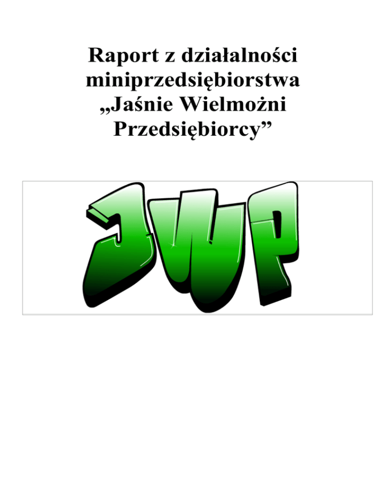 Raport z działalności miniprzedsiębiorstwa „Jaśnie Wielmożni Przedsiębiorcy” 1. Przegląd miniprzedsiębiorstwa Nasza firma nosi nazwę "Jaśnie Wielmożni Przedsiębiorcy". Numer ewidencyjny firmy to: 302-1-9-10-13. Prowadzimy swą działalność w I Liceum Ogólnokształcącym im. Henryka Sienkiewicza w Łańcucie. Naszym opiekunem jest prof. Marta Kaczmarczyk. Historia nadawania nazwy jest bardzo długa, gdyż mieliśmy wiele ciekawych propozycji na nazwę naszej działalności. W naszej grupie było dużo sporów spowodowanych nazewnictwem naszej nowej firmy, każdy wspólnik miał inną propozycję nazwy. Jedni chcieli, aby mówiła ona wprost co zamierzamy produkować i sprzedawać, natomiast drudzy chcieli nazwę bardziej tajemniczą, mającą ukryty sens. Po długich negocjacjach i dyskusjach zwyciężyła druga koncepcja. Wybraliśmy nazwę, która podkreśla naszą powagę i chęć do odnoszenia sukcesów na rynku tekstylno-odzieżowym . Nasza firma nosi również skrótową nazwę "JWP". Przed rozpoczęciem działalności postanowiliśmy zebrać kapitał początkowy, aby móc zakupić potrzebne produkty i materiały niezbędne do produkcji naszych wyrobów odzieżowych. Wspólnie ustaliliśmy że najbardziej optymalną stawką będzie składka po 10 zł od każdego uczestnika naszego projektu, aby nasz wspólny kapitał założycielski wyniósł 90 zł. Dyrektor finansowy obliczył, że za te pieniądze można kupić wszystkie potrzebne produkty potrzebne do rozpoczęcia produkcji. Okazało się, że wystarczyło pieniędzy na pierwszą turę produkcji odzieży, organizację stanowiska oraz na promocję naszej firmy za pomocą ciekawych reklam. Pomysł na naszą firmę narodził się po długiej analizie rynku oraz działającej konkurencji, wybór był bardzo trudny lecz doszliśmy do wniosku że bez ryzyka żadne szanujące się przedsiębiorstwo nic nie osiągnie. Jako młodzi ludzie, wiemy, że niejednokrotnie nie możemy dostać w sklepie interesującej nas odzieży, dlatego wyszliśmy naprzeciw wymaganiom naszych kolegów i koleżanek. Początkowo każdy z członków naszej mini-firmy miał nieco inny koncept na dalszy rozwój firmy lecz dzięki naszemu przedsiębiorczemu dyrektorowi doszliśmy do zgody łącząc siły. 2. Produkt/usługa oraz proces produkcji Przedmiotem naszej działalności jest sprzedaż koszulek z kieszonkami (tzw. pocket tee’s), koszulek z ciekawymi nadrukami oraz krawatów w zabawne oraz poważne wzory na każdą okazję. W naszej ofercie znajdują się różnego rodzaju koszulki zarówno białe jak i kolorowe z nowoczesnymi napisami i sloganami, które cieszą się popularnością wśród młodzieży. Każdy produkt jest wykonany z bardzo dobrego gatunkowo materiału co może potwierdzić że staramy się trafić w gusta naszych konsumentów. Koszulki jak już wcześniej zostało wspomnienie nabyliśmy drogą bardzo korzystnego interesu w jednym z internetowych sklepów, który wietrzył magazyny przed nadchodząca nową kolekcją. Dokonując tam zakupu udało nam zaoszczędzić część pieniędzy na dalszą pracę z odzieżą. Do tej pory zrealizowaliśmy 3 zamówienia na koszulki, na które z początku nie było klientów, jednakowoż po wzmocnionej reklamie rozeszły się dosyć szybko. Wyrób nadruków na T-shirtach odbywał się w pomieszczeniu specjalnie przygotowanym do malowania. Został on wykonany ze specjalnych farb akrylowych, które służą do malowania po płótnach. Zostały one wypróbowane i nie mieliśmy do nich żadnych zastrzeżeń - koszulki prezentowały się wspaniale. Sprzedaż produktu odbywała się na szkolnym holu, gdzie przygotowaliśmy nasze stanowisko. Każdy miał swobodny dostęp do niego, poza tym był widoczny z daleka dzięki dużemu plakatowi, który rzucał się w oczy. Cena została ustalona na podstawie wyliczeń ceny jaką włożyliśmy w jej produkcję z niewielką nadwyżką. Dodatkowo oferujemy fachowe wiązanie krawatów, dając możliwość wyboru naszym kupcom wybrania dla siebie odpowiedniego dla niego typu. Przez cały okres trwania naszej firmy odbywały się liczne spotkania członkowskie, gdzie wszyscy razem doszkalaliśmy się w technikach produkcji i dystrybucji. Nasze produkty: 3. Rynek i działania marketingowe Od samego początku reklamą naszych produktów zajął się dyrektor od spraw marketingu Daniel Pawlak, który po głębokiej analizie sposobów na dotarcie do klienta doszedł do wniosku, że najlepszym sposobem dotarcia do konsumenta jest ogłoszenie tego przez nasz szkolny radiowęzeł. Okazało się to trafionym pomysłem, jednakowoż w dalszym ciągu potrzebowaliśmy rozprzestrzenienia naszej działalności. Zastosowaliśmy również możliwość rozwieszenia plakatów w miejscach wzmożonego ruchu, gdzie przykuwając uwagę zwróciliśmy na siebie zarówno uczniów jak i nauczycieli. Współpracując z naszą konkurencją utworzyliśmy specjalną przymierzalnię na nasze produkty, gdzie każdy chętny może dopasować ubranie do swojego rozmiaru. 4. Finanse miniprzedsiębiorstwa SPRAWOZDANIE FINANSOWE ZA OKRES Od 01-11-2013 do 28-02-2014 L.P. 1. INFORMACJE Przychody wg PKPiR - w tym darowizny WARTOŚĆ [zł] 36.58 0.00 2. Koszty wg PKPiR 46.72 3. Dochód (przychody - koszty) -10.14 4. Składki na ubezpieczenia społeczne 25.74 5. Dochód po odliczeniach -35.88 6. Podstawa opodatkowania 0 7. Podatek dochodowy 19% 0 8. Odliczenie od podatku: ubezpieczenie zdrowotne narastająco - 7,75% podstawy wymiaru składki 0 9. Należny podatek 0 10. Zysk netto (nadwyżka finansowa) Rentowność kapitału własnego (ROE) to -0.39867%. -35.88 Jak można zauważyć, nie wykorzystaliśmy całego kapitału. Pieniądze te chcemy przeznaczyć na dodatkowe reklamy, aby zachęcić ludzi do kupowania naszych produktów. Rozważamy możliwość wystawienia naszych produktów na internetowych platformach handlowych, umożliwiających przeprowadzenie transakcji. Wiążą się z tym koszty,