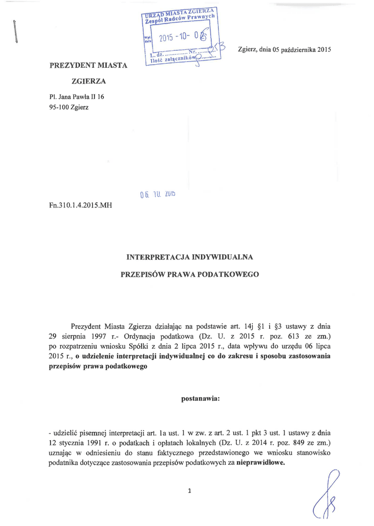 Zgierz, dnia 05 października 2015 ZGIERZA PI. Jana Pawła II 16 95-100 Zgierz 06. m zuo Fn.310.1.4.2015.MH INTERPRETACJA INDYWIDUALNA PRZEPISÓW PRAWA PODATKOWEGO Prezydent Miasta Zgierza działając na podstawie art. 14j §1 i §3 ustawy z dnia 29 sierpnia 1997 r.- Ordynacja podatkowa (Dz. U. z 2015 r. poz. 613 ze zm.) po rozpatrzeniu wniosku Spółki z dnia 2 lipca 2015 r., data wpływu do urzędu 06 lipca 2015 r., o udzielenie interpretacji indywidualnej co do zakresu i sposobu zastosowania przepisów prawa podatkowego postanawia: - udzielić pisemnej interpretacji art. la ust. 1 w zw. z art. 2 ust. 1 pkt 3 ust. 1 ustawy z dnia 12 stycznia 1991 r. o podatkach i opłatach lokalnych (Dz. U. z 2014 r. poz. 849 ze zm.) uznając w odniesieniu do stanu faktycznego przedstawionego we wniosku stanowisko podatnika dotyczące zastosowania przepisów podatkowych za nieprawidłowe. 1 UZASADNIENIE Zgodnie z art. 14j ustawy Ordynacja podatkowa interpretacje indywidualne co do zakresu i sposobu zastosowania prawa podatkowego stosownie do swojej właściwości wydaje wójt, burmistrz (prezydent miasta), starosta lub marszałek województwa. Interpretacje są wydawane w indywidualnych sprawach podatników, jeżeli elementy stanu faktycznego objęte wnioskiem o wydanie interpretacji w dniu złożenia wniosku nie są przedmiotem toczącego się postępowania podatkowego, kontroli podatkowej, postępowania kontrolnego organu kontroli skarbowej oraz że w tym zakresie sprawa nie została rozstrzygnięta co do jej istoty w decyzji lub postanowieniu organu podatkowego lub organu kontroli skarbowej. Stan faktyczny przedstawiony przez podatnika: Podatnik jest właścicielem nieruchomości gruntowej położonej w Zgierzu przy ulicy stanowiącej działkę nr na której posadowiona została hala namiotowa. Podłoże pod szkielet konstrukcyjny hali namiotowej stanowią płyty betonowe ułożone po obwodzie hali, natomiast część użytkowa wyłożona jest kostką brukową. Powierzchnia zabudowy wynosi 1400 m2, powierzchnia użytkowa 1398 m2, kubatura 11200,30 m2. Słupy konstrukcyjne hali mocowane są do płyt betonowych za pomocą kotew mechanicznych (stalowych szpil) za pośrednictwem blach stopowych. Obiekt przykryty jest płaszczem PVC. Poszycie układane jest na konstrukcji metalowej i naciągane za pomocą systemu belek stalowych i linek naciągowych. Ściany boczne są wykonane z PCV. Hala jest wyposażona w instalację oświetleniową podwieszaną do konstrukcji nośnej obiektu. Namiot służy do składowania wyrobów gotowych pochodzących z własnej produkcji. Pytanie podatnika: 1. Czy opisana powyżej hala namiotowa posadzona na nieruchomości wnioskodawcy, niebędąca budynkiem w rozumieniu art. 3 pkt 2 ustawy z dnia 7 lipca 994 r. Prawo budowlane, stanowi budowlę w rozumieniu przepisu art. la ust. 1 pkt 2 ustawy z dnia 12 stycznia 1991 r. o podatkach i opłatach lokalnych? 2. W przypadku pozytywnej odpowiedzi na pytanie 1, czy na wnioskodawcy ciąży obowiązek podatkowy w zakresie podatku od nieruchomości wynikający z przepisów art. 2 ust. 1 pkt 3 w zw. z art. 3 ust. 1 ustawy z dnia 12 stycznia 1991 r. o podatkach i opłatach lokalnych w stosunku do opisanej wyżej hali namiotowej? 2 Stanowisko podatnika: W ocenie Spółki opisana wyżej hala namiotowa nie stanowi budowli w rozumieniu przepisu art. la ust. 1 pkt 2 ustawy z dnia 12 stycznia 1991 r. o podatkach i opłatach lokalnych, ponieważ ma ona charakter tymczasowego obiektu budowlanego, o którym mowa w art. 3 pkt 5 ustawy z dnia 7 lipca 1994 r. - Prawo budowlane. Ocena prawna stanowiska podatnika: Zgodnie z art. 2 ust. 1 ustawy z dnia 12 stycznia 1991 r. o podatkach i opłatach lokalnych (Dz. U. z 2014 r. poz. 849 ze zm.) opodatkowaniu podatkiem od nieruchomości podlegają następujące nieruchomości lub obiekty budowlane: 1) grunty; 2) budynki lub ich części; 3) budowle lub ich części związane z prowadzeniem działalności gospodarczej. Opodatkowaniu podatkiem od nieruchomości podlegają budowle lub ich części związane z prowadzeniem działalności gospodarczej, a więc będące w posiadaniu przedsiębiorcy lub innego podmiotu prowadzącego działalność gospodarczą (art. 2 ust. 1 pkt 3 w związku z art. la ust. 1 pkt 3 ustawy z dnia 12 stycznia 1991 r. o podatkach i opłatach lokalnych). Zgodnie z art. la. ust. 1 pkt 2 ww. ustawy pojęcie budowli oznacza obiekt budowlany w rozumieniu przepisów prawa budowlanego niebędący budynkiem lub obiektem małej architektury, a także urządzenie budowlane w rozumieniu przepisów prawa budowlanego związane z obiektem budowlanym, które zapewnia możliwość użytkowania obiektu zgodnie z jego przeznaczeniem. Zgodnie z art. 3 pkt. 1 ustawy z dnia 7 lipca 1994 r. Prawo budowlane (Dz. U. z 2013 r. poz. 1409 ze zm.) jako obiekt budowlany należy rozumieć budynek, budowlę bądź obiekt małej architektury, wraz z instalacjami zapewniającymi możliwość użytkowania obiektu zgodnie z jego przeznaczeniem, wzniesiony z użyciem wyrobów budowlanych. Z powyższego wynika, iż jako budowlę w rozumieniu przepisów ustawy o podatkach i opłatach lokalnych należy rozumieć budowlę w rozumieniu prawa budowlanego oraz urządzenie budowlane związane z obiektem budowlanym, które zapewnia możliwość użytkowania obiektu zgodnie z jego przeznaczeniem. Zgodnie z art. 3 pkt. 3 ustawy Prawo budowlane budowlą jest każdy obiekt budowlany niebędący budynkiem lub obiektem małej architektury, jak: obiekty liniowe, lotniska, mosty, wiadukty, estakady, tunele, przepusty, sieci techniczne, wolno stojące maszty antenowe, wolno stojące trwale związane z gruntem tablice reklamowe i urządzenia reklamowe, budowle ziemne, obronne (fortyfikacje), ochronne, hydrotechniczne, zbiorniki, wolno stojące instalacje przemysłowe lub urządzenia techniczne, oczyszczalnie ścieków, składowiska odpadów, stacje uzdatniania wody, konstrukcje oporowe, nadziemne i podziemne przejścia 3 dla pieszych, sieci u