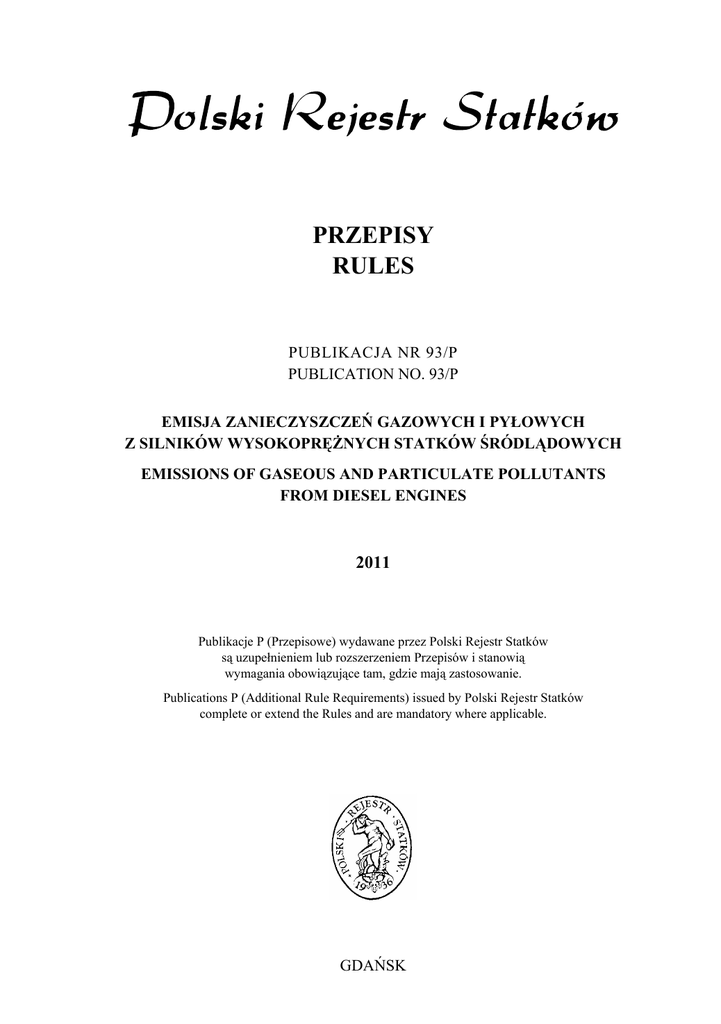 PRZEPISY RULES PUBLIKACJA NR 93/P PUBLICATION NO. 93/P EMISJA ZANIECZYSZCZEŃ GAZOWYCH I PYŁOWYCH Z SILNIKÓW WYSOKOPRĘŻNYCH STATKÓW ŚRÓDLĄDOWYCH EMISSIONS OF GASEOUS AND PARTICULATE POLLUTANTS FROM DIESEL ENGINES 2011 Publikacje P (Przepisowe) wydawane przez Polski Rejestr Statków są uzupełnieniem lub rozszerzeniem Przepisów i stanowią wymagania obowiązujące tam, gdzie mają zastosowanie. Publications P (Additional Rule Requirements) issued by Polski Rejestr Statków complete or extend the Rules and are mandatory where applicable. GDAŃSK PRZEPISY RULES PUBLIKACJA NR 93/P PUBLICATION NO. 93/P EMISJA ZANIECZYSZCZEŃ GAZOWYCH I PYŁOWYCH Z SILNIKÓW WYSOKOPRĘŻNYCH STATKÓW ŚRÓDLĄDOWYCH EMISSIONS OF GASEOUS AND PARTICULATE POLLUTANTS FROM DIESEL ENGINES 2011 GDAŃSK Publikacja Nr 93/P – Emisja zanieczyszczeń gazowych i pyłowych z silników wysokoprężnych statków śródlądowych – 2011, została zatwierdzona przez Zarząd PRS S.A. w dniu 29 czerwca 2011 r. i wchodzi w życie z dniem 1 lipca 2011 r. Publication No. 93/P – Emissions of Gaseous and Particulate Pollutants from Diesel Engines – 2011 was approved by PRS Executive Board on 29 June 2011 and enters into force on 1 July 2011. © Copyright by Polski Rejestr Statków S.A., 2011 PRS/AW, 07/2011 SPIS TREŚCI str. WSTĘP ............................................................................................................................. 5 1 Postanowienia ogólne ................................................................................................. 1.1 Zastosowanie ...................................................................................................... 1.2 Definicje .............................................................................................................. 5 5 5 2 Wymagania ogólne ..................................................................................................... 6 3 Uznanie typu ............................................................................................................... 7 4 Próba po zainstalowaniu oraz próby okresowe i doraźne ...................................... 8 5 Zastosowanie silnika objęte odpowiednim uznaniem typu ..................................... 5.1 Wprowadzenie .................................................................................................... 5.2 Odpowiednie uznanie typu ................................................................................. 9 9 9 6 Załączniki: .................................................................................................................. 6.1 Protokół parametrów silnika ................................................................................ 6.2 Załącznik do Protokołu parametrów silnika ........................................................ 6.3 Pole 52 ze Świadectwa wspólnotowego .............................................................. 11 11 13 15 CONTENTS page INTRODUCTION ........................................................................................................... 19 1 General ........................................................................................................................ Błąd! Nie zdefiniowano zakładki. 1.1 Application .......................................................................................................... Błąd! Nie zdefiniowano zakładki. 1.2 Definitions ........................................................................................................... 19 2 General ........................................................................................................................ 20 3 Recognised Type Approvals ...................................................................................... 21 4 Installation Test and Intermediate and Special Test............................................... 22 5 Engine Application covered by Appropriate Type Approval................................. 23 5.1 Introduction.......................................................................................................... 23 5.2 Appropriate Type Approval................................................................................. 23 6 Appendices:................................................................................................................. 6.1 Engine Parameter Protocol .................................................................................. 6.2 Annex to Engine Parameter Protocol................................................................... 6.3 Item 52 of Community Certificate ....................................................................... 25 25 27 29 WSTĘP 1. Niniejsza Publikacja została opracowana w oparciu o Dyrektywę Komisji Europejskiej 2009/46/WE z dnia 24 kwietnia 2009 roku oraz Dyrektywę 97/68/WE Parlamentu Europejskiego i Rady z dnia 16 grudnia 1997 ze zmianami wprowadzonymi Dyrektywą 2010/26/WE, dla instalacji silników spalinowych zainstalowanych na statkach żeglugi śródlądowej lub w urządzeniach znajdujących się na takich statkach. 2. Celem niniejszej Publikacji jest określenie wymagań zapewniających skuteczne ograniczenie emisji zanieczyszczeń gazowych i cząstek stałych zgodnie z wymaganiami Dyrektywy 97/68/WE z późniejszymi zmianami. 1 POSTANOWIENIA OGÓLNE 1.1 Zastosowanie 1.1.1 Niniejsze wymagania mają zastosowanie do każdego silnika o mocy znamionowej większej niż 19 kW zainstalowanego na statku śródlądowym lub w urządzeniu znajdującym się na takim statku. 1.2 Definicje Dla celów niniejszej Publikacji mają zastosowanie następujące definicje: 1.2.1 Silnik – oznacza silnik pracujący na zasadzie zapłonu samoczynnego (silnik wysokoprężny). 1.2.2 Silnik napędowy – oznacza silnik do napędu statku pływającego po śródlądowych drogach wodnych zgodnie z definicją z art. 2 z Dyrektywy 97/68/WE. 1.2.3 Silnik pomocniczy – oznacza silnik do innych