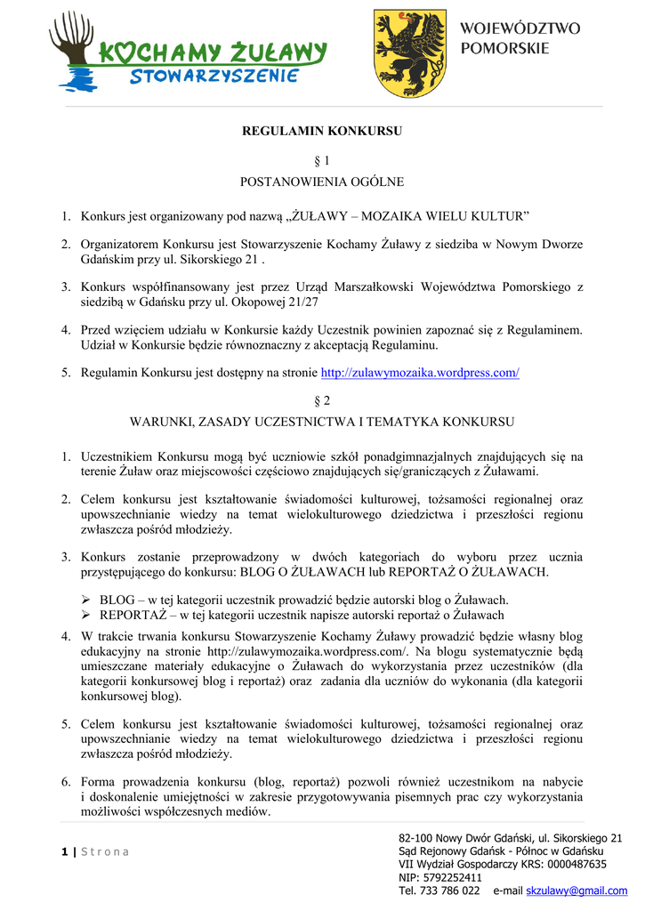 REGULAMIN KONKURSU §1 POSTANOWIENIA OGÓLNE 1. Konkurs jest organizowany pod nazwą „ŻUŁAWY – MOZAIKA WIELU KULTUR” 2. Organizatorem Konkursu jest Stowarzyszenie Kochamy Żuławy z siedziba w Nowym Dworze Gdańskim przy ul. Sikorskiego 21 . 3. Konkurs współfinansowany jest przez Urząd Marszałkowski Województwa Pomorskiego z siedzibą w Gdańsku przy ul. Okopowej 21/27 4. Przed wzięciem udziału w Konkursie każdy Uczestnik powinien zapoznać się z Regulaminem. Udział w Konkursie będzie równoznaczny z akceptacją Regulaminu. 5. Regulamin Konkursu jest dostępny na stronie http://zulawymozaika.wordpress.com/ §2 WARUNKI, ZASADY UCZESTNICTWA I TEMATYKA KONKURSU 1. Uczestnikiem Konkursu mogą być uczniowie szkół ponadgimnazjalnych znajdujących się na terenie Żuław oraz miejscowości częściowo znajdujących się/graniczących z Żuławami. 2. Celem konkursu jest kształtowanie świadomości kulturowej, tożsamości regionalnej oraz upowszechnianie wiedzy na temat wielokulturowego dziedzictwa i przeszłości regionu zwłaszcza pośród młodzieży. 3. Konkurs zostanie przeprowadzony w dwóch kategoriach do wyboru przez ucznia przystępującego do konkursu: BLOG O ŻUŁAWACH lub REPORTAŻ O ŻUŁAWACH. BLOG – w tej kategorii uczestnik prowadzić będzie autorski blog o Żuławach. REPORTAŻ – w tej kategorii uczestnik napisze autorski reportaż o Żuławach 4. W trakcie trwania konkursu Stowarzyszenie Kochamy Żuławy prowadzić będzie własny blog edukacyjny na stronie http://zulawymozaika.wordpress.com/. Na blogu systematycznie będą umieszczane materiały edukacyjne o Żuławach do wykorzystania przez uczestników (dla kategorii konkursowej blog i reportaż) oraz zadania dla uczniów do wykonania (dla kategorii konkursowej blog). 5. Celem konkursu jest kształtowanie świadomości kulturowej, tożsamości regionalnej oraz upowszechnianie wiedzy na temat wielokulturowego dziedzictwa i przeszłości regionu zwłaszcza pośród młodzieży. 6. Forma prowadzenia konkursu (blog, reportaż) pozwoli również uczestnikom na nabycie i doskonalenie umiejętności w zakresie przygotowywania pisemnych prac czy wykorzystania możliwości współczesnych mediów. 1|Strona 82-100 Nowy Dwór Gdański, ul. Sikorskiego 21 Sąd Rejonowy Gdańsk - Północ w Gdańsku VII Wydział Gospodarczy KRS: 0000487635 NIP: 5792252411 Tel. 733 786 022 e-mail [email protected] 7. Praca uczestników konkursu w kategorii BLOG będzie na bieżąco śledzona przez jury oraz sympatyków Stowarzyszenia. 8. Warunkiem uczestnictwa w konkursie jest wypełnienie formularza zgłoszeniowego na stronie bloga prowadzonego przez Stowarzyszenie Kochamy Żuławy http://zulawymozaika.wordpress.com/ w terminie 15 – 30.09.2014 r. Wypełnienie formularza rejestracyjnego nie jest równoznaczne z przyjęciem do konkursu. Osoba zgłaszająca akces do konkursu zostanie poinformowana drogą mailową o przyjęciu zgłoszenia. Następnie Organizator dokona czynności weryfikacyjnych pod kątem możliwości wzięcia udziału w konkursie zgodnie z regulaminem i zasadami po czym prześle drogą mailową informację o przyjęciu do konkursu. §3 OCENA PRAC, ROZSTRZYGNIECIE KONKURSU, NAGRODY 1. Konkurs odbywać się będzie w terminie 01.10 – 09.11.2014 r. 2. W trakcie trwania konkursu powołane zostanie jury, które wyłoni po 3 laureatów (miejsce pierwsze, drugie i trzecie) z każdej kategorii konkursowej. W skład jury wejdą wybrani członkowie Stowarzyszenia Kochamy Żuławy oraz osoba spoza stowarzyszenia zajmująca się tematyką Żuław. Rozstrzygnięcie konkursu/wybór laureatów nastąpi do dnia 20.11.2014 r. 3. Zgłoszenie prac konkursowych (blog/reportaż) do oceny odbywać się będzie poprzez przesłanie adresu bloga lub gotowego reportażu na adres e–mail Stowarzyszenia tj. [email protected]. 4. Adres bloga należy przesłać na wskazany adres w przeciągu 7 dni od zakończenia rejestracji uczestników tj. do dnia 07.10.2014 r. 5. Gotowy reportaż (format DOC oraz PDF) należy przesłać na wskazany adres najpóźniej do dnia 09.11.2014 r. 6. Ocenie jury poddane zostaną wyłącznie prace uczestników, którzy zarejestrowali swój udział w konkursie zgodnie z § 2 ust. 8 niniejszego Regulaminu. 7. Dodatkowo każdy uczestnik konkursu zobowiązany jest przesłać osobno zdjęcia wykorzystane w swojej pracy wraz z opisem (autor, tytuł zdjęcia oraz szkoła) w rozdzielczości 300 dpi. Z wybranych zdjęć przygotowana zostanie wystawa pokonkursowa prezentowana podczas gali wręczenia nagród. 8. Nagrody: a) Kategoria BLOG: 2|Strona 1 miejsce: tablet Lenovo Yoga B600 2 miejsce: czytnik e-book Kiano Booky Light 3 miejsce: odtwarzacz mp3 Speedo Aquabeat b) Kategoria REPORTAŻ: 1 miejsce: aparat fotograficzny Canon PowerShot SX270 HS 2 miejsce: dysk zewnętrzny WD My Passport Ultra 3 miejsce: odtwarzacz mp3 Sony NWZ-B183 c) Szkoła zwycięzcy każdej z kategorii otrzyma zestaw książek o tematyce żuławskiej. 9. Nagrody w Konkursie nie podlegają wymianie na inne nagrody oraz na ekwiwalent pieniężny. 10. Ogłoszenie zwycięzców oraz wręczenie nagród będzie miało miejsce podczas gali połączonej z wykładem autorskim o wielokulturowości Żuław w grudniu bieżącego roku. 11. Zwycięskie reportaże zostaną również opublikowane w 2015 r. w Kwartalniku SpołecznoKulturalnym Dolnego Powiśla i Żuław „Prowincja”. §4 DANE OSOBOWE UCZESTNIKÓW KONKURSU, PRAWA WŁASNOŚCI 1. Dane osobowe uczestników konkursu będą przetwarzane wyłącznie w celach związanych z konkursem, to jest jego organizacją, promocją, przeprowadzaniem oraz publikacją zwycięskich prac. Po zakończeniu konkursu zbiór danych osobowych uczestników zostanie niezwłocznie usunięty. 2. Przystępując do konkursu i akceptując niniejszy regulamin uczestnik wyraża także zgodę na przetwarzanie przez Organizatora danych osobowych do w/w celów. W przypadku osoby niepełnoletniej warunkiem uczestnictwa w konkursie jest uz