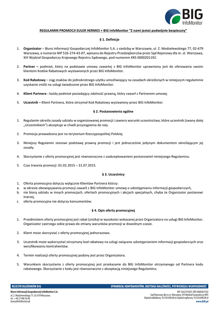 REGULAMIN PROMOCJI EULER HERMES + BIG InfoMonitor “Z nami jesteś podwójnie bezpieczny” § 1. Definicje 1. Organizator – Biuro Informacji Gospodarczej InfoMonitor S.A. z siedzibą w Warszawie, ul. Z. Modzelewskiego 77, 02-679 Warszawa, o numerze NIP 526-274-43-07, wpisana do Rejestru Przedsiębiorców przez Sąd Rejonowy dla m. st. Warszawa, XIII Wydział Gospodarczy Krajowego Rejestru Sądowego, pod numerem KRS 0000201192. 2. Partner – podmiot, który na podstawie umowy zawartej z BIG InfoMonitor uprawniony jest do oferowania swoim klientom Kodów Rabatowych wystawionych przez BIG InfoMonitor. 3. Kod Rabatowy – ciąg znaków do jednokrotnego użytku umożliwiający na zasadach określonych w niniejszym regulaminie uzyskanie zniżki na usługi świadczone przez BIG InfoMonitor. 4. Klient Partnera - każdy podmiot posiadający zdolność prawną, który zawarł z Partnerem umowę. 5. Uczestnik – Klient Partnera, które otrzymał Kod Rabatowy wystawiony przez BIG InfoMonitor. § 2. Postanowienia ogólne 1. Regulamin określa zasady udziału w organizowanej promocji i zawiera warunki uczestnictwa, które uczestnik (zwany dalej „Uczestnikiem”) akceptuje w chwili przystąpienia do niej. 2. Promocja prowadzona jest na terytorium Rzeczypospolitej Polskiej. 3. Niniejszy Regulamin stanowi podstawę prawną promocji i jest jednocześnie jedynym dokumentem określającym jej zasady. 4. Skorzystanie z oferty promocyjnej jest równoznaczne z zaakceptowaniem postanowień niniejszego Regulaminu. 5. Czas trwania promocji: 01.02.2015 – 31.07.2015. § 3. Uczestnicy 1. a. b. c. Oferta promocyjna dotyczy wyłącznie Klientów Partnera którzy: w okresie obowiązywania promocji zawarli z BIG InfoMonitor umowę o udostępnianiu informacji gospodarczych, nie biorą udziału w innych promocjach, ofertach promocyjnych i akcjach specjalnych, chyba że Organizator postanowi inaczej, oferta promocyjna nie dotyczy konsumentów. § 4. Opis oferty promocyjnej 1. Przedmiotem oferty promocyjnej jest rabat (zniżka) w wysokości wskazanej przez Organizatora na usługi BIG InfoMonitor. Organizator zastrzega sobie prawo do zmiany warunków promocji w dowolnym czasie. 2. Klient może skorzystać z oferty promocyjnej jednorazowo. 3. Uczestnik może wykorzystać otrzymany kod rabatowy na usługi związane udostępnianiem informacji gospodarczych oraz weryfikowaniu kontrahentów. 4. Termin realizacji oferty promocyjnej podany jest przez Organizatora. 5. Warunkiem skorzystania z oferty promocyjnej jest przekazanie do BIG InfoMonitor otrzymanego od Partnera kodu rabatowego. Skorzystanie z kodu jest równoznaczne z akceptacją niniejszego Regulaminu. 6. Rabat otrzymany w ramach oferty promocyjnej nie podlega wymianie na ekwiwalent pieniężny, inne usługi bądź świadczenia. Rabaty nie kumulują się. 7. Adres e-mail przeznaczony do kontaktu Uczestników z Organizatorem to: [email protected] § 5. Dane osobowe 1. Organizator informuje, iż jest Administratorem Danych, w zakresie danych osobowych podmiotów zainteresowanych usługami i ofertą Administratora Danych (potencjalni klienci) gromadzonych za pośrednictwem formularza na stronie internetowej www.BIG.pl. Dane potencjalnych klientów gromadzone są dla celów handlowych umożliwiających kontakt przedstawiciela handlowego z osobą zainteresowaną usługą/ofertą na podstawie zgody udzielonej przez potencjalnego klienta zgodnie z art. 23 ust 1 pkt 1 ustawy z dnia 29 sierpnia 1997 r. o ochronie danych osobowych (tekst jedn. Dz. U. z 2014 r. , poz. 1182 , zwana dalej Ustawą). 2. Po uzyskaniu odrębnej zgody dane potencjalnych klientów mogą być wykorzystywane przez Administratora Danych także dla celów marketingowych w tym dla otrzymywania drogą elektroniczną (za pośrednictwem poczty elektronicznej lub telefonu) informacji o charakterze marketingowym zgodnie z ustawą z dnia 18 lipca 2002 r. o świadczeniu usług drogą elektroniczną (tekst jedn. Dz. U z 2013 r., poz. 1422); 3. Bez odrębnej zgody zgromadzone dane osobowe nie będą udostępniane odbiorcom danych w rozumieniu art. 7 pkt 6 Ustawy, z wyjątkiem spółki Biuro Informacji Kredytowej S.A. z siedzibą w Warszawie. Osobom ujawniającym dane osobowe przysługuje prawo dostępu do treści danych oraz możliwość ich poprawiania, a w sytuacji przetwarzania ich danych w celach marketingowych możliwość wniesienia sprzeciwu. Podanie danych jest dobrowolne niemniej jednak bez ich podania nie jest możliwe zrealizowanie określonych powyżej celów. 4. a) b) c) d) Przetwarzanie danych osobowych Uczestników akcji będzie obejmowało: Imię i nazwisko Adres e-mail Numer telefonu Numer Identyfikacji Podatkowej (NIP) § 6. Odpowiedzialność 1. Organizator nie ponosi odpowiedzialności za działania lub zaniechania osób trzecich mające lub mogące mieć wpływ na wykonanie warunków oferty, nadto nie ponosi odpowiedzialności za skutki wynikające z działania siły wyższej awarii telekomunikacyjnych, energetycznych lub innych zdarzeń pozostających poza kontrolą Organizatora. § 7. Postanowienia końcowe 1. Regulamin akcji jest do wglądu na stronie www.BIG.pl 2. Organizator zastrzega sobie prawo do zmiany Regulaminu. 3. W przypadku zmiany Regulaminu: Organizator poinformuje Uczestnika Programu o dokonanej zmianie i umieści ujednolicony tekst Regulaminu na stronie internetowej www.BIG.pl W kwestiach nieuregulowanych w Regulaminie zastosowanie mają przepisy powszechnie obowiązującego polskiego prawa. 4. 5. Wszelkie spory będą rozstrzygane przez sąd powszechny właściwy dla siedziby BIG InfoMonitor.