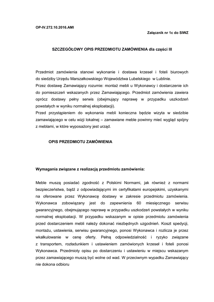 OP-IV.272.10.2016.AMI Załącznik nr 1c do SIWZ SZCZEGÓŁOWY OPIS PRZEDMIOTU ZAMÓWIENIA dla części III Przedmiot zamówienia stanowi wykonanie i dostawa krzeseł i foteli biurowych do siedziby Urzędu Marszałkowskiego Województwa Lubelskiego w Lublinie. Przez dostawę Zamawiający rozumie: montaż mebli u Wykonawcy i dostarczenie ich do pomieszczeń wskazanych przez Zamawiającego. Przedmiot zamówienia zawiera oprócz dostawy pełny serwis (obejmujący naprawę w przypadku uszkodzeń powstałych w wyniku normalnej eksploatacji). Przed przystąpieniem do wykonania mebli konieczna będzie wizyta w siedzibie zamawiającego w celu wizji lokalnej – zamawiane meble powinny mieć wygląd spójny z meblami, w które wyposażony jest urząd. OPIS PRZEDMIOTU ZAMÓWIENIA Wymagania związane z realizacją przedmiotu zamówienia: Meble muszą posiadać zgodność z Polskimi Normami, jak również z normami bezpieczeństwa, bądź z odpowiadającymi im certyfikatami europejskimi, uzyskanymi na oferowane przez Wykonawcę dostawy w zakresie przedmiotu zamówienia. Wykonawca zobowiązany jest do zapewnienia 60 miesięcznego serwisu gwarancyjnego, obejmującego naprawę w przypadku uszkodzeń powstałych w wyniku normalnej eksploatacji. W przypadku wskazanym w opisie przedmiotu zamówienia przed dostarczeniem mebli należy dokonać niezbędnych uzgodnień. Koszt spedycji, montażu, ustawienia, serwisu gwarancyjnego, ponosi Wykonawca i rozlicza je przez wkalkulowanie w cenę oferty. Pełną odpowiedzialność i ryzyko związane z transportem, rozładunkiem i ustawieniem zamówionych krzeseł i foteli ponosi Wykonawca. Przedmioty opisu po dostarczeniu i ustawieniu w miejscu wskazanym przez zamawiającego muszą być wolne od wad. W przeciwnym wypadku Zamawiający nie dokona odbioru 1. Krzesło konferencyjne tapicerowane – 80 szt. Stelaż krzesła metalowy satyna, możliwość układania w stos, nóżki zabezpieczone od spodu antypoślizgowe, wysokość krzesła 800mm, wysokość siedziska 450 mm, wysokość oparcia 340mm-360mm, szerokość siedziska 460mm, głębokość 410mm- 425mm, siedzisko i oparcie miękkie tapicerowane z tyłu wykończone czarnym plastikiem. Tkanina melanż cagli, pod siedziskiem dwie rurki metalowe satynowe stabilizujące siedzisko i nogi. 2. Krzesło biurowe obrotowe.- 30 szt. Z mechanizmem CPT. Wysokie ergonomiczne wyprofilowane oparcie z mechanizmem odciążającym lędźwie zapobiegającym garbieniu się, możliwość blokady kąta odchylenia oparcia w wybranej pozycji, regulacja wysokości oparcia, regulacja głębokości siedziska, szerokie miękkie, tapicerowane siedzisko, regulacja wysokości siedziska za pomocą podnośnika pneumatycznego, na kółkach do powierzchni miękkich, podłokietnik z możliwością regulacji w płaszczyźnie góra, dół. Tkanina melanż cagli. Maksymalne dopuszczalne obciążenie siedziska do 150 kg. Poparte badaniami wytrzymałościowymi i atestem 3. Fotel biurowy obrotowy gabinetowy – 12 szt. wymiary: wysokość krzesła: 520, wysokość podłokietników, 470, szerokie, komfortowe siedzisko i ergonomicznie wyprofilowane oparcie, tapicerowane z obydwu stron. Mechanizm –umożliwiający swobodne kołysanie się, maksymalny kąt wychylenia oparcia wynosi ok. 16°, możliwość blokady siedziska i oparcia w 5 pozycjach, regulacja siły oporu oparcia, Anti-shock, płynna regulacja wysokości krzesła za pomocą podnośnika pneumatycznego, stalowe satynowe podłokietniki miękkie pokryte eco skórą w kolorze fotela, stalowa satynowa podstawa z, samohamowne kółka do powierzchni dywanowych lub do powierzchni twardych, kolor czarny lub kremowy, materiał eco skóra. 4. Krzesła konferencyjne – 16 szt. wymiary krzesła: wysokość krzesła: 520, podłokietniki miękkie pokryte eco skórą, wysokość całkowita: 1020, szerokie, komfortowe siedzisko i ergonomicznie wyprofilowane oparcie, oparcie tapicerowane z obydwu stron. Rama – stalowa –satynowa, chromowana lub malowana proszkowo, kolor czarny lub kremowy, materiał eco skóra 5. Fotel o eleganckim kształcie kubełka – 13 szt., którego linie podkreślono wyrazistymi, precyzyjnymi przeszyciami, dodatkowo akcentującymi styl mebla. Kubełek wykonany jest w technologii pianek wylewanych. Fotel w wersji obrotowej. Model z metalicznym satynowym stelażem, okrągłą bazą oraz tkaniną typu ECO kolor zielony lub szary,(odcień do uzgodnienia) Wymiary: - szerokość całkowita do 670 mm - wysokość całkowita 860 mm - wysokość siedziska 460 mm