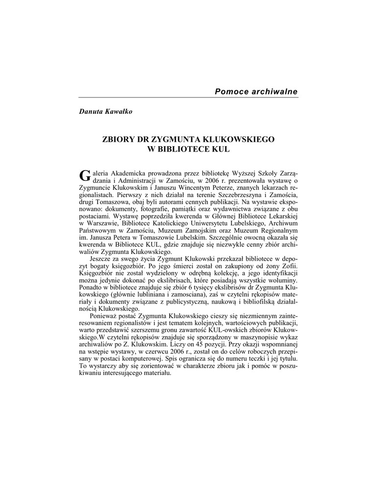 Pomoce archiwalne Danuta Kawałko ZBIORY DR ZYGMUNTA KLUKOWSKIEGO W BIBLIOTECE KUL Akademicka prowadzona przez bibliotekę Wyższej Szkoły ZarząG aleria dzania i Administracji w Zamościu, w 2006 r. prezentowała wystawę o Zygmuncie Klukowskim i Januszu Wincentym Peterze, znanych lekarzach regionalistach. Pierwszy z nich działał na terenie Szczebrzeszyna i Zamościa, drugi Tomaszowa, obaj byli autorami cennych publikacji. Na wystawie eksponowano: dokumenty, fotografie, pamiątki oraz wydawnictwa związane z obu postaciami. Wystawę poprzedziła kwerenda w Głównej Bibliotece Lekarskiej w Warszawie, Bibliotece Katolickiego Uniwersytetu Lubelskiego, Archiwum Państwowym w Zamościu, Muzeum Zamojskim oraz Muzeum Regionalnym im. Janusza Petera w Tomaszowie Lubelskim. Szczególnie owocną okazała się kwerenda w Bibliotece KUL, gdzie znajduje się niezwykle cenny zbiór archiwaliów Zygmunta Klukowskiego. Jeszcze za swego życia Zygmunt Klukowski przekazał bibliotece w depozyt bogaty księgozbiór. Po jego śmierci został on zakupiony od żony Zofii. Księgozbiór nie został wydzielony w odrębną kolekcję, a jego identyfikacji można jedynie dokonać po ekslibrisach, które posiadają wszystkie woluminy. Ponadto w bibliotece znajduje się zbiór 6 tysięcy ekslibrisów dr Zygmunta Klukowskiego (głównie lubliniana i zamosciana), zaś w czytelni rękopisów materiały i dokumenty związane z publicystyczną, naukową i bibliofilską działalnością Klukowskiego. Ponieważ postać Zygmunta Klukowskiego cieszy się niezmiennym zainteresowaniem regionalistów i jest tematem kolejnych, wartościowych publikacji, warto przedstawić szerszemu gronu zawartość KUL-owskich zbiorów Klukowskiego.W czytelni rękopisów znajduje się sporządzony w maszynopisie wykaz archiwaliów po Z. Klukowskim. Liczy on 45 pozycji. Przy okazji wspomnianej na wstępie wystawy, w czerwcu 2006 r., został on do celów roboczych przepisany w postaci komputerowej. Spis ogranicza się do numeru teczki i jej tytulu. To wystarczy aby się zorientować w charakterze zbioru jak i pomóc w poszukiwaniu interesującego materiału. Danuta Kawałko Zbiory dr Zygmunta Klukowskiego Czytelnia rękopisów Biblioteki KUL 808: Materiały i papiery osobiste dr Zygmunta Klukowskiego z lat 1914-1959 809: Materiały i dokumenty z działalności dr Z. Klukowskiego jako bibliofila i bibliografa pamiętników polskich 810: Korespondencja dr Z. Klukowskiego z lat 1925-1961, T.1 811: Korespondencja dr Z. Klukowskiego z lat 1925-1961, T.2 812: Dr Zygmunt Klukowski „Wspomnienia z Zamojszczyzny 1918-1939”, Szczebrzeszyn 1943 (maszynopis i rękopis) 813: „Dziennik” dr Z. Klukowskiego pisany w okresie wojny 1939 oraz okupacji niemieckiej; fragmenty z lat 1945-1953 814: Księga pamiątkowa dr Z. Klukowskiego z licznymi wpisami przyjaciół, znajomych, przedstawicieli nauki, kultury, świata artystycznego, ruchu oporu z lat okupacji, itp. W tekście liczne rysunki i karykatury 815: Materiały dotyczące m. Zamościa i Ordynacji Zamojskiej. Dokumenty, notatki, opisy, wycinki z prasy 816: Dr Zygmunt Klukowski „Służba zdrowia w Ordynacji Zamojskiej do czasu zniesienia pańszczyzny” 817: Brulion rozprawy dr Zygmunta Klukowskiego „Organizacja pomocy lekarskiej dla włościan Ordynacji Nieświeskiej książąt Radziwiłłów w pierwszej połowie XIX w.” oraz materiały źródłowe do tej rozprawy wynotowane z archiwum nieświeskiego 818: Materiały zebrane przez dr Z. Klukowskiego do jego artykułów z dziejów medycyny w Polsce 819: Materiały odnoszące się do m. Szczebrzeszyna. Notatki historyczne, wycinki z gazet, rozprawy o Szczebrzeszynie z okresu okupacji (1939-1944) 820: Materiały do dziejów szkół w Szczebrzeszynie w latach 1811-1937 zebrane przez dr Z. Klukowskiego z Archiwum Ministerstwa Wyznań Religijnych i Oświecenia Publicznego w Warszawie, Archiwum Państwowego w Lublinie i innych 821: Notatki dotyczące historii szpitala w Szczebrzeszynie oraz papiery dotyczące pracy w szpitalu w latach 1929-1949 za ordynacji dr Z. Klukowskiego 822: Papiery dotyczące dr Z. Klukowskiego jako lekarza w Szczebrzeszynie. Druki reklamowe lekarskie, pisma w różnych sprawach dotyczące problematyki lekarskiej 823: Materiały zebrane przez dr Z. Klukowskiego dotyczące udziału polskich lekarzy w powstaniu styczniowym. Notatki, bruliony i maszynopisy rozpraw, odbitki artykułów, wycinki prasowe 824: Dr Zygmunt Klukowski „Zbrodnie niemieckie w Zamojszczyźnie”. Rozprawa 825: Dr Z. Klukowski jako badacz zbrodni niemieckich w Zamojszczyźnie, świadek w procesie norymberskim i oświęcimskim 826: Materiały zebrane przez dr Z. Klukowskiego do opracowania historii powiatu zamojskiego w czasie okupacji niemieckiej 827: Dr Zygmunt Klukowski „Powiat zamojski za rządów niemieckich 1939-1944. Zarys dziejów, kronika wydarzeń, wykaz ofiar” 134 Zbiory dr Zygmunta Klukowskiego… 828: Zofia Klimczuk: Ze wspomnień siostry zakonnej byłego klasztoru prawosławnego w Radecznicy (1904-1919) 829: Pamiętniki Kazimierza Łukaszewicza, lekarza wojsk polskich w czasie powstania listopadowego, doprowadzony do r. 1835 830: Materiały dotyczące „Teki Zamojskiej” 831: Jan Kuna: „Zamość w księgach radzieckich w 2 poł. XVII w.” Lublin 1937 praca magisterska na KUL 832: „Pieśni od pługa” Marcina Sowy z Sułowca (wiersze) 833: Wincenty Dawid „Notatki z życia”, 1887 834: Wycinki prasowe z artykułami o dr Z. Klukowskim i jego książkach 835: Rozkazy, sprawozdania, instrukcje dotyczące organizacji i działalności oddziałów Armii Krajowej w obwodzie Biłgoraj 836: Materiały dotyczące różnych spraw personalnych oddziałów AK na Zamojszczyźnie w latach 1943-1944. Nominacje, awanse, nagany, odznaczenia 837: Wykazy i spisy ewidencyjne poszczególnych oddziałów AK, działających na Zamojszczyźnie, listy, zapomogi, spisy aresztowanych i poległych. Ewidencja kompanii „Norberta” 838: Materiały dotyczące sp