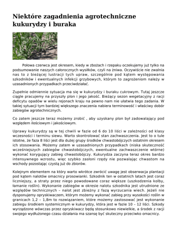 Niektóre zagadnienia agrotechniczne kukurydzy i buraka Połowa czerwca jest okresem, kiedy w zbożach i rzepaku oczekujemy już tylko na podsumowanie naszych całorocznych wysiłków, czyli na żniwa. Oczywiście nie zwalnia nas to z bieżącej lustracji tych upraw, szczególnie pod kątem występowania szkodników i ewentualnych infekcji grzybowych, którym to zagrożeniom należy w uzasadnionych przypadkach przeciwdziałać. Zupełnie odmiennie sytuacja ma się w kukurydzy i buraku cukrowym. Tutaj jeszcze ciągle pracujemy na przyszły plon i jego jakość. Bieżący sezon wegetacyjny z racji deficytu opadów w wielu rejonach kraju na pewno nam nie ułatwia tego zadania. W takiej sytuacji tym bardziej większego znaczenia nabiera terminowość i właściwy dobór zabiegów agrotechnicznych. Co zatem jeszcze teraz możemy zrobić , aby uzyskany plon był zadowalający pod względem ilościowym i jakościowym. Uprawy kukurydzy są w tej chwili w fazie od 6 do 10 liści w zależności od klasy wczesności i terminu siewu. Warto skontrolować stan zachwaszczenia. Jest to o tule istotne, że faza 8 liści jest dla dużej grupy środków chwastobójczych ostatnim okresem ich stosowania. Możemy zatem w uzasadnionych przypadkach (niska skuteczność wcześniejszych zabiegów chwastobójczych, ewentualne zachwaszczenie wtórne) wykonać korygujący zabieg chwastobójczy. Kukurydza zaczyna teraz okres bardzo intensywnego wzrostu, więc szybko zasłoni rzędy nie pozwalając chwastom na wschody pozostając czystą już do zbiorów. Kolejnym elementem na który warto wkrótce zwrócić uwagę jest obserwacja plantacji pod kątem nalotów omacnicy prosowianki. Szkodnik ten w ostatnich latach jest coraz liczniejszy, a straty przez niego powodowane coraz większe (uszkodzenia kolby, łamanie roślin). Wykonanie zabiegów w okresie nalotu szkodnika jest utrudnione ze względów technicznych – nalot jest zbieżny z fazą wyrzucania wiech. Jeżeli nie dysponujemy opryskiwaczem, którym możemy wykonać zabieg przy wysokości roślin w granicach 1,2 – 1,8m to rozwiązaniem, które możemy zastosować jest wykonanie zabiegu środkiem systemicznym w kukurydzy, która jest w fazie 10 – 12 liści. Szkody wyrządzone wówczas przez opryskiwacz będą stosunkowo niewielkie, a środek z racji swojego wydłużonego czasu działania ma szansę być skuteczny przeciwko omacnicy. W zakresie nawożenia obecna faza rozwojowa pozwala już tylko na ewentualną korektę tego co zrobiliśmy wcześniej. Fazą 8 liścia, zaczyna się okres intensywnego wzrostu kukurydzy. Co możemy zatem zrobić aby roślinę najlepiej do tego okresu przygotować. Warto podać dolistnie makroelementy najlepiej w zrównoważonej postaci np. Maximus 20-20-20 w dawce 4 – 5kg/ha. Zabieg taki zintensyfikuje start fotosyntezy typu C4 co przełoży się na przyspieszenie procesów wzrostu i rozwoju roślin, a stąd już prosta droga do wysokich plonów. Oczywiście nie samymi makroelementami roślina żyje. Reakcja kukurydzy na stres suszy Fot. M. Bachorowicz Koniecznym z punktu widzenia właściwego odżywienia roślin jest podawanie mikroelementów. Kluczowymi dla kukurydzy są cynk i bor. Cynk powinien być podawany już od fazy 3 liścia ponieważ jest składnikiem, który odgrywa istotna rolą w tworzeniu podstawowych hormonów wzrostu roślin – auksyn. Odpowiadają one zarówno za wzrost części nadziemnej rośliny, ale co również istotne za wzrost i rozwój korzenia. W warunkach deficytu wody to właśnie rozwój korzenia ma decydujące znaczenie w powodzeniu uprawy kukurydzy. Bor natomiast , ma znaczenie dla procesów generatywnych czyli związanych bezpośrednio z zawiązywaniem nasion. Jego rola przejawia się w dwóch ważnych procesach tego etapu życia rośliny. Pierwszym jest poprawa żywotności pyłku (przy udziale molibdenu). Jak wiemy kukurydza jest rośliną w której kwiat męski z pylnikami (wiecha) znajduje sią na szczycie rośliny, zaś kwiat żeński (kolba) w połowie jej wysokości. Zatem pyłek ma znaczą drogę do pokonania, a więc jego żywotność ma duże znaczenie w prawidłowym przebiegu procesu zapylania. Drugim etapem jest proces zapłodnienia. Bor odpowiada za proces kiełkowania i wzrostu łagiewki pyłkowej. Słupki kwiatowe wraz ze znamionami tworzą w kukurydzy dość długi organ, włosowaty organ. Zatem aby zapłodnienie kwiatu przebiegło prawidłowo, proces kiełkowania i wzrostu łagiewki pyłkowej również musi przebiegać bez zakłóceń. Jaki to ma znaczenie dla nas jako plantatorów – jakiekolwiek zakłócenia w procesie zapylenie i zapłodnienia powodują, że ze nie wykorzystujemy zbudowanego wcześniej potencjału plonowania, a wizualnym tego dowodem są nie do końca zapełnione kolby, a przede wszystkim „szczerbate” kolby. Zawiązki korzeni podporowych (kukurydza w fazie 8 liści) Fot. M. Bachorowicz Podawanie boru, w przeciwieństwie do cynku, maksymalnie opóźniamy. Optymalnym terminem byłby początek ukazywania się wiech, jednak mając na względzie możliwości techniczne stosujemy go w fazie 10 – 12 liści. Warto tutaj się pokusić o zastosowanie produktu Maxibor 21 w dawce 1 -2 kg/ha, który zawiera 21% boru oraz dodatek molibdenu co korzystnie wpływa na przebieg całego procesu zawiązywania nasion. Natomiast dla ceniących sobie rozwiązania płynne, rozwiązaniem jest Ekolist Mono Bor, który zawiera 150g/l tego składnika (dawka 1 – 2l/ha). Zawiązek kolby pod pochwą liściową (kukurydza w fazie 8 liści) Fot. M. Bachorowicz Zawiązek wiechy kukurydzy (faza 8 liści) Fot. M. Bachorowicz Korzystnym z punktu widzenia odżywienia roślin jest stosowanie mieszanin mikroelementowych. Działanie takie zabezpiecza nam rośliny przed wystąpieniem niedoborów, a tym samym ewentualną obniżką plonu. Jest to o tyle ważne, iż w przypadku niedoborów wielu mikroelementów nie ma wyraźnych objawów na roślinie (zwłaszcza jeżeli są to niedobory ukryte), 