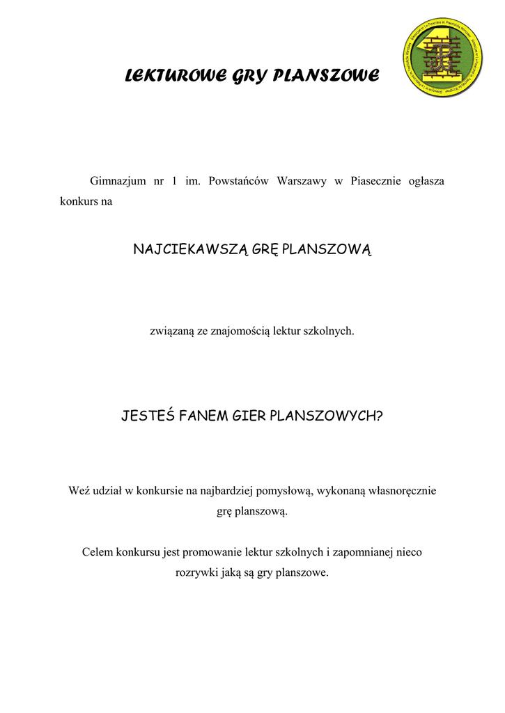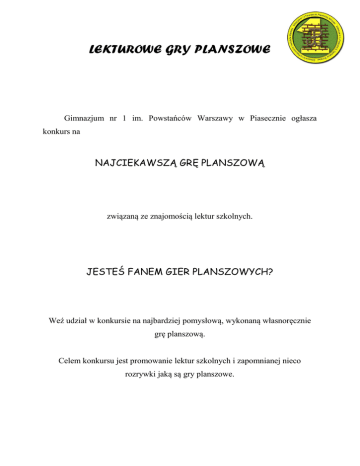 LEKTUROWE GRY PLANSZOWE Gimnazjum nr 1 im. Powstańców Warszawy w Piasecznie ogłasza konkurs na NAJCIEKAWSZĄ GRĘ PLANSZOWĄ związaną ze znajomością lektur szkolnych. JESTEŚ FANEM GIER PLANSZOWYCH? Weź udział w konkursie na najbardziej pomysłową, wykonaną własnoręcznie grę planszową. Celem konkursu jest promowanie lektur szkolnych i zapomnianej nieco rozrywki jaką są gry planszowe. REGULAMIN 1. Konkurs skierowany jest do uczniów gimnazjum. 2. Każda gra zgłoszona do udziału w konkursie musi być pracą wykonaną własnoręcznie. 3. Praca konkursowa powinna zawierać elementy charakterystyczne dla gry planszowej: tytuł, instrukcję gry, planszę, pionki i kostki. 4. Tematyka gry ma być związana z wybraną lekturą gimnazjalną. 5. Technika wykonania pracy jest dowolna. 6. Gra planszowa może być tworzona indywidualnie lub w grupach (maksymalnie trzy osoby). 7. Każdy uczestnik lub grupa może wykonać i zgłosić do konkursu tylko jedną grę planszową. 8. Ocenie podlegać będą: pomysł, wartość merytoryczna, staranność wykonania oraz estetyka pracy. 9. Pracę należy podpisać imieniem i nazwiskiem autora / autorów, podać klasę, nazwę, adres szkoły, telefon lub e-mail oraz przesłać wypełnione załączniki. 10. Prace należy składać w Gimnazjum nr 1 im. Powstańców Warszawy w Piasecznie, ul. Sikorskiego 20, do 31 grudnia 2015 roku. 11. Konkurs zostanie rozstrzygnięty do 15 stycznia 2016 roku, jego wyniki ogłoszone na stronie organizatora. 12. Najciekawsze prace zostaną nagrodzone a zwycięzcy poinformowani telefonicznie lub mailowo. Załączniki: 1. Zgłoszenie do konkursu. 2. Zgoda na przetwarzanie danych osobowych na potrzeby konkursu i wykorzystanie wizerunku uczestnika na stronie internetowej szkoły.