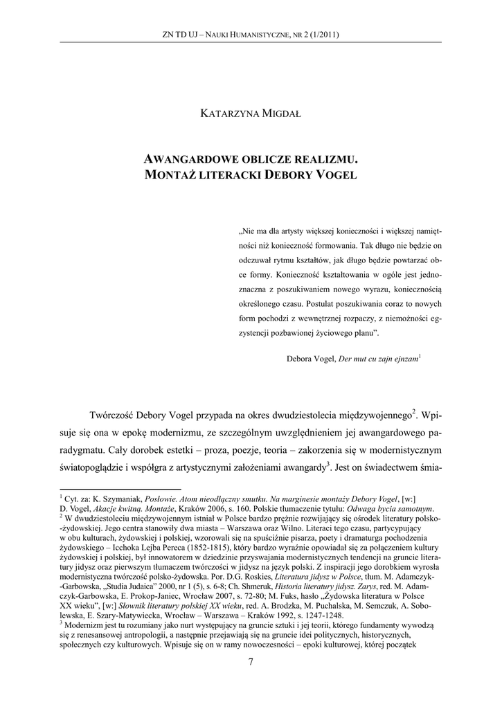 ZN TD UJ – NAUKI HUMANISTYCZNE, NR 2 (1/2011) ______________________________________________________________________________________________________________________________________________________________________________________________________________________________________________________________________________________________________________ KATARZYNA MIGDAŁ AWANGARDOWE OBLICZE REALIZMU. MONTAŻ LITERACKI DEBORY VOGEL „Nie ma dla artysty większej konieczności i większej namiętności niż konieczność formowania. Tak długo nie będzie on odczuwał rytmu kształtów, jak długo będzie powtarzać obce formy. Konieczność kształtowania w ogóle jest jednoznaczna z poszukiwaniem nowego wyrazu, koniecznością określonego czasu. Postulat poszukiwania coraz to nowych form pochodzi z wewnętrznej rozpaczy, z niemożności egzystencji pozbawionej życiowego planu”. Debora Vogel, Der mut cu zajn ejnzam1 Twórczość Debory Vogel przypada na okres dwudziestolecia międzywojennego2. Wpisuje się ona w epokę modernizmu, ze szczególnym uwzględnieniem jej awangardowego paradygmatu. Cały dorobek estetki – proza, poezje, teoria – zakorzenia się w modernistycznym światopoglądzie i współgra z artystycznymi założeniami awangardy3. Jest on świadectwem śmia1 Cyt. za: K. Szymaniak, Posłowie. Atom nieodłączny smutku. Na marginesie montaży Debory Vogel, [w:] D. Vogel, Akacje kwitną. Montaże, Kraków 2006, s. 160. Polskie tłumaczenie tytułu: Odwaga bycia samotnym. 2 W dwudziestoleciu międzywojennym istniał w Polsce bardzo prężnie rozwijający się ośrodek literatury polsko-żydowskiej. Jego centra stanowiły dwa miasta – Warszawa oraz Wilno. Literaci tego czasu, partycypujący w obu kulturach, żydowskiej i polskiej, wzorowali się na spuściźnie pisarza, poety i dramaturga pochodzenia żydowskiego – Icchoka Lejba Pereca (1852-1815), który bardzo wyraźnie opowiadał się za połączeniem kultury żydowskiej i polskiej, był innowatorem w dziedzinie przyswajania modernistycznych tendencji na gruncie literatury jidysz oraz pierwszym tłumaczem twórczości w jidysz na język polski. Z inspiracji jego dorobkiem wyrosła modernistyczna twórczość polsko-żydowska. Por. D.G. Roskies, Literatura jidysz w Polsce, tłum. M. Adamczyk-Garbowska, „Studia Judaica” 2000, nr 1 (5), s. 6-8; Ch. Shmeruk, Historia literatury jidysz. Zarys, red. M. Adamczyk-Garbowska, E. Prokop-Janiec, Wrocław 2007, s. 72-80; M. Fuks, hasło „Żydowska literatura w Polsce XX wieku”, [w:] Słownik literatury polskiej XX wieku, red. A. Brodzka, M. Puchalska, M. Semczuk, A. Sobolewska, E. Szary-Matywiecka, Wrocław – Warszawa – Kraków 1992, s. 1247-1248. 3 Modernizm jest tu rozumiany jako nurt występujący na gruncie sztuki i jej teorii, którego fundamenty wywodzą się z renesansowej antropologii, a następnie przejawiają się na gruncie idei politycznych, historycznych, społecznych czy kulturowych. Wpisuje się on w ramy nowoczesności – epoki kulturowej, której początek 7 KATARZYNA MIGDAŁ – AWANGARDOWE OBLICZE REALIZMU... ______________________________________________________________________________________________________________________________________________________________________________________________________________________________________________________________________________________________________________ łego podążania za „nowością”, wyrazem aprobaty dla cywilizacyjnych przemian oraz dla sztuki, na której odciska się ich piętno4. Pisarka niejednokrotnie poruszała w swych rozprawach teoretyczne zagadnienie modernizmu. Od statusu, jaki nadawała swoim poczynaniom w dziedzinie literatury, zależała jej wizja modernistycznej estetyki. Ponadto, jej rozumienie modernizmu było bliskie rozumieniu wypracowanemu przez nowojorską grupę „Inzich”5. Stworzona przez nią koncepcja wiązała się z „legendą współczesności”, postępującą urbanizacją oraz poszukiwaniem odkrywczej, a zarazem odpowiedniej formy dla – jak się wyrażała – „samego życia”6. Współtworzyła ona modernizm na gruncie literatury polskiej, niemieckiej, jak i jidysz, choć próby te okupywała kondycją pisarki marginesowej i samotnej. Vogel zdawała sobie sprawę z tego, że bycie osobną postacią sceny literackiej wiąże się z dużym wyzwaniem. Organizowała zatem odczyty, publikowała na łamach czasopism w kilku językach – polskim, jidysz, hebrajskim oraz niemieckim – wykładała literaturę jidysz, była autorką licznych jej przekładów na polski. Chętnie angażowała się w polemiki dotyczące kierunku przemian literackiej sceny dwudziestolecia międzywojennego 7. Za sprawą swojej twórczości kształtowała na łamach czasopisma grupy „Inzich” literacki obraz modernizmu jidysz. Jej poezje oraz montaże doczekały się w środowisku inzichistów bardzo pochlebnych recenzji. Przez Arona Lejelsa była uważana za reprezentantkę „prawdziwie nowego, nowoczesnego i koniec wyznaczają zdaniem Anny Burzyńskiej lata 1650 i 1966. Nowoczesność oznacza szereg zjawisk o charakterze filozoficzno-światopoglądowym, w odróżnieniu od modernizmu jako zespołu zjawisk artystyczno-estetycznych. Por. A. Burzyńska, Anty-teoria literatury, Kraków 2006, s. 109. Także zdaniem Włodzimierza Boleckiego podstawowe znaczenie terminu modernizm dotyczy praktyk estetyczno-artystycznych, podejmujących problematykę współczesności związaną z szeregiem przemian, które dokonały się w społeczeństwach wysokorozwiniętych w XIX wieku, z konsekwencjami w wieku XX. Należą do nich m.in.: rozwój kapitalizmu, industrializacja, rozwój systemów demokratycznych, nauk społecznych i ścisłych. Zob. W. Bolecki, Modernizm w literaturze polskiej XX wieku (rekonesans), „Teksty Drugie” 2002, nr 4, s. 12. 4 Modernistom szczególnie zależało na przekraczaniu historycznie sankcjonowanych granic gatunkowych i rodzajowych, na niekonwencjonalnym użyci