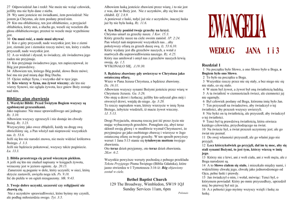 27 Odpowiedział Jan i rzekł: Nie może nic wziąć człowiek, jeźliby mu nie było dane z nieba. 28 Wy sami jesteście mi świadkami, żem powiedział: Nie jestem ja Chrystus, ale żem posłany przed nim. 29 Kto ma oblubienicę, ten jest oblubieniec, a przyjaciel oblubieńca, ktˆry stoi, a słucha go, weseli się weselem dla głosu oblubieńcowego; przetoż to wesele moje wypełnione jest. 30 On musi rość, a mnie musi ubywać. 31 Kto z gˆry przyszedł, nade wszystkie jest; kto z ziemi jest, ziemski jest i ziemskie rzeczy mˆwi; ten, ktˆry z nieba przyszedł, nade wszystkie jest. 32 A co widział i słyszał, to świadczy, ale świadectwa jego żaden nie przyjmuje. 33 Kto przyjmuje świadectwo jego, ten zapieczętował, że Bˆg jest prawdziwy. 34 Albowiem ten, ktˆrego Bˆg posłał, słowo Boże mˆwi; boć mu nie pod miarą daje Bˆg Ducha. 35 Ojciec miłuje Syna, i wszystko dał w ręce jego. 36 Kto wierzy w Syna, ma żywot wieczny; ale kto nie wierzy Synowi, nie ogląda żywota, lecz gniew Boży zostaje nad nim. Biblijny plan zbawienia 1. Werdykt Biblii: Przed Świętym Bogiem wszyscy są zgubionymi grzesznikami. Jako napisano: Nie masz sprawiedliwego ani jednego. Rz. 3.10. Albowiem wszyscy zgrzeszyli i nie dostaje im chwały Bożej. Rz. 3.23. Wszyscyśmy jako owce zbłądzili, każdy na drogę swą obr…ciliśmy się, a Pan włożył nań nieprawość wszystkich nas. Iz. 53.6. Jeźli się kto nie narodzi znowu, nie może widzieć kr…lestwa Bożego. J. 3.3. Jeźli nie będziecie pokutować, wszyscy także poginiecie. Łu. 13.3. 2. Biblia przestrzega cię przed wiecznym piekłem. A jeśli się kto nie znalazł napisany w księgach żywota, wrzucony jest w jezioro ogniste. Ap. 20.15. Zanurzeni są poganie w dole, kt…ry uczynili; w sieci, kt…rą skrycie zastawili, uwięzła noga ich. Ps. 9.18. Iść do piekła w on ogień nieugaszony. Mk. 9:43. 3. Twoje dobre uczynki, szczerość czy religijność nie zbawią cię. Nie z uczynk…w sprawiedliwości, kt…re byśmy my czynili, ale podług miłosierdzia swego. Tyt. 3:5. Albowiem łaską jesteście zbawieni przez wiarę, i to nie jest z was, dar to Boży jest. Nie z uczynk…w, aby się kto nie chlubił. Ef. 2.8,9. A ponieważ z łaski, tedyć już nie z uczynk…w, inaczej łaska już by nie była łaską. Rz. 11.6. 4. Syn Boży poni‡sł twoje grzechy na krzyż. Chrystus umarł za grzechy nasze. 1 Kor. 15:3. Kt…ry grzechy nasze na ciele swoim zani…sł. 1P. 2:24. Pan włożył nań nieprawość wszystkich nas…aby położywszy ofiarą za grzech duszę swą. Iz. 53:6,10. Kt…ry wydany jest dla grzech…w naszych, a wstał z martwych dla usprawiedliwienia naszego. Rz. 4:25. Kt…ry nas umiłował i omył nas z grzech…w naszych krwią swoją. Ap. 1.5. WYKONAŁO SIĘ. J.19:30. 5. Będziesz zbawiony gdy uwierzysz w Chrystusa jako ostateczną ofiarę. Wierz w Pana Jezusa Chrystusa, a będziesz zbawiony. Dz. 16:31. Albowiem wszyscy synami Bożymi jesteście przez wiarę w Chrystusie Jezusie. Ga. 3:26. Oto stoję u drzwi i kołaczę; jeźliby kto usłyszał głos m…j i otworzył drzwi, wnijdę do niego. Ap. 3:20. Te rzeczy napisałem wam, kt…rzy wierzycie w imię Syna Bożego, żebyście wiedzieli, iż macie żywot wieczny. 1J. 5:13. Drogi Przyjacielu, straszną rzeczą jest iść przez życie nie mając wybaczonych grzech…w. Ponaglam cię, abyś teraz skłonił swoją głowę i w modlitwie wyznał Chrystusowi, że przyjmujesz go jako osobistego zbawcę i wierzysz w Jego ostateczną ofierę za twoje grzechy. W ten spos…b powyższy werset 1 Jana 5:13 stanie się tytułowym mottem twojego zbawienia. Oto teraz dzień przyjemny, oto teraz dzień zbawienia. 2Kor. 6:2. Wszystkie powyższe wersety pochodzą z pełnego przekładu Tekstu Przyjętego Pisma Świętego (Biblia Gdańska), kt…re jasno stwierdza w I Tymoteusza 3:16 iż: B€g objawiony został w ciele. Bethel Baptist Church 129 The Broadway, Wimbledon, SW19 1QJ Sunday Services 11am, 6pm Polonais EWANGELIA WEDŁUG JANA 1 i 3 Rozdział 1 1 Na początku było Słowo, a ono Słowo było u Boga, a Bogiem było ono Słowo. 2 To było na początku u Boga. 3 Wszystkie rzeczy przez nie się stały, a bez niego nic się nie stało, co się stało. 4 W niem był żywot, a żywot był oną światłością ludzką. 5 A ta światłość w ciemnościach świeci, ale ciemności jej nie ogarnęły. 6 Był człowiek posłany od Boga, ktˆremu imię było Jan. 7 Ten przyszedł na świadectwo, aby świadczył o tej światłości, aby przezeń wszyscy uwierzyli. 8 Nie byłci on tą światłością, ale przyszedł, aby świadczył o tej światłości. 9 Tenci był tą prawdziwą światłością, ktˆra oświeca każdego człowieka, przychodzącego na świat. 10 Na świecie był, a świat przezeń uczyniony jest; ale go świat nie poznał. 11 Do swej własności przyszedł, ale go właśni jego nie przyjęli. 12 Lecz kt‡rzykolwiek go przyjęli, dał im tę moc, aby się stali synami Bożymi, to jest tym, kt‡rzy wierzą w imię jego. 13 Ktˆrzy nie z krwi, ani z woli ciała, ani z woli męża, ale z Boga narodzeni są. 14 A to Słowo ciałem się stało, i mieszkało między nami, i widzieliśmy chwałę jego, chwałę jako jednorodzonego od Ojca, pełne łaski i prawdy. 15 Jan świadczył o nim, i wołał, m…wiąc: Tenci był, o kt…rymem powiadał: Kt…ry po mnie przyszedłszy, uprzedził mię; bo pierwej był niż ja. 16 A z pełności jego myśmy wszyscy wzięli i łaskę za łaskę. 17 Albowiem zakon przez Mojżesza jest dany, a łaska i prawda przez Jezusa Chrystusa stała się. 18 Boga nikt nigdy nie widział: on jednorodzony syn, ktˆry jest w łonie ojcowskiem, ten nam opowiedział. 19 A toć jest świadectwo Janowe, gdy posłali Żydzi z Jeruzalemu kapłany i Lewity, aby go pytali: Ty ktoś jest? 20 I wyznał, a nie zaprzał, a wyznał, żem ja nie jest Chrystus. 21 I pytali go: Cˆżeś tedy? Elijasześ ty? A on rzekł: Nie jestem. A oni: Prorokiemeś ty? i odpowied