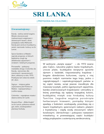 SRI LANKA | PRZYGODA NA CEJLONIE | Gwarantujemy: Kandy – stolica wśród wzgórz. Miasto otoczone jest malowniczymi wzgórzami i dziewiczymi lasami, obok przepływa rzeka Mahaveli. Kandy jest centrum buddyzmu, sztuki, rzemiosła i kultury na Sri Lance. Spice Gardens w Matale – ogrody przypraw, w których będziemy mogli się delektować zapachami i smakami lokalnych przypraw. Pinnawella - położony niedaleko drogi z Colombo do Kandy, sierociniec dla zranionych i opuszczonych słoni, założony w roku 1975. Przebywa tam obecnie około 65 słoni. Sigirya – miejsce gdzie usytuowana jest Forteca w Niebie - najwspanialszy z cudów wyspy Colombo – największe miasto i dawna stolica Sri Lanki. Nuwara Eliya – „Mała Anglia” na Sri Lance, położona wśród gór, dolin, wodospadów i plantacji herbaty. W sankrycie „święta wyspa” – do 1972 zwane jako Cejlon, naturalne piękno lasów tropikalnych, urocze plaże, buddyjskie świątynie spowite dymem z kadzideł, niepowtarzalny krajobraz i bogate dziedzictwo kulturowe, czynią z niej pomimo małych rozmiarów tego kraju, jedno z najpiękniejszych i najatrakcyjniejszych państw w tej części świata, wciąż jeszcze nieodkryte dla masowej turystyki, pełne egzotycznych zapachów, bardzo zróżnicowanych krajobrazów i atmosfery w której przenikają się wpływy brytyjskiej kolonii, buddyjskiej mistyki oraz hinduskiej kultury Ta m i l ó w. Ł a g o d n e w z g ó r z a p o r o ś n i ę t e herbacianymi krzewami, pomiędzy którymi spadają z łoskotem wodospady, przenikają się z lasami tropikalnymi, spienionymi rzekami, plażami z krystaliczną i ciepłą wodą otoczonymi rafami koralowymi. Uśmiechnięci i pokojowo nastawieni mieszkańcy, w przeważającej części buddyści witają przybyszów z autentyczną serdecznością.