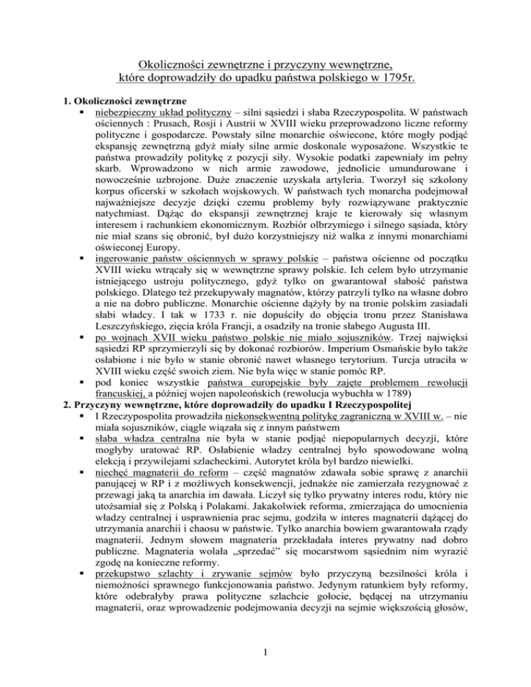 Okoliczności zewnętrzne i przyczyny wewnętrzne, które doprowadziły do upadku państwa polskiego w 1795r. 1. Okoliczności zewnętrzne niebezpieczny układ polityczny – silni sąsiedzi i słaba Rzeczypospolita. W państwach ościennych : Prusach, Rosji i Austrii w XVIII wieku przeprowadzono liczne reformy polityczne i gospodarcze. Powstały silne monarchie oświecone, które mogły podjąć ekspansję zewnętrzną gdyż miały silne armie doskonale wyposażone. Wszystkie te państwa prowadziły politykę z pozycji siły. Wysokie podatki zapewniały im pełny skarb. Wprowadzono w nich armie zawodowe, jednolicie umundurowane i nowocześnie uzbrojone. Duże znaczenie uzyskała artyleria. Tworzył się szkolony korpus oficerski w szkołach wojskowych. W państwach tych monarcha podejmował najważniejsze decyzje dzięki czemu problemy były rozwiązywane praktycznie natychmiast. Dążąc do ekspansji zewnętrznej kraje te kierowały się własnym interesem i rachunkiem ekonomicznym. Rozbiór olbrzymiego i silnego sąsiada, który nie miał szans się obronić, był dużo korzystniejszy niż walka z innymi monarchiami oświeconej Europy. ingerowanie państw ościennych w sprawy polskie – państwa ościenne od początku XVIII wieku wtrącały się w wewnętrzne sprawy polskie. Ich celem było utrzymanie istniejącego ustroju politycznego, gdyż tylko on gwarantował słabość państwa polskiego. Dlatego też przekupywały magnatów, którzy patrzyli tylko na własne dobro a nie na dobro publiczne. Monarchie ościenne dążyły by na tronie polskim zasiadali słabi władcy. I tak w 1733 r. nie dopuściły do objęcia tronu przez Stanisława Leszczyńskiego, zięcia króla Francji, a osadziły na tronie słabego Augusta III. po wojnach XVII wieku państwo polskie nie miało sojuszników. Trzej najwięksi sąsiedzi RP sprzymierzyli się by dokonać rozbiorów. Imperium Osmańskie było także osłabione i nie było w stanie obronić nawet własnego terytorium. Turcja utraciła w XVIII wieku część swoich ziem. Nie była więc w stanie pomóc RP. pod koniec wszystkie państwa europejskie były zajęte problemem rewolucji francuskiej, a później wojen napoleońskich (rewolucja wybuchła w 1789) 2. Przyczyny wewnętrzne, które doprowadziły do upadku I Rzeczypospolitej I Rzeczypospolita prowadziła niekonsekwentną politykę zagraniczną w XVIII w. – nie miała sojuszników, ciągle wiązała się z innym państwem słaba władza centralna nie była w stanie podjąć niepopularnych decyzji, które mogłyby uratować RP. Osłabienie władzy centralnej było spowodowane wolną elekcją i przywilejami szlacheckimi. Autorytet króla był bardzo niewielki. niechęć magnaterii do reform – część magnatów zdawała sobie sprawę z anarchii panującej w RP i z możliwych konsekwencji, jednakże nie zamierzała rezygnować z przewagi jaką ta anarchia im dawała. Liczył się tylko prywatny interes rodu, który nie utożsamiał się z Polską i Polakami. Jakakolwiek reforma, zmierzająca do umocnienia władzy centralnej i usprawnienia prac sejmu, godziła w interes magnaterii dążącej do utrzymania anarchii i chaosu w państwie. Tylko anarchia bowiem gwarantowała rządy magnaterii. Jednym słowem magnateria przekładała interes prywatny nad dobro publiczne. Magnateria wolała „sprzedać” się mocarstwom sąsiednim nim wyrazić zgodę na konieczne reformy. przekupstwo szlachty i zrywanie sejmów było przyczyną bezsilności króla i niemożności sprawnego funkcjonowania państwo. Jedynym ratunkiem były reformy, które odebrałyby prawa polityczne szlachcie gołocie, będącej na utrzymaniu magnaterii, oraz wprowadzenie podejmowania decyzji na sejmie większością głosów, 1 a także zniesienie wolnej elekcji i wprowadzenie dziedziczenia tronu. Na to jednak musiałby zgodzić się sejm zdominowany przez klientów magnackich. upadek gospodarczy również przyczynił się do upadku I RP. Szlachta i magnateria prowadziły błędną politykę gospodarczą. Oparcie polityki na pracy chłopa pańszczyźnianego, który nie miał żadnych perspektyw, prowadziło do obniżenia wydajności pracy. Niechęć przed wszystkim co pochodziło z zewnątrz powodowało, że w państwie polskim stosowano przestarzałe metody uprawy roli. Dlatego też Anglia i Rosja z łatwością przejęły dawne polskie rynki zbytu. Szlachta nie płaciła praktycznie podatków (sama musiała wyrazić zgodę na swoje opodatkowanie) co prowadziło do tego, że skarb państwowy był ciągle pusty. Nie było więc pieniędzy na wprowadzenie nowoczesnej armii pochodzącej z zaciągu i nowocześnie wyposażonej. Silna armia mogła powstrzymać agresorów. Tymczasem Prusy, kilkakrotnie mniejsze od RP dysponowały armią w liczbie 180 tys., podczas gdy państwo polskie mogło liczyć jedynie na 25 tys. 2