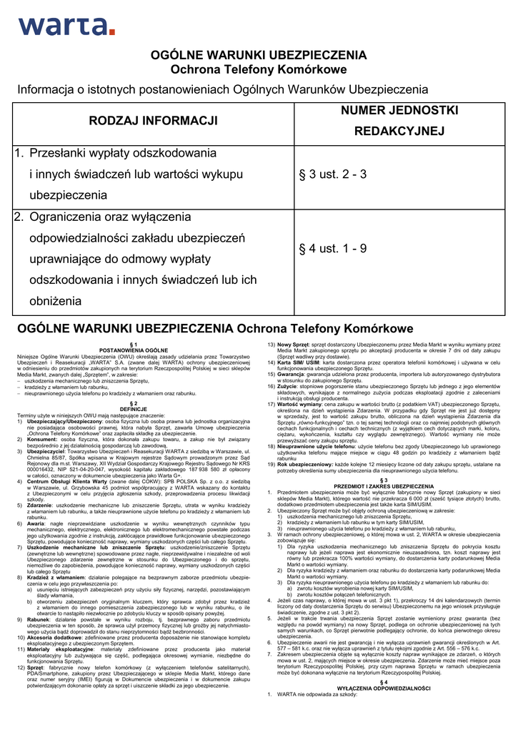 OGÓLNE WARUNKI UBEZPIECZENIA Ochrona Telefony Komórkowe Informacja o istotnych postanowieniach Ogólnych Warunków Ubezpieczenia NUMER JEDNOSTKI RODZAJ INFORMACJI REDAKCYJNEJ 1. Przesłanki wypłaty odszkodowania i innych świadczeń lub wartości wykupu § 3 ust. 2 - 3 ubezpieczenia 2. Ograniczenia oraz wyłączenia odpowiedzialności zakładu ubezpieczeń § 4 ust. 1 - 9 uprawniające do odmowy wypłaty odszkodowania i innych świadczeń lub ich obniżenia OGÓLNE WARUNKI UBEZPIECZENIA Ochrona Telefony Komórkowe §1 POSTANOWIENIA OGÓLNE Niniejsze Ogólne Warunki Ubezpieczenia (OWU) określają zasady udzielania przez Towarzystwo Ubezpieczeń i Reasekuracji „WARTA” S.A. (zwane dalej WARTA) ochrony ubezpieczeniowej w odniesieniu do przedmiotów zakupionych na terytorium Rzeczpospolitej Polskiej w sieci sklepów Media Markt, zwanych dalej „Sprzętem”, w zakresie: uszkodzenia mechanicznego lub zniszczenia Sprzętu, kradzieży z włamaniem lub rabunku, nieuprawnionego użycia telefonu po kradzieży z włamaniem oraz rabunku. §2 DEFINICJE Terminy użyte w niniejszych OWU mają następujące znaczenie: 1) Ubezpieczający/Ubezpieczony: osoba fizyczna lub osoba prawna lub jednostka organizacyjna nie posiadająca osobowości prawnej, która nabyła Sprzęt, zawarła Umowę ubezpieczenia „Ochrona Telefony Komórkowe” oraz zapłaciła składkę za ubezpieczenie. 2) Konsument: osoba fizyczna, która dokonała zakupu towaru, a zakup nie był związany bezpośrednio z jej działalnością gospodarczą lub zawodową, 3) Ubezpieczyciel: Towarzystwo Ubezpieczeń i Reasekuracji WARTA z siedzibą w Warszawie, ul. Chmielna 85/87, Spółka wpisana w Krajowym rejestrze Sądowym prowadzonym przez Sąd Rejonowy dla m.st. Warszawy, XII Wydział Gospodarczy Krajowego Rejestru Sądowego Nr KRS 000016432, NIP 521-04-20-047, wysokość kapitału zakładowego 187 938 580 zł opłacony w całości, oznaczony w dokumencie ubezpieczenia jako Warta G+. 4) Centrum Obsługi Klienta Warty (zwane dalej COKW): SPB POLSKA Sp. z o.o. z siedzibą w Warszawie, ul. Grzybowska 45 podmiot współpracujący z WARTA wskazany do kontaktu z Ubezpieczonymi w celu przyjęcia zgłoszenia szkody, przeprowadzenia procesu likwidacji szkody. 5) Zdarzenie: uszkodzenie mechaniczne lub zniszczenie Sprzętu, utrata w wyniku kradzieży z włamaniem lub rabunku, a także nieuprawnione użycie telefonu po kradzieży z włamaniem lub rabunku. 6) Awaria: nagłe nieprzewidziane uszkodzenie w wyniku wewnętrznych czynników typu mechanicznego, elektrycznego, elektronicznego lub elektromechanicznego powstałe podczas jego użytkowania zgodnie z instrukcją, zakłócające prawidłowe funkcjonowanie ubezpieczonego Sprzętu, powodujące konieczność naprawy, wymiany uszkodzonych części lub całego Sprzętu. 7) Uszkodzenie mechaniczne lub zniszczenie Sprzętu: uszkodzenie/zniszczenie Sprzętu (zewnętrzne lub wewnętrzne) spowodowane przez nagłe, nieprzewidywalne i niezależne od woli Ubezpieczonego zdarzenie zewnętrzne w stosunku do Ubezpieczonego i do sprzętu, niemożliwe do zapobieżenia, powodujące konieczność naprawy, wymiany uszkodzonych części lub całego Sprzętu 8) Kradzież z włamaniem: działanie polegające na bezprawnym zaborze przedmiotu ubezpieczenia w celu jego przywłaszczenia po: a) usunięciu istniejących zabezpieczeń przy użyciu siły fizycznej, narzędzi, pozostawiającym ślady włamania, b) otworzeniu zabezpieczeń oryginalnym kluczem, który sprawca zdobył przez kradzież z włamaniem do innego pomieszczenia zabezpieczonego lub w wyniku rabunku, o ile otwarcie to nastąpiło niezwłocznie po zdobyciu kluczy w sposób opisany powyżej. 9) Rabunek: działanie powstałe w wyniku rozboju, tj. bezprawnego zaboru przedmiotu ubezpieczenia w ten sposób, że sprawca użył przemocy fizycznej lub groźby jej natychmiastowego użycia bądź doprowadził do stanu nieprzytomności bądź bezbronności. 10) Akcesoria dodatkowe: zdefiniowane przez producenta doposażenie nie stanowiące kompletu eksploatacyjnego z ubezpieczonym Sprzętem. 11) Materiały eksploatacyjne: materiały zdefiniowane przez producenta jako materiał eksploatacyjny lub zużywająca się część, podlegająca okresowej wymianie, niezbędne do funkcjonowania Sprzętu. 12) Sprzęt: fabrycznie nowy telefon komórkowy (z wyłączeniem telefonów satelitarnych), PDA/Smartphone, zakupiony przez Ubezpieczającego w sklepie Media Markt, którego dane oraz numer seryjny (IMEI) figurują w Dokumencie ubezpieczenia i w dokumencie zakupu potwierdzającym dokonanie opłaty za sprzęt i uiszczenie składki za jego ubezpieczenie. 13) Nowy Sprzęt: sprzęt dostarczony Ubezpieczonemu przez Media Markt w wyniku wymiany przez Media Markt zakupionego sprzętu po akceptacji producenta w okresie 7 dni od daty zakupu (Sprzęt wadliwy przy dostawie). 14) Karta SIM/ USIM: karta dostarczona przez operatora telefonii komórkowej i używana w celu funkcjonowania ubezpieczonego Sprzętu. 15) Gwarancja: gwarancja udzielona przez producenta, importera lub autoryzowanego dystrybutora w stosunku do zakupionego Sprzętu. 16) Zużycie: stopniowe pogorszenie stanu ubezpieczonego Sprzętu lub jednego z jego elementów składowych, wynikające z normalnego zużycia podczas eksploatacji zgodnie z zaleceniami i instrukcją obsługi producenta. 17) Wartość wymiany: cena zakupu w wartości brutto (z podatkiem VAT) ubezpieczonego Sprzętu, określona na dzień wystąpienia Zdarzenia. W przypadku gdy Sprzęt nie jest już dostępny w sprzedaży, jest to wartość zakupu brutto, obliczona na dzień wystąpienia Zdarzenia dla Sprzętu „równo-funkcyjnego” tzn. o tej samej technologii oraz co najmniej podobnych głównych cechach funkcjonalnych i cechach technicznych (z wyjątkiem cech dotyczących marki, koloru, ciężaru, wykończenia, kształtu czy wyglądu zewnętrznego). Wartość wymiany nie może przewyższać ceny zakupu sprzętu. 18) Nieuprawnione użycie telefonu: użycie