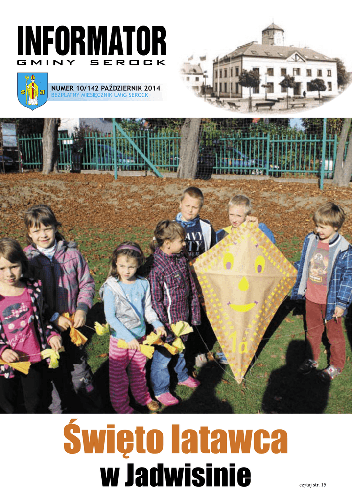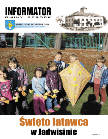 NUMER 10/142 PAŹDZIERNIK 2014 BEZPŁATNY MIESIĘCZNIK UMiG SEROCK Święto latawca w Jadwisinie INFORMATOR MIASTA I GMINY SEROCK 1 czytaj str. 15 Wraz z jesienią w tym roku nadchodzą wybory samorządowe. Jak co cztery lata zagłosujemy na swoich, wybranych kandydatów. Zanim jednak wyruszymy głosować pamiętajmy o zmianach w zasadach dotyczących wyborów samorządowych, jakie wprowadziła ustawa z 5 stycznia 2011 – informacje o zmianach znajdziecie Państwo w numerze. Październik obfitował w wiele ciekawych wydarzeń – w Stanisławowie kolejny już raz główna rolę zagrała dynia podczas Święta Dyni, a w Jadwisinie reaktywowano barwne i wesołe Święto Latawca, świętowali również żołnierze podczas Dnia Łączności i Informatyki w zegrzyńskim centrum a także miłośnicy koni podczas Hubertusa. Na długie jesienne wieczory mamy też dla Państwa ciekawe propozycje Ośrodka Kultury – m.in. zapraszamy do tanga argentyńskiego. W numerze polecamy informacje o gminnych inwestycjach a także o ważnym przedsięwzięciu, jakim jest odbudowa wałów ochronnych na odcinku Łacha-Kania – będzie bezpiecznie! Miło nam poinformować o tym, że Miasto Serock otrzymało honorowy tytuł „Miasto Przyjazne Dużym Rodzinom”. Przed nami nostalgiczny dzień Wszystkich Świętych, życzymy bezpiecznej podróży podczas zarówno tych bliższych jak i dalszych wyjazdów na groby bliskich. Zapraszamy Państwa do wzięcia udziału w Święcie Niepodległości 11 listopada . Życzymy przyjemnej lektury. Redakcja Informacje dla mieszkańców: Referaty przyjmują interesantów i realizują sprawy mieszkańców w godzinach pracy urzędu (pn. 8.00 – 18.00, wt.-pt. 8.00 – 16.00) bez konieczności wcześniejszego umawiania się. Burmistrz Miasta i Gminy Serock, Sylwester Sokolnicki w zagadnieniach wykraczających poza sprawy merytoryczne referatów przyjmuje mieszkańców w poniedziałki, w godz. 12.00 – 15.00 (pokój nr 23). Sprawy nagłe, wymagające interwencji burmistrza poza dniem przyjęcia mieszkańców, prosimy zgłaszać telefonicznie pod nr 22 782 88 05. 2 INFORMATOR MIASTA I GMINY SEROCK W tym samym czasie sugestie związane z tematyką oświatową, kulturalną, ochrony środowiska i pomocy społecznej przyjmuje zastępca burmistrza Józef Zając. Interesanci przyjmowani są w kolejności zgłoszeń, bez konieczności dokonywania wcześniejszych zapisów. Przewodniczący Rady Miejskiej w Serocku Artur Borkowski przyjmuje interesantów w poniedziałki w godz. 18.30 – 20.30 w pokoju 31, tel. 782 88 13; 782 88 00; e-mail. [email protected] W NUMERZE Aktualności ................................................... 4 Inwestycje gminne ........................................ 5 Kładka jak malowana ................................... 5 Informacja w sprawie odbudowy zapory bocznej na odcinku Łacha - Kania ............. 6 Podpisaliśmy kolejną umowę o dofinansowanie realizacji projektu ze środków UE .............................................. 6 Prace z azbestem zakończone ..................... 7 Zauważ PROW wokół siebie - program w pigułce, pieniądze w rzeczywistości ....... 8 Darmowy Internet w Jadwisinie ................. 8 Wybory samorządowe 16 listopada 2014 .... 9 Serock - Miastem Przyjaznym Dużym Rodzinom ...................................... 10 Spotkanie z okazji Dnia Seniora „Rozmowy o życiu, sztuce i ...” ................... 11 Inauguracja roku akademickiego 2014/15 Uniwersytetu III Wieku ............................. 11 XII Bieg Niepodległości w Serocku .......... 12 Złoty Jubileusz w sali widowiskowej serockiego Domu Kultury ......................... 13 Dynia - bohaterką święta w Stanisławowie .......... 14 Święto latawca w Jadwisinie ...................... 15 Święto Wojsk Łączności i Informatyki w zegrzyńskim Centrum ........................... 16 Dzień Edukacji Narodowej ....................... 16 Gospodynie w „Promenadzie” ................... 17 Światowy Dzień Żywności w Powiatowym Zespole Szkół Ponadgimnazjalnych w Serocku ............... 18 SP Jadwisin - spotkania integracyjne w klasie II b ................................................. 18 „Powsinogi” wędrowały „Szlakiem Małego Powstańca” .................. 19 II edycja Zawodów Pierwszej Pomocy w Serocku .................................................... 20 Święto Drzewa 2014 ................................... 20 Sportowe sukcesy uczniów Gimnazjum w Serocku ..................................................... 21 Terminarz meczów tenisa stołowego ....... 21 Hubertus inaczej 2014 ............................... 22 Uroczyste zakończenie obchodów 90-lecia powołania Yacht Klubu Polski Warszwa w Ośrodku Żeglarskim w Jadwisinie ....... 23 Młodzieżowy System Gotowania ............. 24 „INFORMATOR GMINY SEROCK” Miesięcznik Urzędu Miasta i Gminy Serock ZESPÓŁ REDAKCYJNY: Anna Socha, Beata Roszkowska, Agnieszka Woźniakowska ADRES REDAKCJI: Rynek 21, 05-140 Serock, tel. 22 782 62 81, 22 782 88 43, e-mail: [email protected], www.miasto.serock.pl Zastrzegamy sobie prawo do skracania i redagowania nadesłanych tekstów. Nie zwracamy materiałów niezamówionych. Skład i druk MERITUM Bożena Zimmermann, tel./fax 52 379 80 94, e-mail: [email protected] INFORMATOR MIASTA I GMINY SEROCK 3 Aktualności LAUREACI XI OGÓLNOPOLSKIEGO KONKURSU PLASTYCZNEGO „POCZTÓWKA Z WAKACJI” W dniu 13 listopada odbyły się obrady jury w XI Ogólnopolskim Konkursie Plastycznym „Pocztówka z wakacji” organizowanym przez Klub Kultury Zastów w Warszawie. Na konkurs wpłynęło 2091 prac. Jury w składzie: Tatiana i Włodzimierz Pytkowscy nagrodzili 54 autorów pocztówek, a wśród nich znaleźli się wychowankowie grup plastycznych Pani Pauliny Nowaczyk Pisarskiej z Ośrodka Kultury w Serocku. II MIEJSCE - Zuzanna MURAWSKA, lat 13, II MIEJSCE - Bernard DZIDO, lat 14, Serdecznie gratulujemy! Inwestycje gminne NIERUCHOMOŚCI GMINNE PRZEZNACZONE DO SPR