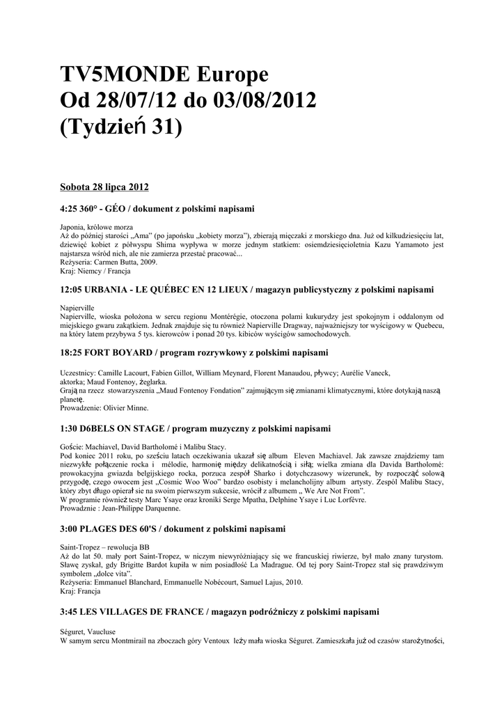 TV5MONDE Europe Od 28/07/12 do 03/08/2012 (Tydzie 31) ń