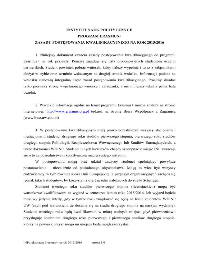 INSTYTUT NAUK POLITYCZNYCH PROGRAM ERASMUS+ ZASADY POSTĘPOWANIA KWALIFIKACYJNEGO NA ROK 2015/2016 1. Niniejszy dokument zawiera zasady postępowania kwalifikacyjnego do programu Erasmus+ na rok przyszły. Poniżej znajduje się lista proponowanych studentom uczelni partnerskich. Student powinien pobrać wniosek, który należy wypełnić i wraz z załącznikami złożyć w trybie oraz terminie wskazanym na drugiej stronie wniosku. Informacje podane na wniosku stanowią integralną część zasad postępowania kwalifikacyjnego. Prosimy składać tylko pierwszą stronę wypełnionego wniosku i załączniki, a nie niniejszy tekst z pełną listą uczelni. 2. Wszelkie informacje ogólne na temat programu Erasmus+ można znaleźć na stronie internetowej: http://www.erasmus.org.pl tudzież na stronie Biura Współpracy z Zagranicą (www.bwz.uw.edu.pl) 3. W postępowaniu kwalifikacyjnym mają prawo uczestniczyć wszyscy stacjonarni i niestacjonarni studenci drugiego roku studiów pierwszego stopnia, pierwszego roku studiów drugiego stopnia Politologii, Bezpieczeństwa Wewnętrznego lub Studiów Euroazjatyckich, a także doktoranci WDiNP. Studenci innych kierunków chcący skorzystać z miejsc INP zwracają się o to za pośrednictwem koordynatora macierzystego instytutu. W postępowaniu mogą brać udział wszyscy studenci spełniający powyższe postanowienia – niezależnie od posiadanego obywatelstwa. Mogą to więc być wszyscy cudzoziemcy, w tym również spoza Unii Europejskiej. Z przyczyn organizacyjnych zachęca się jednak takich studentów, by korzystali z ofert uczelni należących do strefy Schengen. Studenci trzeciego roku studiów pierwszego stopnia (licencjackich) mogą być warunkowo kwalifikowani na wyjazd w semestrze letnim roku 2015/2016. Ich wyjazd będzie możliwy jedynie wtedy, gdy w tymże roku znajdować się będą na liście studentów WDiNP UW (czyli pod warunkiem, że dostaną się na studia drugiego stopnia na naszym wydziale). Studenci trzeciego roku będą kwalifikowani w miarę wolnych miejsc, gdyż pierwszeństwo przysługuje studentom drugiego roku pierwszego i pierwszego studiów drugiego stopnia, którzy na pewno z przyznanego im miejsca będą mogli skorzystać. INP; rekrutacja Erasmus+ na rok 2015/2016 strona 1/6 4. Zakwalifikowani studenci będą mogli w najbliższym roku akademickim wyjechać wyłącznie na semestr zimowy (w przypadku opisanym w punkcie 3: letni). Wszelkie odstępstwa od tej reguły rozstrzygane będą indywidualnie przez Kierownika Studiów, w każdym zaś przypadku za pisemną zgodą promotora i złożeniem przez studenta pisemnego oświadczenia o wzięciu na siebie odpowiedzialności za wszelkie następstwa wynikające z nieterminowego uzyskania absolutorium. 5. Studenci mogą wskazać pięć uczelni, na których najchętniej podjęliby naukę, poczynając od tej, na której zależy im najbardziej, po tę, do której skłonni byliby pojechać w piątej kolejności. 6. Komisja dokonuje kwalifikacji według następujących trzech kryteriów: średniej ocen uzyskanej przez studenta, jego znajomości języków obcych oraz jego motywacji. - średnią ocen wpisuje na pierwszej stronie wniosku odpowiednia sekcja studencka. Jest to średnia ocen uzyskanych do ostatniej sesji letniej włącznie. Wyniki najbliższej, zimowej sesji egzaminacyjnej, nie będą brane pod uwagę. Wyższa średnia daje pierwszeństwo w kwalifikacji. Studenci pierwszego roku studiów drugiego stopnia przedstawiają zamiast średniej uwiarygodnioną kopię suplementu do dyplomu licencjata (lub magistra) i sami mogą wpisać średnią na pierwszej stronie. - znajomość przynajmniej jednego języka powinna być albo udokumentowana odpowiednim certyfikatem, czy zdanym egzaminem albo potwierdzona przez odpowiedniego pracownika WDiNP UW wskazanego przez Komisję. Pierwszeństwo w kwalifikacji mają osoby wykazujące się wyższym poziomem znajomości języka, znajomością większej liczby języków, w tym zwłaszcza języków rzadkich. Znajomość języka miejscowego w przypadku aplikowania o wyjazd do kraju, gdzie w użyciu jest język rzadki, stanowi dodatkowy atut. W przypadku wyjazdów do Niemiec, Francji, Hiszpanii, Włoch, Brukseli i walońskiej części Belgii niezbędna jest znajomość języka miejscowego na poziomie B2 lub wyżej. - motywacja studenta oceniania jest na podstawie: a. treści listu motywacyjnego, w którym student ma wyjaśnić, jaki ma pomysł na własną karierę zawodową i jak wybór tej akurat uczelni przyczyni się do realizacji tegoż pomysłu, b. podjętych już dotąd przez studenta starań na rzecz realizacji tegoż pomysłu (np. ukończone praktyki, uzyskane dodatkowe kwalifikacje) oraz c. opinii wystawionej przez pracownika naukowego WDiNP UW w stopniu co najmniej doktora. List motywacyjny powinien INP; rekrutacja Erasmus+ na rok 2015/2016 strona 2/6 być sporządzony po polsku oraz w języku kraju, do którego student chce wyjechać. W przypadku aplikowania o wyjazd do różnych krajów jednocześnie, gdzie w użyciu są różne języki, student powinien przedstawić list motywacyjny w tyluż wersjach językowych. Jeżeli zaś postuluje o wyjazd do różnych uczelni tego samego obszaru językowego, wówczas można złożyć jeden list motywacyjny, w którym będzie mowa o przynajmniej pierwszych trzech uczelniach, o które ubiega się student. 7. Komisja Kwalifikacyjna dołoży starań, by studenci – w miarę wolnych miejsc i w razie spełnienia wymogów formalnych – znaleźli miejsce na preferowanych uczelniach. Gdyby zabrakło miejsc, Komisja może zaproponować kandydatowi inną uczelnię, niż te, które kandydat wymienił. W interesie studentów leży podanie aktualnego numeru telefonicznego, by Komisja mogła bez przeszkód się ze studentem skontaktować. Brak takiego kontaktu uniemożliwi Komisji przedstawienie alternatywnych możliwości wyjazdu, a co za tym idzie, spowoduje skreślenie studenta z listy kandydatów. 8.
