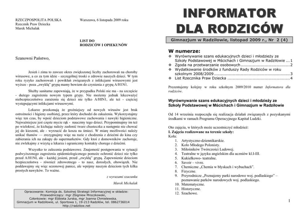 RZECZPOSPOLITA POLSKA Rzecznik Praw Dziecka Marek Michalak Warszawa, 6 listopada 2009 roku LIST DO RODZICÓW I OPIEKUNÓW INFORMATOR DLA RODZICÓW Gimnazjum w Radziłowie, listopad 2009 r., Nr 2 (4) W numerze: Szanowni Państwo, Jesień i zima to zawsze okres zwiększonej liczby zachorowań na choroby wirusowe, a co za tym idzie - szczególnej troski o zdrowie naszych dzieci. W tym roku ryzyko zachorowań i powikłań związanych z infekcjami wirusowymi jest wyższe - poza „zwykłą” grypą mamy bowiem do czynienia z grypą A/H1N1. Służby sanitarne zapewniają, że w przypadku Polski nie ma - na szczęście - dużego zagrożenia nowym typem grypy. Nie możemy jednak lekceważyć niebezpieczeństwa zarażenia się dzieci nie tylko A/HIN1, ale też - częściej występującymi infekcjami wirusowymi. Lekarze przekonują że groźniejszy od nowych wirusów jest brak ostrożności i higieny osobistej, przez który dochodzi do zakażenia. Wykorzystajmy więc ten czas, by wpoić dzieciom podstawowe zachowania i nawyki higieniczne. Najważniejsze jest częste mycie rąk - nauczmy tego dzieci. Przypominajmy im też po wielokroć, że kichając należy zasłonić twarz chusteczka a następnie nie chować jej do kieszeni, ale - wyrzucić do kosza na śmieci. W miarę możliwości należy unikać tłumów — zrezygnujmy więc na razie z chodzenia z dziećmi do kina czy zabierania ich na zakupy do supermarketów. Gdy ktoś z domowników zachoruje, nie zwlekajmy z wizytą u lekarza i ograniczmy kontakty chorego z dziećmi. Wszystko to zalecenia podstawowe. Znajomość postępowania w sytuacji podwyższonego zagrożenia epidemiologicznego pomoże ochronić dzieci nie tylko przed A/H1NI, ale - każdej jesieni, przed „zwykłą” grypą. Zapewnienie dzieciom bezpieczeństwa - również zdrowotnego - to nasz, dorosłych, obowiązek. Nie poddawajmy się więc sezonowej panice, ale wpójmy naszym dzieciom tych kilka prostych nawyków. To ważne. z wyrazami szacunku Marek Michalak Opracowanie: Komisja ds. Szkolnej Strategii Informacyjnej w składzie: Przewodniczący: mgr Zbigniew Mroczkowski, Członkowie: mgr Elżbieta Jurska, mgr Joanna Chmielewska. Gimnazjum w Radziłowie, ul. Sportowa 1, 19-213 Radziłów, tel. 0862736014 http://radzilow.net Wyrównywanie szans edukacyjnych dzieci i młodzieży ze Szkoły Podstawowej w Mścichach i Gimnazjum w Radziłowie ... 1 Zgoda na przetwarzanie osobowych ..................................... 2 Wydatkowanie środków z funduszy Rady Rodziców w roku szkolnym 2008/2009 ......................................................... 3 List Rzecznika Praw Dziecka ............................................... 4 Prezentujemy kolejny w roku szkolnym 2009/2010 numer Informatora dla rodziców. Wyrównywanie szans edukacyjnych dzieci i młodzieży ze Szkoły Podstawowej w Mścichach i Gimnazjum w Radziłowie Od 14 września rozpoczęła się realizacja działań związanych z pozyskanymi środkami w ramach Programu Operacyjnego Kapitał Ludzki. Oto zajęcia, w których może uczestniczyć młodzież: I. Zajęcia realizowane na terenie szkoły: Koła: 1. Artystyczno-dziennikarskie. 2. Koło Młodego Polonisty. 3. Miłośników Twórczości Ludowej. 4. Teatralne w języku angielskim dla uczniów kl.I-III. 5. Kukiełkowo- teatralne. 6. Savoir – vivre. 7. Chemiczne „Chemia w błyskach i wybuchach”. 8. Fizyczne. 9. Przyrodnicze „Poznajemy parki narodowe woj. podlaskiego” – poznawanie parków narodowych woj. podlaskiego. 10. Matematyczne. 11. Historyczne. 12. Szachowe. 1 Dodatkowo zajęcia: 1. Z języka niemieckiego. 2. Terenowe z geografii. 3. Wyrównawcze z matematyki- utrwalanie podstawowej wiedzy matematycznej. 4. Wyrównawcze z fizyki- wyrównywanie braków w podstawowych wiadomościach z fizyki. 5. Wyrównawcze z geografii dla klas II i III- utrwalanie podstawowych wiadomości z geografii. 6. Wyrównawcze z języka polskiego. 7. Wyrównawcze z języka angielskiego. 8. Wyrównawcze z historii dla klas III. 9. Sportowo-rekreacyjne. 10. Tenisa stołowego. 11. Klub Grafiki Komputerowej i Montażu Filmów. II. Doradztwo zawodowe: 1. Zajęcia z doradztwa zawodowego. 2. Wyjazdy do Młodzieżowego Centrum Kariery. 3. Wyjazdy do Mobilnego Centrum Informacji Zawodowej. 4. Giełda szkół ponadgimnazjalnych. III. Zajęcia sportowe na basenie w Mońkach. IV. Dodatkowe zajęcia wyjazdowe. Zgoda na przetwarzanie osobowych W związku z realizacją na terenie Gimnazjum w Radziłowie działań w ramach Programu Operacyjnego Kapitał Ludzki przekazana została dla Państwa zgoda na przetwarzanie danych osobowych. Dane Waszych dzieci muszą być wykazane w systemie PEFS (Podsystem Monitorowania Europejskiego Funduszu Społecznego). Jest on systemem przeznaczonym do monitorowania efektów realizacji projektów dofinansowanych z Europejskiego Funduszu Społecznego poprzez zbieranie danych od osób oraz instytucji bezpośrednio objętych wsparciem w ramach PO KL. Podstawowym celem podsystemu jest spełnienie wszelkich wymogów Komisji Europejskiej. Tylko ci uczniowie, których rodzice (prawni opiekunowie) wyrazili zgodę oraz złożyli deklarację uczestnictwa, mogą być objęci wsparciem w ramach POKL. Dane mogą być wykorzystywane między innymi do przeprowadzenia badań, pozwalają sprawdzić, co dzieje się np. z uczestnikami realizowanego wsparcia. 2 INFORMATOR DLA RODZICÓW Wydatkowanie środków z funduszy Rady Rodziców w roku szkolnym 2008/2009 1/ stan konta na dzień 25.09.2008 – 4137,24 zł. 2/ wpływy na konto: - wpłaty od uczniów – 5925 zł. (tegoroczne klasy: IIa – 750 zł., II b – 250 zł., IIc – 675 zł., III a – 1350 zł.(100 % klasy), III b – 700 zł., III c – 750 zł.(100% klasy), III d – 400 zł., absolwenci III a – 200 zł., III b – 350 zł., III c – 500 zł.), - wpływy od sponsorów – 1980 zł. - wpłaty za zakup zbiorników, kaloryferów, lamp z demontażu – 388 zł. - wpłaty za duplikaty dokumentów – 58 zł. - opłata za