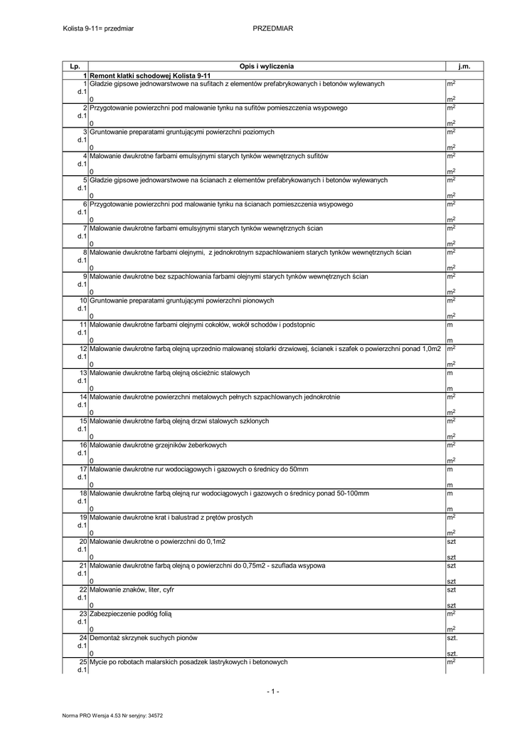 Kolista 9-11= przedmiar PRZEDMIAR Lp. Opis i wyliczenia 1 Remont klatki schodowej Kolista 9-11 1 Gładzie gipsowe jednowarstwowe na sufitach z elementów prefabrykowanych i betonów wylewanych d.1 0 2 Przygotowanie powierzchni pod malowanie tynku na sufitów pomieszczenia wsypowego d.1 0 3 Gruntowanie preparatami gruntującymi powierzchni poziomych d.1 0 4 Malowanie dwukrotne farbami emulsyjnymi starych tynków wewnętrznych sufitów d.1 0 5 Gładzie gipsowe jednowarstwowe na ścianach z elementów prefabrykowanych i betonów wylewanych d.1 0 6 Przygotowanie powierzchni pod malowanie tynku na ścianach pomieszczenia wsypowego d.1 0 7 Malowanie dwukrotne farbami emulsyjnymi starych tynków wewnętrznych ścian d.1 0 8 Malowanie dwukrotne farbami olejnymi, z jednokrotnym szpachlowaniem starych tynków wewnętrznych ścian d.1 0 9 Malowanie dwukrotne bez szpachlowania farbami olejnymi starych tynków wewnętrznych ścian d.1 0 10 Gruntowanie preparatami gruntującymi powierzchni pionowych d.1 0 11 Malowanie dwukrotne farbami olejnymi cokołów, wokół schodów i podstopnic d.1 0 12 Malowanie dwukrotne farbą olejną uprzednio malowanej stolarki drzwiowej, ścianek i szafek o powierzchni ponad 1,0m2 d.1 0 13 Malowanie dwukrotne farbą olejną ościeżnic stalowych d.1 0 14 Malowanie dwukrotne powierzchni metalowych pełnych szpachlowanych jednokrotnie d.1 0 15 Malowanie dwukrotne farbą olejną drzwi stalowych szklonych d.1 0 16 Malowanie dwukrotne grzejników żeberkowych d.1 0 17 Malowanie dwukrotne rur wodociągowych i gazowych o średnicy do 50mm d.1 0 18 Malowanie dwukrotne farbą olejną rur wodociągowych i gazowych o średnicy ponad 50-100mm d.1 0 19 Malowanie dwukrotne krat i balustrad z prętów prostych d.1 0 20 Malowanie dwukrotne o powierzchni do 0,1m2 d.1 0 21 Malowanie dwukrotne farbą olejną o powierzchni do 0,75m2 - szuflada wsypowa d.1 0 22 Malowanie znaków, liter, cyfr d.1 0 23 Zabezpieczenie podłóg folią d.1 0 24 Demontaż skrzynek suchych pionów d.1 0 25 Mycie po robotach malarskich posadzek lastrykowych i betonowych d.1 -1- Norma PRO Wersja 4.53 Nr seryjny: 34572 j.m. m2 m2 m2 m2 m2 m2 m2 m2 m2 m2 m2 m2 m2 m2 m2 m2 m2 m2 m2 m2 m m m2 m2 m m m2 m2 m2 m2 m2 m2 m m m m m2 m2 szt szt szt szt szt szt m2 m2 szt. szt. m2 Kolista 9-11= przedmiar PRZEDMIAR Lp. Opis i wyliczenia 0 26 Montaż pochwytu PCV na poręczach w budynku mieszkalnym wielorodzinnym d.1 0 27 Montaż listew ściennych (korytek instalacyjnych) z PCW na ścianach i stropach poprzez przykręcenie do betonu d.1 0 28 Wymiana stalowych drzwiczek skrzynek instalacyjnych d.1 0 2 Malowanie suszarni i wózkowni 29 Przygotowanie powierzchni z poszpachlowaniem nierówności powierzchni tynku sufitów - suszarnie i wózkownie d.2 0 30 Gruntowanie preparatami gruntującymi powierzchni poziomych - suszarnie i wózkownie d.2 0 31 Malowanie dwukrotne farbami emulsyjnymi starych tynków wewnętrznych sufitów - suszarnie i wózkownie d.2 0 32 Przygotowanie powierzchni z poszpachlowaniem nierówności powierzchni tynku ścian - suszarnie i wózkownie d.2 0 33 Gruntowanie preparatami gruntującymi powierzchni pionowych - suszarnie i wózkownie d.2 0 34 Malowanie dwukrotne farbami emulsyjnymi starych tynków wewnętrznych ścian - suszarnie i wózkownie d.2 0 35 Malowanie dwukrotne bez szpachlowania farbami olejnymi starych tynków wewnętrznych ścian - suszarnie d.2 0 36 Malowanie dwukrotne farbami olejnymi cokołów - suszarnie i wózkownie d.2 0 37 Zabezpieczenie podłóg folią - suszarnie i wózkownia d.2 0 3 Malowanie piwnic 38 Zmycie i oczyszczenie tynków sufitów z pajęczyn i zabrudzeń d.3 0 39 Malowanie sufitów farbą wapienną z dodatkiem 15% farby emulsyjnej d.3 0 40 Zmycie i oczyszczenie tynków ścian z pajęczyn i zabrudzeń d.3 0 41 Malowanie ścian farbą wapienną z dodatkiem 15% farby emulsyjnej d.3 0 42 Malowanie jednokrotne farbą olejną rur wodociągowych i gazowych o średnicy do 50mm d.3 0 43 Malowanie jednokrotne farbą olejną powierzchni pełnych metalowych - drzwiczki i skrzynka elektr., drzwi d.3 0 44 Malowanie jednokrotne farbami olejnymi pasów (cokołów) o wys.do 20cm - podstopnice i przy schodach d.3 0 45 Malowanie jednokrotne farbą olejną uprzednio malowanej stolarki drzwiowej d.3 0 46 Malowanie znaków, liter, cyfr - błyskawice d.3 0 47 Zabezpieczenie podłóg folią d.3 0 -2- Norma PRO Wersja 4.53 Nr seryjny: 34572 j.m. m2 m m m m szt. szt. m2 m2 m2 m2 m2 m2 m2 m2 m2 m2 m2 m2 m2 m2 m m m2 m2 m2 m2 m2 m2 m2 m2 m2 m2 m m m2 m2 m m m2 m2 szt szt m2 m2