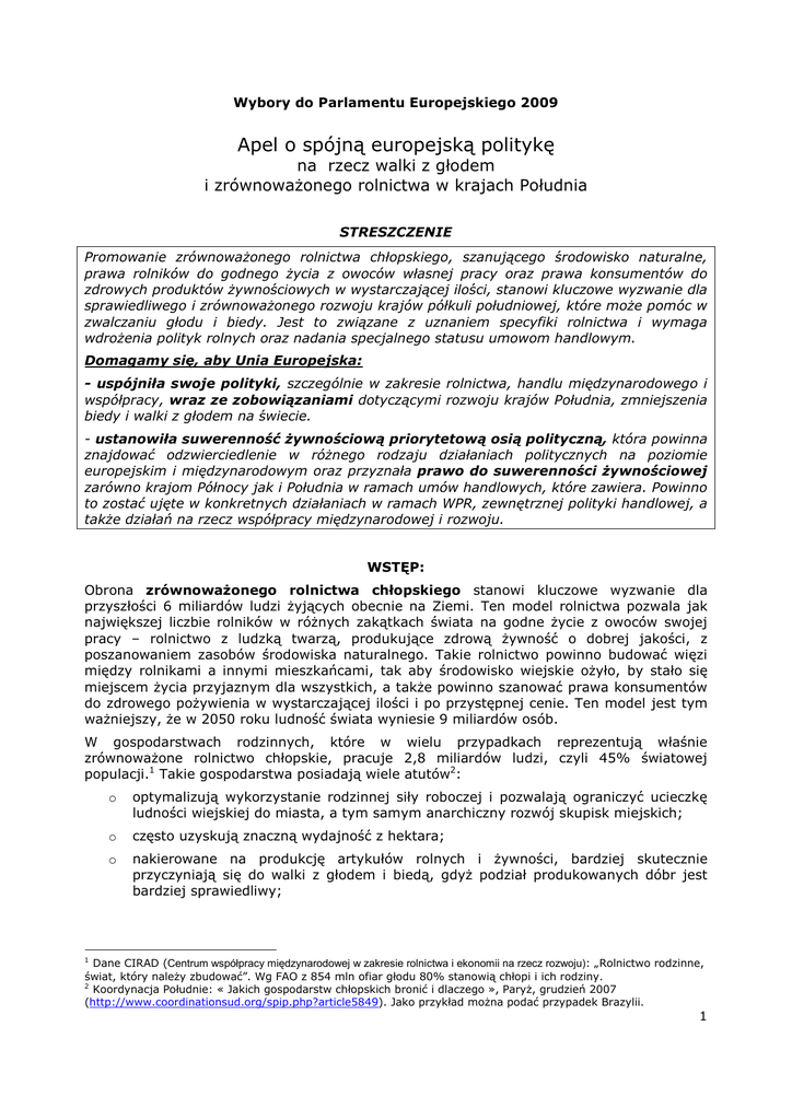 Wybory do Parlamentu Europejskiego 2009 Apel o spójną europejską politykę na rzecz walki z głodem i zrównowaŜonego rolnictwa w krajach Południa STRESZCZENIE Promowanie zrównowaŜonego rolnictwa chłopskiego, szanującego środowisko naturalne, prawa rolników do godnego Ŝycia z owoców własnej pracy oraz prawa konsumentów do zdrowych produktów Ŝywnościowych w wystarczającej ilości, stanowi kluczowe wyzwanie dla sprawiedliwego i zrównowaŜonego rozwoju krajów półkuli południowej, które moŜe pomóc w zwalczaniu głodu i biedy. Jest to związane z uznaniem specyfiki rolnictwa i wymaga wdroŜenia polityk rolnych oraz nadania specjalnego statusu umowom handlowym. Domagamy się, aby Unia Europejska: - uspójniła swoje polityki, szczególnie w zakresie rolnictwa, handlu międzynarodowego i współpracy, wraz ze zobowiązaniami dotyczącymi rozwoju krajów Południa, zmniejszenia biedy i walki z głodem na świecie. - ustanowiła suwerenność Ŝywnościową priorytetową osią polityczną, która powinna znajdować odzwierciedlenie w róŜnego rodzaju działaniach politycznych na poziomie europejskim i międzynarodowym oraz przyznała prawo do suwerenności Ŝywnościowej zarówno krajom Północy jak i Południa w ramach umów handlowych, które zawiera. Powinno to zostać ujęte w konkretnych działaniach w ramach WPR, zewnętrznej polityki handlowej, a takŜe działań na rzecz współpracy międzynarodowej i rozwoju. WSTĘP: Obrona zrównowaŜonego rolnictwa chłopskiego stanowi kluczowe wyzwanie dla przyszłości 6 miliardów ludzi Ŝyjących obecnie na Ziemi. Ten model rolnictwa pozwala jak największej liczbie rolników w róŜnych zakątkach świata na godne Ŝycie z owoców swojej pracy – rolnictwo z ludzką twarzą, produkujące zdrową Ŝywność o dobrej jakości, z poszanowaniem zasobów środowiska naturalnego. Takie rolnictwo powinno budować więzi między rolnikami a innymi mieszkańcami, tak aby środowisko wiejskie oŜyło, by stało się miejscem Ŝycia przyjaznym dla wszystkich, a takŜe powinno szanować prawa konsumentów do zdrowego poŜywienia w wystarczającej ilości i po przystępnej cenie. Ten model jest tym waŜniejszy, Ŝe w 2050 roku ludność świata wyniesie 9 miliardów osób. W gospodarstwach rodzinnych, które w wielu przypadkach reprezentują właśnie zrównowaŜone rolnictwo chłopskie, pracuje 2,8 miliardów ludzi, czyli 45% światowej populacji.1 Takie gospodarstwa posiadają wiele atutów2: o optymalizują wykorzystanie rodzinnej siły roboczej i pozwalają ograniczyć ucieczkę ludności wiejskiej do miasta, a tym samym anarchiczny rozwój skupisk miejskich; o często uzyskują znaczną wydajność z hektara; o nakierowane na produkcję artykułów rolnych i Ŝywności, bardziej skutecznie przyczyniają się do walki z głodem i biedą, gdyŜ podział produkowanych dóbr jest bardziej sprawiedliwy; 1 Dane CIRAD (Centrum współpracy międzynarodowej w zakresie rolnictwa i ekonomii na rzecz rozwoju): „Rolnictwo rodzinne, świat, który naleŜy zbudować”. Wg FAO z 854 mln ofiar głodu 80% stanowią chłopi i ich rodziny. 2 Koordynacja Południe: « Jakich gospodarstw chłopskich bronić i dlaczego », ParyŜ, grudzień 2007 (http://www.coordinationsud.org/spip.php?article5849). Jako przykład moŜna podać przypadek Brazylii. 1 o ich działalność jest często bardziej zdywersyfikowana (uprawa wielu gatunków roślin plus hodowla), najczęściej prowadzona z większym poszanowaniem środowiska naturalnego niŜ duŜe gospodarstwa oparte na monokulturze. A jednak presja na coraz większą liberalizację światowej gospodarki zagraŜa takiemu rolnictwu. Zarówno na Północy jak i na Południu pogłębiająca się liberalizacja rynków rolnych oraz brak inwestycji w tym sektorze sprawiają, Ŝe coraz więcej małych, zrównowaŜonych gospodarstw rolnych znika (600 tysięcy rocznie). Zmusza to wiele milionów chłopów do migracji do miast i innych krajów, które nie są w stanie zapewnić wszystkim godnej pracy. Ponadto, brak światowych regulacji rynków rolnych najbardziej naraŜa takie gospodarstwa na spekulacje. Taka sytuacja nie sprzyja ani rolnikom, ani konsumentom. Deregulacja jest w duŜej mierze odpowiedzialna za obecny kryzys. Ogromny wzrost cen niektórych produktów rolnych (zbóŜ, produktów mlecznych, itp.), wzmoŜona przez działania spekulacyjne, uderza mocno w kraje rozwijające się, które, zrezygnowawszy w ostatnich dziesięcioleciach z rolnictwa, w zbyt duŜym stopniu zaleŜne są od importu. Zamieszki na tle głodowym przetoczyły się juŜ przez wiele miast w Kamerunie, Senegalu, czy na Haiti. Z kolei kraje, które wspierały swoje rolnictwo i produkują podstawowe produkty Ŝywnościowe, są na ogół mniej dotknięte kryzysem. Właśnie dlatego, w obliczu powagi sytuacji, Organizacja Narodów Zjednoczonych do spraw wyŜywienia i rolnictwa (FAO) ustanowiła „szybkie pobudzenie wzrostu produkcji Ŝywności w dotkniętych krajach”3 swoim priorytetem. Takie stanowisko łączy się z tym, którego bronią od lat organizacje chłopskie głównie w Afryce. Aby osiągnąć ten cel, kraje Południa powinny, podobnie jak Unia Europejska, móc wzmocnić integrację regionalną, chronić swoje rolnictwo, wprowadzić politykę rolną, która pozwalałaby im dąŜyć do niezaleŜności Ŝywnościowej, a takŜe stosować zasadę preferencji regionalnej. Takie działania polityczne powinny mieć na uwadze szczególnie rolników prowadzących rodzinne gospodarstwa rolne i ich rodziny, gdyŜ są oni pierwszymi ofiarami głodu i biedy. Na początku lat sześćdziesiątych ubiegłego stulecia, aby rozwiązać problem deficytu Ŝywności, kraje europejskie zdecydowały się wprowadzić w Ŝycie wspólną politykę rolną opartą na dotowaniu europejskiej produkcji rolnej i na zabezpieczeniach przeciwko importowi z krajów trzecich. Pozwoliło to Europie osiągnąć samowystarczalność Ŝywnościową juŜ w latach