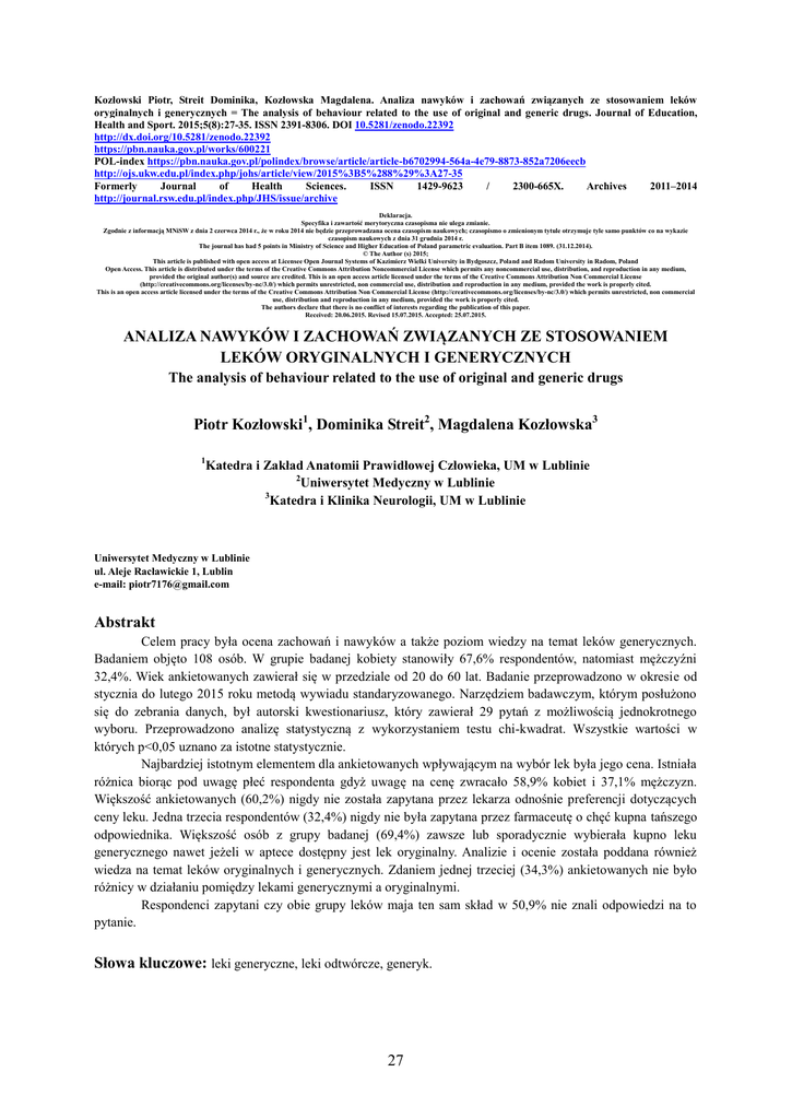 Kozłowski Piotr, Streit Dominika, Kozłowska Magdalena. Analiza nawyków i zachowań związanych ze stosowaniem leków oryginalnych i generycznych = The analysis of behaviour related to the use of original and generic drugs. Journal of Education, Health and Sport. 2015;5(8):27-35. ISSN 2391-8306. DOI 10.5281/zenodo.22392 http://dx.doi.org/10.5281/zenodo.22392 https://pbn.nauka.gov.pl/works/600221 POL-index https://pbn.nauka.gov.pl/polindex/browse/article/article-b6702994-564a-4e79-8873-852a7206eecb http://ojs.ukw.edu.pl/index.php/johs/article/view/2015%3B5%288%29%3A27-35 Formerly Journal of Health Sciences. ISSN 1429-9623 / 2300-665X. Archives 2011–2014 http://journal.rsw.edu.pl/index.php/JHS/issue/archive Deklaracja. Specyfika i zawartość merytoryczna czasopisma nie ulega zmianie. Zgodnie z informacją MNiSW z dnia 2 czerwca 2014 r., że w roku 2014 nie będzie przeprowadzana ocena czasopism naukowych; czasopismo o zmienionym tytule otrzymuje tyle samo punktów co na wykazie czasopism naukowych z dnia 31 grudnia 2014 r. The journal has had 5 points in Ministry of Science and Higher Education of Poland parametric evaluation. Part B item 1089. (31.12.2014). © The Author (s) 2015; This article is published with open access at Licensee Open Journal Systems of Kazimierz Wielki University in Bydgoszcz, Poland and Radom University in Radom, Poland Open Access. This article is distributed under the terms of the Creative Commons Attribution Noncommercial License which permits any noncommercial use, distribution, and reproduction in any medium, provided the original author(s) and source are credited. This is an open access article licensed under the terms of the Creative Commons Attribution Non Commercial License (http://creativecommons.org/licenses/by-nc/3.0/) which permits unrestricted, non commercial use, distribution and reproduction in any medium, provided the work is properly cited. This is an open access article licensed under the terms of the Creative Commons Attribution Non Commercial License (http://creativecommons.org/licenses/by-nc/3.0/) which permits unrestricted, non commercial use, distribution and reproduction in any medium, provided the work is properly cited. The authors declare that there is no conflict of interests regarding the publication of this paper. Received: 20.06.2015. Revised 15.07.2015. Accepted: 25.07.2015. ANALIZA NAWYKÓW I ZACHOWAŃ ZWIĄZANYCH ZE STOSOWANIEM LEKÓW ORYGINALNYCH I GENERYCZNYCH The analysis of behaviour related to the use of original and generic drugs Piotr Kozłowski1, Dominika Streit2, Magdalena Kozłowska3 1 Katedra i Zakład Anatomii Prawidłowej Człowieka, UM w Lublinie 2 Uniwersytet Medyczny w Lublinie 3 Katedra i Klinika Neurologii, UM w Lublinie Uniwersytet Medyczny w Lublinie ul. Aleje Racławickie 1, Lublin e-mail: [email protected] Abstrakt Celem pracy była ocena zachowań i nawyków a także poziom wiedzy na temat leków generycznych. Badaniem objęto 108 osób. W grupie badanej kobiety stanowiły 67,6% respondentów, natomiast mężczyźni 32,4%. Wiek ankietowanych zawierał się w przedziale od 20 do 60 lat. Badanie przeprowadzono w okresie od stycznia do lutego 2015 roku metodą wywiadu standaryzowanego. Narzędziem badawczym, którym posłużono się do zebrania danych, był autorski kwestionariusz, który zawierał 29 pytań z możliwością jednokrotnego wyboru. Przeprowadzono analizę statystyczną z wykorzystaniem testu chi-kwadrat. Wszystkie wartości w których p<0,05 uznano za istotne statystycznie. Najbardziej istotnym elementem dla ankietowanych wpływającym na wybór lek była jego cena. Istniała różnica biorąc pod uwagę płeć respondenta gdyż uwagę na cenę zwracało 58,9% kobiet i 37,1% mężczyzn. Większość ankietowanych (60,2%) nigdy nie została zapytana przez lekarza odnośnie preferencji dotyczących ceny leku. Jedna trzecia respondentów (32,4%) nigdy nie była zapytana przez farmaceutę o chęć kupna tańszego odpowiednika. Większość osób z grupy badanej (69,4%) zawsze lub sporadycznie wybierała kupno leku generycznego nawet jeżeli w aptece dostępny jest lek oryginalny. Analizie i ocenie została poddana również wiedza na temat leków oryginalnych i generycznych. Zdaniem jednej trzeciej (34,3%) ankietowanych nie było różnicy w działaniu pomiędzy lekami generycznymi a oryginalnymi. Respondenci zapytani czy obie grupy leków maja ten sam skład w 50,9% nie znali odpowiedzi na to pytanie. Słowa kluczowe: leki generyczne, leki odtwórcze, generyk. 27 Abstract The aim of the study was an evaluation of behaviours and habits, as well as an essesment of the level of knowledge about generic drugs. The study included 108 people. In the study group, women accounted for 67.6% of respondents, while 32.4% were men. The age of the respondents ranged from 20 to 60. The study was conducted in the period from January to February 2015 and it employed standardized interview research method. Research tool, which was used for data collection was a questionnaire consisted of 29 questions multiple-choice questions. Statistical analysis was performed using the chi-square test. All values for which p <0.05 (probability of error) were considered statistically significant. For the participants, the most important factor influencing the choice of particular drug was the price of the product. The difference was related to gender as 58.9% of female and only 37.1% male respondents agreed on the relevance of the price. The majority of the respondents (60.2%) had never been asked by a pharmacist about their price-dependent preferences. One third of the respondents (32.4%) had never been offered a cheaper generic equivalent for a brand-name drug. Most participants of the study (69.4%) always or occasionally chose to buy a cheaper generic equivalent fro a brand-name drug. The participants knowledge about original and generic drugs was also analysed and evaluated. According to one third (34.3%) of the respondents 