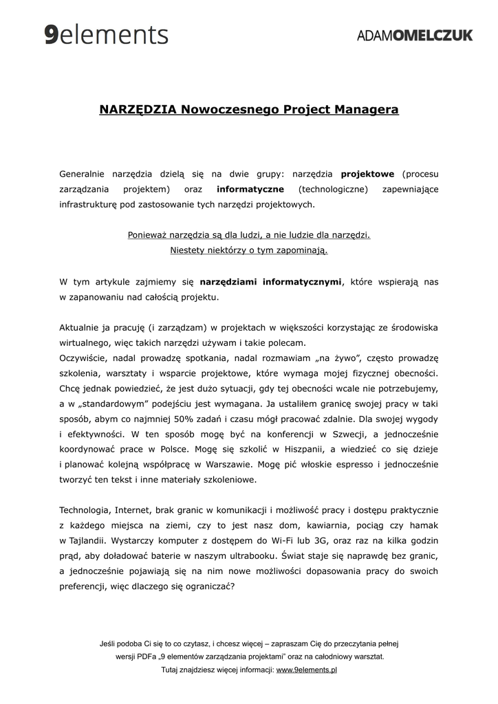NARZĘDZIA Nowoczesnego Project Managera Generalnie narzędzia dzielą się na dwie grupy: narzędzia projektowe (procesu zarządzania projektem) oraz informatyczne (technologiczne) zapewniające infrastrukturę pod zastosowanie tych narzędzi projektowych. Ponieważ narzędzia są dla ludzi, a nie ludzie dla narzędzi. Niestety niektórzy o tym zapominają. W tym artykule zajmiemy się narzędziami informatycznymi, które wspierają nas w zapanowaniu nad całością projektu. Aktualnie ja pracuję (i zarządzam) w projektach w większości korzystając ze środowiska wirtualnego, więc takich narzędzi używam i takie polecam. Oczywiście, nadal prowadzę spotkania, nadal rozmawiam „na żywo”, często prowadzę szkolenia, warsztaty i wsparcie projektowe, które wymaga mojej fizycznej obecności. Chcę jednak powiedzieć, że jest dużo sytuacji, gdy tej obecności wcale nie potrzebujemy, a w „standardowym” podejściu jest wymagana. Ja ustaliłem granicę swojej pracy w taki sposób, abym co najmniej 50% zadań i czasu mógł pracować zdalnie. Dla swojej wygody i efektywności. W ten sposób mogę być na konferencji w Szwecji, a jednocześnie koordynować prace w Polsce. Mogę się szkolić w Hiszpanii, a wiedzieć co się dzieje i planować kolejną współpracę w Warszawie. Mogę pić włoskie espresso i jednocześnie tworzyć ten tekst i inne materiały szkoleniowe. Technologia, Internet, brak granic w komunikacji i możliwość pracy i dostępu praktycznie z każdego miejsca na ziemi, czy to jest nasz dom, kawiarnia, pociąg czy hamak w Tajlandii. Wystarczy komputer z dostępem do Wi-Fi lub 3G, oraz raz na kilka godzin prąd, aby doładować baterie w naszym ultrabooku. Świat staje się naprawdę bez granic, a jednocześnie pojawiają się na nim nowe możliwości dopasowania pracy do swoich preferencji, więc dlaczego się ograniczać? Jeśli podoba Ci się to co czytasz, i chcesz więcej – zapraszam Cię do przeczytania pełnej wersji PDFa „9 elementów zarządzania projektami” oraz na całodniowy warsztat. Tutaj znajdziesz więcej informacji: www.9elements.pl Lista narzędzi, które polecam: - Wrike (https://www.wrike.com/) – Świetny system do zarządzania projektami. Darmowy w podstawowej wersji, zupełnie wystarczającej do prowadzenia prywatnych lub mniejszych (kilkuosobowych) projektów. Korzystam z niego na stałe. - mail jako podstawa komunikacji i ustaleń i współpracy w zespole (a dla więcej niż 2 osób warto skorzystać z grupy mailingowej np. na Google Groups – opisana poniżej); - telefon, czyli rozmowy telefoniczne (również w formie konferencji kilkuosobowych, czasem bardzo przydatne narzędzie, a rzadko wykorzystywane); - Google i jego narzędzia: Gmail; Google Groups (czyli grupy dyskusyjne – dają dostęp do historii wątków, wiedzy i mailingu w jednym miejscu, do tego mają świetną opcję zarządzania członkostwem, zintegrowanym z Google Drive’em, razem dając potężne i darmowe narzędzie do zarządzania dostępem, dokumentami i bazą wiedzy jednocześnie); Google Drive i Google Docs (Dysk Google’a oraz pakiet biurowy z dostępem z każdego miejsca o każdym czasie, wspaniale wspierający pracę kilku osób na wspólnym dokumencie); Google Calendar (zwłaszcza jego synchronizacja z różnymi urządzeniami oraz współdzielenie i dostęp przez wszystkich członków zespołu) – dzięki niemu wszyscy wiedzą co się dzieje, gdzie i kiedy; Google Hangouts (video + audio chat + możliwość nagrywania tego dla dokumentacji i historii prac, czyli mamy automatycznie logi projektu oraz wszystkie ustalenia); Google Apps – czyli wiele darmowych aplikacji, które mogą nam znacząco ułatwić pracę; - Skype – czyli darmowy program do audio i video rozmów i konferencji, komunikacja z każdym na cały świecie; - Facebook (zwłaszcza z osobami, które „żyją” Facebook’iem) Facebook chat do wymiany myśli; Grupy na Facebook’u - są bardzo dobrym narzędziem komunikacji dla mniej skomplikowanych projektów, zwłaszcza w takim środowisku, gdzie naturalnie spędzamy czas w mediach społecznościowych. Każdy od razu wie co się dzieje (i co ważniejsze – nie komplikujemy sobie życia nadmierną ilością narzędzi). Jeśli podoba Ci się to co czytasz, i chcesz więcej – zapraszam Cię do przeczytania pełnej wersji PDFa „9 elementów zarządzania projektami” oraz na całodniowy warsztat. Tutaj znajdziesz więcej informacji: www.9elements.pl - Trello (kolejny system do prostego zarządzania zadaniami i listami zadań oraz ich współdzielenia); - Kanban (ten „fizyczny” jak i ten wirtualny), czyli prosty system do zarządzania zadaniami; - Dropbox lub inny dysk w chmurze – jako podstawowe archiwum projektowe, z funkcją automatycznych backupów, przywracania plików, ich współdzielenia i dostępu z dowolnego miejsca, zawsze przy Tobie. Korzystając z zaprezentowanych tu, prostych narzędzi, życie i praca nowoczesnego kierownika projektu jeszcze nigdy nie była tak prosta i tak elastyczna. Nowoczesne technologie i darmowy dostęp do tak wielu serwisów i Czasem wystarczy tylko wybrać odpowiednie narzędzia i zacząć je stosować. I to jest jeden z elementów sukcesu. I o to nam właśnie chodzi. Powodzenia w realizacji Twoich projektów! Życzę Ci sukcesów! Adam Omelczuk Jeśli podoba Ci się to co czytasz, i chcesz więcej – zapraszam Cię do przeczytania pełnej wersji PDFa „9 elementów zarządzania projektami” oraz na całodniowy warsztat. Tutaj znajdziesz więcej informacji: www.9elements.pl