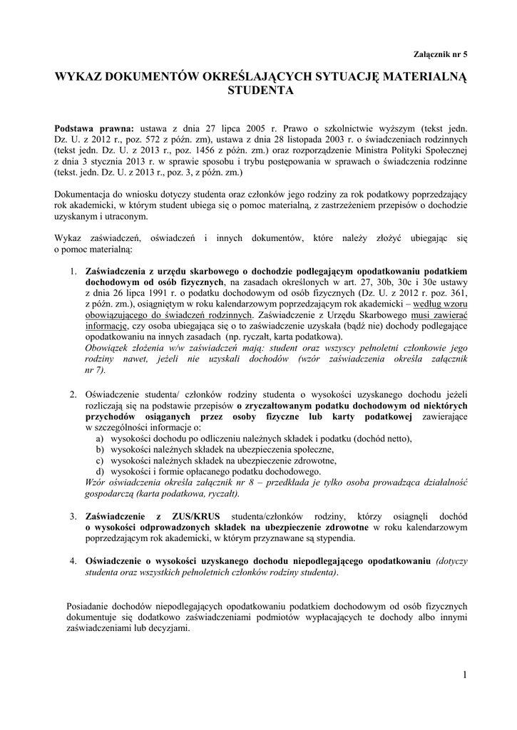Załącznik nr 5 WYKAZ DOKUMENTÓW OKREŚLAJĄCYCH SYTUACJĘ MATERIALNĄ STUDENTA Podstawa prawna: ustawa z dnia 27 lipca 2005 r. Prawo o szkolnictwie wyższym (tekst jedn. Dz. U. z 2012 r., poz. 572 z późn. zm), ustawa z dnia 28 listopada 2003 r. o świadczeniach rodzinnych (tekst jedn. Dz. U. z 2013 r., poz. 1456 z póżn. zm.) oraz rozporządzenie Ministra Polityki Społecznej z dnia 3 stycznia 2013 r. w sprawie sposobu i trybu postępowania w sprawach o świadczenia rodzinne (tekst. jedn. Dz. U. z 2013 r., poz. 3, z późn. zm.) Dokumentacja do wniosku dotyczy studenta oraz członków jego rodziny za rok podatkowy poprzedzający rok akademicki, w którym student ubiega się o pomoc materialną, z zastrzeżeniem przepisów o dochodzie uzyskanym i utraconym. Wykaz zaświadczeń, oświadczeń i innych dokumentów, które należy złożyć ubiegając się o pomoc materialną: 1. Zaświadczenia z urzędu skarbowego o dochodzie podlegającym opodatkowaniu podatkiem dochodowym od osób fizycznych, na zasadach określonych w art. 27, 30b, 30c i 30e ustawy z dnia 26 lipca 1991 r. o podatku dochodowym od osób fizycznych (Dz. U. z 2012 r. poz. 361, z późn. zm.), osiągniętym w roku kalendarzowym poprzedzającym rok akademicki – według wzoru obowiązującego do świadczeń rodzinnych. Zaświadczenie z Urzędu Skarbowego musi zawierać informację, czy osoba ubiegająca się o to zaświadczenie uzyskała (bądź nie) dochody podlegające opodatkowaniu na innych zasadach (np. ryczałt, karta podatkowa). Obowiązek złożenia w/w zaświadczeń mają: student oraz wszyscy pełnoletni członkowie jego rodziny nawet, jeżeli nie uzyskali dochodów (wzór zaświadczenia określa załącznik nr 7). 2. Oświadczenie studenta/ członków rodziny studenta o wysokości uzyskanego dochodu jeżeli rozliczają się na podstawie przepisów o zryczałtowanym podatku dochodowym od niektórych przychodów osiąganych przez osoby fizyczne lub karty podatkowej zawierające w szczególności informacje o: a) wysokości dochodu po odliczeniu należnych składek i podatku (dochód netto), b) wysokości należnych składek na ubezpieczenia społeczne, c) wysokości należnych składek na ubezpieczenie zdrowotne, d) wysokości i formie opłacanego podatku dochodowego. Wzór oświadczenia określa załącznik nr 8 – przedkłada je tylko osoba prowadząca działalność gospodarczą (karta podatkowa, ryczałt). 3. Zaświadczenie z ZUS/KRUS studenta/członków rodziny, którzy osiągnęli dochód o wysokości odprowadzonych składek na ubezpieczenie zdrowotne w roku kalendarzowym poprzedzającym rok akademicki, w którym przyznawane są stypendia. 4. Oświadczenie o wysokości uzyskanego dochodu niepodlegającego opodatkowaniu (dotyczy studenta oraz wszystkich pełnoletnich członków rodziny studenta). Posiadanie dochodów niepodlegających opodatkowaniu podatkiem dochodowym od osób fizycznych dokumentuje się dodatkowo zaświadczeniami podmiotów wypłacających te dochody albo innymi zaświadczeniami lub decyzjami. 1 Dochodami niepodlegającymi opodatkowaniu na podstawie przepisów o podatku dochodowym od osób fizycznych są: a) renty określone w przepisach o zaopatrzeniu inwalidów wojennych i wojskowych oraz ich rodzin; b) renty wypłacone osobom represjonowanym i członkom ich rodzin, przyznane na zasadach określonych w przepisach o zaopatrzeniu inwalidów wojennych i wojskowych oraz ich rodzin; c) świadczenia pieniężne oraz ryczałt energetyczny, określone w przepisach o świadczeniu pieniężnym i uprawnieniach przysługujących żołnierzom zastępczej służby wojskowej przymusowo zatrudnianym w kopalniach węgla, kamieniołomach, zakładach rud uranu i batalionach budowlanych; d) dodatek kombatancki, ryczałt energetyczny i dodatek kompensacyjny określone w przepisach o kombatantach oraz niektórych osobach będących ofiarami represji wojennych i okresu powojennego; e) świadczenie pieniężne określone w przepisach o świadczeniu pieniężnym przysługującym osobom deportowanym do pracy przymusowej oraz osadzonym w obozach pracy przez III Rzeszę Niemiecką lub Związek Socjalistycznych Republik Radzieckich; f) emerytury i renty otrzymywane przez osoby, które utraciły wzrok w wyniku działań wojennych w latach 1939–1945 lub eksplozji pozostałych po tej wojnie niewypałów i niewybuchów; g) renty inwalidzkie z tytułu inwalidztwa wojennego, kwoty zaopatrzenia otrzymywane przez ofiary wojny oraz członków ich rodzin, renty wypadkowe osób, których inwalidztwo powstało w związku z przymusowym pobytem na robotach w III Rzeszy Niemieckiej w latach 1939–1945, otrzymywane z zagranicy; h) zasiłki chorobowe określone w przepisach o ubezpieczeniu społecznym rolników oraz w przepisach o systemie ubezpieczeń społecznych; i) środki bezzwrotnej pomocy zagranicznej otrzymywane od rządów państw obcych, organizacji międzynarodowych lub międzynarodowych instytucji finansowych, pochodzące ze środków bezzwrotnej pomocy przyznanych na podstawie jednostronnej deklaracji lub umów zawartych z tymi państwami, organizacjami lub instytucjami przez Radę Ministrów, właściwego ministra lub agencje rządowe, w tym również w przypadkach, gdy przekazanie tych środków jest dokonywane za pośrednictwem podmiotu upoważnionego do rozdzielania środków bezzwrotnej pomocy zagranicznej na rzecz podmiotów, którym służyć ma ta pomoc; j) należności ze stosunku pracy lub z tytułu stypendium osób fizycznych mających miejsce zamieszkania na terytorium Rzeczypospolitej Polskiej, przebywających czasowo za granicą w wysokości odpowiadającej równowartości diet z tytułu podróży służbowej poza granicami kraju ustalonych dla pracowników zatrudnionych w państwowych lub samorządowych jednostkach sfery budżetowej na podstawie ustawy z dnia 26 czerwca 1974 r. – Kodeks pracy (Dz.U. z 1998 r. Nr 21, poz. 94, z późn. zm.); k) należności pieniężne wypłacone policjantom, żołn