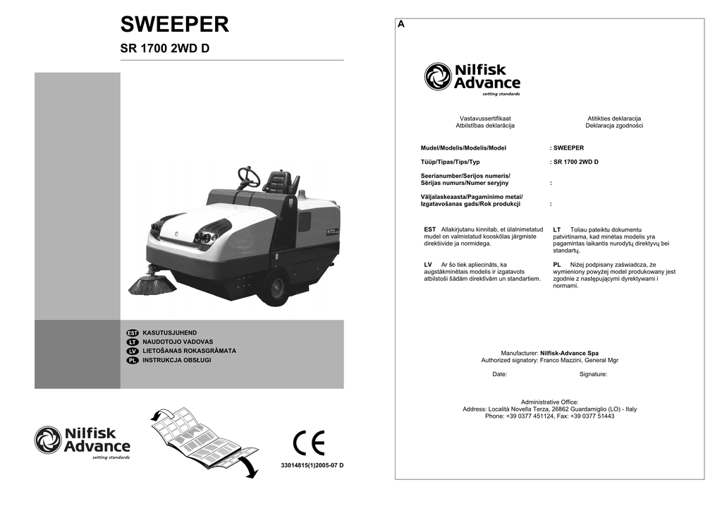 SWEEPER A SR 1700 2WD D Vastavussertifikaat AtbilstƯbas deklarƗcija Atitikties deklaracija Deklaracja zgodnoĞci Mudel/Modelis/Modelis/Model : SWEEPER Tüüp/Tipas/Tips/Typ : SR 1700 2WD D Seerianumber/Serijos numeris/ SƝrijas numurs/Numer seryjny : Väljalaskeaasta/Pagaminimo metai/ Izgatavošanas gads/Rok produkcji : EST Allakirjutanu kinnitab, et ülalnimetatud mudel on valmistatud kooskõlas järgmiste direktiivide ja normidega. LT Toliau pateiktu dokumentu patvirtinama, kad minơtas modelis yra pagamintas laikantis nurodytǐ direktyvǐ bei standartǐ. LV Ar šo tiek apliecinƗts, ka augstƗkminƝtais modelis ir izgatavots atbilstoši šƗdƗm direktƯvƗm un standartiem. PL NiĪej podpisany zaĞwiadcza, Īe wymieniony powyĪej model produkowany jest zgodnie z nastĊpującymi dyrektywami i normami. KASUTUSJUHEND NAUDOTOJO VADOVAS LIETOŠANAS ROKASGRĀMATA Manufacturer: Nilfisk-Advance Spa Authorized signatory: Franco Mazzini, General Mgr INSTRUKCJA OBSŁUGI Date: Signature: Administrative Office: Address: Località Novella Terza, 26862 Guardamiglio (LO) - Italy Phone: +39 0377 451124, Fax: +39 0377 51443 33014815(1)2005-07 D B D 1 E 1 2 18 15 C 16 17 14 13 4 12 11 10 5 8 8 6 6 9 33014815(1)2005-07 D 3 7 KASUTUSJUHEND SISSEJUHATUS ................................................................................................................................... 2 EESSÕNA ......................................................................................................................................................... 2 MASINA IDENTIFITSEERIMINE ...................................................................................................................... 2 KASUTUSJUHENDI IDENTIFITSEERIMINE ................................................................................................... 2 ÜLDISED HOIATUSED ......................................................................................................................... 2 KASUTUSJUHEND .......................................................................................................................................... 2 DEFINITSIOONID ............................................................................................................................................. 3 OPERAATORI VASTUTUS .............................................................................................................................. 3 OPERAATORI OHUTUSABINÕUD .................................................................................................................. 3 HOIATUSMÄRGID ............................................................................................................................................ 4 TRANSPORT, KÄSITSEMINE, PAIGALDAMINE ................................................................................ 4 MAHA LAADIMINE JA KÄSITSEMINE ............................................................................................................. 4 PAKEND ........................................................................................................................................................... 5 PAIGALDAMINE ............................................................................................................................................... 5 ÜLDISED KONTROLLID .................................................................................................................................. 5 TEHNILISED ANDMED ......................................................................................................................... 5 KASUTAMINE ................................................................................................................................................... 5 MASINA KAVAND ............................................................................................................................................ 5 MASINA KIRJELDUS ....................................................................................................................................... 6 OHUTUSSÜSTEEMID ...................................................................................................................................... 7 PÕHILISED TEHNILISED ANDMED ................................................................................................................ 7 KESKKONNA TINGIMUSED ............................................................................................................................ 8 MÜRATASE ...................................................................................................................................................... 8 KASUTAMINE ....................................................................................................................................... 8 JUHTNUPUD JA INSTRUMENDID .................................................................................................................. 8 KASUTUSJUHEND .......................................................................................................................................... 9 MASINA KASUTAMINE .................................................................................................................................... 9 MASINA PEATAMINE .................................................................................................................................... 10 PROBLEEMID JA LAHENDUSED ..................................................................................................... 11 PROBLEEMID JA LAHENDUSED .................................................................................................................. 11 PUHASTAMINE JA HOOLDAMINE ................................................................................................... 13 PUHASTAMINE ..........................................................................................................................