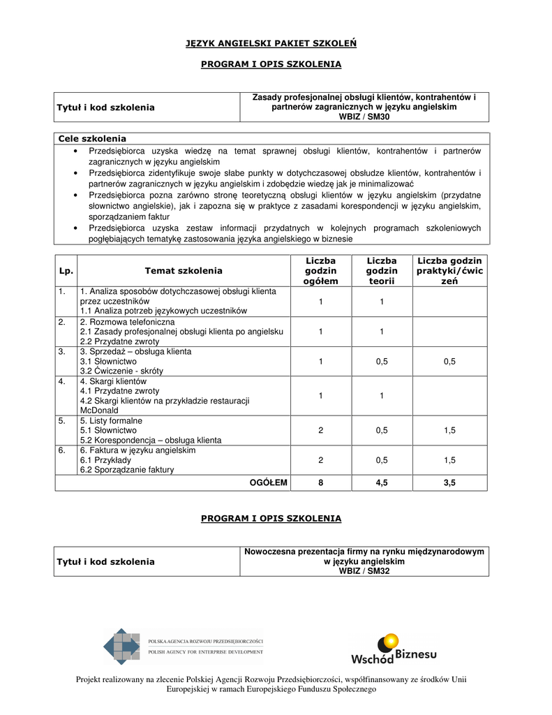 JĘZYK ANGIELSKI PAKIET SZKOLEŃ PROGRAM I OPIS SZKOLENIA Zasady profesjonalnej obsługi klientów, kontrahentów i partnerów zagranicznych w języku angielskim WBIZ / SM30 Tytuł i kod szkolenia Cele szkolenia • Przedsiębiorca uzyska wiedzę na temat sprawnej obsługi klientów, kontrahentów i partnerów zagranicznych w języku angielskim • Przedsiębiorca zidentyfikuje swoje słabe punkty w dotychczasowej obsłudze klientów, kontrahentów i partnerów zagranicznych w języku angielskim i zdobędzie wiedzę jak je minimalizować • Przedsiębiorca pozna zarówno stronę teoretyczną obsługi klientów w języku angielskim (przydatne słownictwo angielskie), jak i zapozna się w praktyce z zasadami korespondencji w języku angielskim, sporządzaniem faktur • Przedsiębiorca uzyska zestaw informacji przydatnych w kolejnych programach szkoleniowych pogłębiających tematykę zastosowania języka angielskiego w biznesie Lp. 1. 2. 3. 4. 5. 6. Temat szkolenia 1. Analiza sposobów dotychczasowej obsługi klienta przez uczestników 1.1 Analiza potrzeb językowych uczestników 2. Rozmowa telefoniczna 2.1 Zasady profesjonalnej obsługi klienta po angielsku 2.2 Przydatne zwroty 3. Sprzedaż – obsługa klienta 3.1 Słownictwo 3.2 Ćwiczenie - skróty 4. Skargi klientów 4.1 Przydatne zwroty 4.2 Skargi klientów na przykładzie restauracji McDonald 5. Listy formalne 5.1 Słownictwo 5.2 Korespondencja – obsługa klienta 6. Faktura w języku angielskim 6.1 Przykłady 6.2 Sporządzanie faktury OGÓŁEM Liczba godzin ogółem Liczba godzin teorii Liczba godzin praktyki/ćwic zeń 1 1 1 1 1 0,5 1 1 2 0,5 1,5 2 0,5 1,5 8 4,5 3,5 0,5 PROGRAM I OPIS SZKOLENIA Tytuł i kod szkolenia Nowoczesna prezentacja firmy na rynku międzynarodowym w języku angielskim WBIZ / SM32 Projekt realizowany na zlecenie Polskiej Agencji Rozwoju Przedsiębiorczości, współfinansowany ze środków Unii Europejskiej w ramach Europejskiego Funduszu Społecznego Cele szkolenia • Przedsiębiorca uzyska wiedzę na temat przygotowywania profesjonalnej prezentacji firmy w języku angielskim • Przedsiębiorca zidentyfikuje swoje słabe punkty w dotychczasowym przygotowywaniu informacji o firmie dla zagranicznych partnerów, klientów i zdobędzie wiedzę jak je minimalizować • Przedsiębiorca pozna zarówno stronę teoretyczną przygotowywania profesjonalnej prezentacji firmy w języku angielskim (przydatne słownictwo angielskie), jak i zapozna się w praktyce z przykładami, które mogą okazać się niezbędne do profesjonalnej prezentacji firmy • Przedsiębiorca uzyska zestaw informacji przydatnych w kolejnych programach szkoleniowych pogłębiających tematykę zastosowania języka angielskiego w biznesie • Przedsiębiorca uzyska wiedzę na temat profesjonalnej autoprezentacji pracowników • Przedsiębiorca pozna zarówno stronę teoretyczną przygotowywania dokumentacji dotyczącej pracowników, w języku angielskim (przydatne słownictwo angielskie), jak i zapozna się w praktyce ze sporządzaniem powyższych dokumentów. Lp. Temat szkolenia 1. Analiza sposobów dotychczasowej prezentacji firmy przez uczestników 1.1 Analiza potrzeb językowych uczestników 2. Profesjonalna prezentacja 2.1 Zawartość prezentacji 2. 2.2 Słownictwo - Opis firmy 2.3 Słownictwo - Firma i produkty 3. Użyteczne zwroty angielskie wspierające pokaz 3. audiowizualny 4. Pierwsze minuty prezentacji - Przydatne zwroty 5. Organizowanie prezentacji - Przydatne zwroty 4. 6. Przechodzenie do kolejnych części prezentacji Przydatne zwroty 7. Efektywne prezentowanie - Przydatne zwroty 8. Utrzymanie zainteresowania- Przydatne zwroty 5. 9. Radzenie sobie z problemami i pytaniami Przydatne zwroty 6. 10. Podsumowanie i konkluzje - Przydatne zwroty 7. 11. Słownictwo - Struktura firmy 8. 12. Przykładowa prezentacja i jej elementy 9. 13. Ćwiczenie - Przygotowywanie prezentacji 14. Przydatne zwroty Diagramy i trendy 10. 15. Ćwiczenia 16. Analiza dokumentów przygotowanych przez 11. uczestników w języku angielskim 16.1 Analiza potrzeb językowych uczestników 1. Liczba godzin ogółem Liczba godzin teorii 0,5 0,5 1 Liczba godzin praktyki/ćwic zeń 1 0,5 0,5 1 1 1 1 0,5 0,5 1 1 0,5 1 0,5 0,5 0,5 17. Profesjonalne CV w języku angielskim 12. 17.1 Rodzaje CV 17.2 Analiza przykładowych CV 1 1 18. Europass – europejskie CV 13. 18.1 Analiza przykładów 18.2 Paszport językowy Europass 1 1 0,5 1 1 0,5 Projekt realizowany na zlecenie Polskiej Agencji Rozwoju Przedsiębiorczości, współfinansowany ze środków Unii Europejskiej w ramach Europejskiego Funduszu Społecznego 14. 19. Warsztaty - jak napisać europejskie CV w formacie Europass. 15. 20. List motywacyjny 20.1 Analiza przykładów 1,5 1 1,5 1 16. 21. Warsztaty – profesjonalny list motywacyjny 1 1 17. 22. Elementy autoprezentacji 1 1 18. 23. Dyskusja, pytania 1 1 16 9,5 OGÓŁEM 6,5 PROGRAM I OPIS SZKOLENIA Tytuł i kod szkolenia Business travel – zagraniczne podróże służbowe WBIZ / SM29 Cele szkolenia • Przedsiębiorca uzyska wiedzę na temat sprawnej organizacji zagranicznych wyjazdów służbowych • Przedsiębiorca zidentyfikuje swoje słabe punkty w dotychczasowej organizacji służbowych wyjazdów zagranicznych i zdobędzie wiedzę, jak je minimalizować • Przedsiębiorca pozna zarówno stronę teoretyczną organizacji delegacji zagranicznych (przydatne słownictwo angielskie), jak i zapozna się w praktyce z podstawowymi formularzami i materiałami, jakie mogą okazać się niezbędne do profesjonalnej organizacji wyjazdu • Przedsiębiorca uzyska zestaw informacji przydatnych w kolejnych programach szkoleniowych pogłębiających tematykę zastosowania języka angielskiego w biznesie Lp. 1. 2. 3. 4. Temat szkolenia 1. Analiza organizowanych zagranicznych podróży służbowych 2. Podróż 2.1. Przydatne zwroty (lotnisko, podróż samolotem) 3. Ćwiczenie - formularz dotyczący zagubionego bagażu 4. Podróż - przydatne zwroty 4.1. Zakup biletu 4.2. Podr