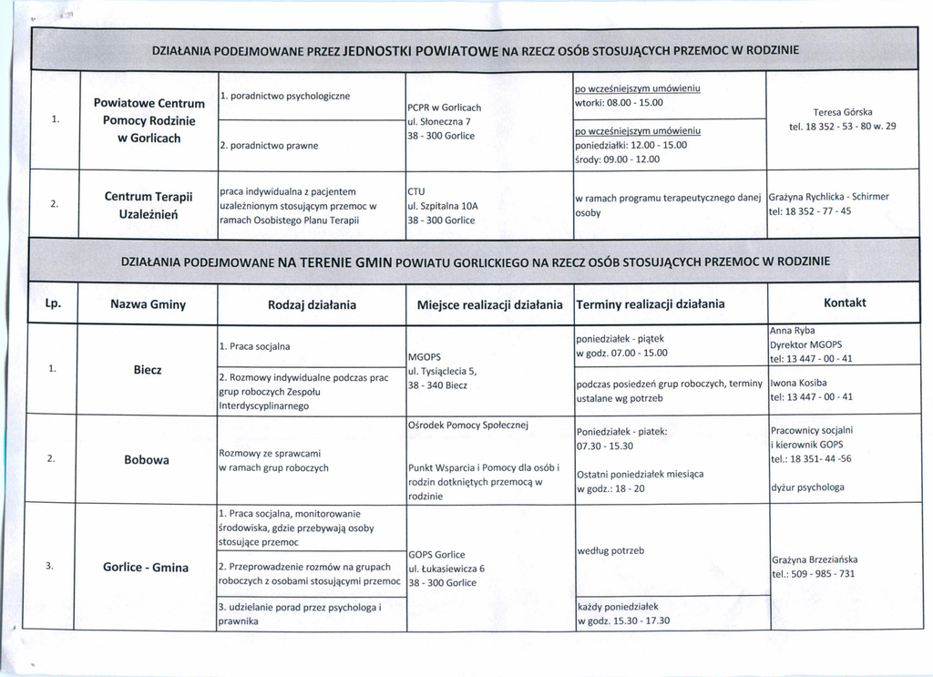 '" DZIAŁANIA PODEJMOWANE PRZEZ JEDNOSTKI POWIATOWE Powiatowe Centrum 1. Gorlicach po wcześniejszym umówieniu 1. poradnictwo psychologiczne PCPRw Gorlicach Pomocy Rodzinie W NA RZECZ OSÓB STOSUJĄCYCH PRZEMOC W RODZINIE wtorki: 08.00 - 15.00 Teresa Górska ul. Słoneczna 7 38 - 300 Gorlice 2. poradnictwo prawne po wcześniejszym umówieniu tel. 18 352 - 53 - 80 w. 29 poniedziałki: 12.00 - 15.00 środy: 09.00 - 12.00 2. Centrum Terapii Uzależnień praca indywidualna z pacjentem CTU uzależnionym stosującym przemoc w ul. Szpitalna 10A ramach Osobistego Planu Terapii 38 - 300 Gorlice w ramach programu terapeutycznego danej Grażyna Rychlicka - Schirmer tel: 18 352 - 77 - 45 osoby DZIAŁANIA PODEJMOWANE NA TERENIE GMIN POWIATU GORLICKIEGO NA RZECZ OSÓB STOSUJĄCYCH PRZEMOC W RODZINIE Lp. Nazwa Gminy Rodzaj działania Miejsce realizacji działania poniedziałek - piątek 1. Praca socjalna MGOPS 1. Biecz 2. Rozmowy indywidualne podczas prac grup roboczych Zespołu 38 - 340 Biecz Ośrodek Pomocy Społecznej Bobowa Dyrektor MGOPS tel: 13 447 - 00 - 41 podczas posiedzeń grup roboczych, terminy Iwona Kosiba ustalane wg potrzeb tel: 13 447 - 00 - 41 Poniedziałek - piatek: Pracownicy socjalni 07.30 - 15.30 Rozmowy ze sprawcami w ramach grup roboczych w godz. 07.00 - 15.00 Anna Ryba ul. Tysiąclecia 5, Interdyscyplinarnego 2. Kontakt Terminy realizacji działania i kierownik GOPS tel.: 18351- 44 -56 Punkt Wsparcia i Pomocy dla osób i rodzin dotkniętych przemocą w rodzinie Ostatni poniedziałek miesiąca w godz.: 18 - 20 dyżur psychologa 1. Praca socjalna, monitorowanie środowiska, gdzie przebywają osoby stosujące przemoc GOPSGorlice 3. Gorlice - Gmina 2. Przeprowadzenie rozmów na grupach ul. Łukasiewicza 6 roboczych z osobami stosującymi przemoc 38 - 300 Gorlice według potrzeb Grażyna Brzeziańska tel.: 509 - 985 - 731 3. udzielanie porad przez psychologa i każdy poniedziałek prawnika w godz. 15.30 - 17.30 - I poniedziałek - czwartek: Poradnictwo socjalne 4. Punkt Informacji, Wsparcia i Pomocy dla osób dotkniętych Gorlice - Miasto Poradnictwo prawne przemocą w rodzinie 07.30 - 17.30 piątek: 07.30 - 15.00 wtorek, czwartek: 15.30 - 17.30 Praca socjalna 18 352 - 05 - 10 18 352 - 03 - 11 ul. Reymonta 1, Gorlice Poradnictwo psychologiczne pracownicy MOPS: tel.: 666 - 512 - 455 środa: 10.00 - 13.00 GOPSLipinki poniedziałek - piątek: 38 - 305 Lipinki 44 07.00 - 15.00 pracownik socjalny z danego terenu tel.: 13 447 - 78 - 92 procedura niebieskiej karty; informowanie o programie korekcyjno edukacyjnym; praca w grupach roboczych / zespole Zespół Interdyscyplinarny Gminy Lipinki 38 - 305 Lipinki 44 interdyscyplinarnym z osobą podejrzaną o 5. Lipinki Praca w grupach roboczych / zespole interdyscyplinarnym od założenie niebieskiej Przewodnicząca Zespołu Interdyscyplinarnego karty do zakończenia procedury Barbara Cichy informacje udzielane tel.: 601 - 610 - 031 w godz. 07.00 - 15.00 stosowanie przemocy Przewodniczący GKRPA Poradnictwo, informowanie o możliwościach podjęcia leczenia lub terapii, kierowniae na leczeni z uzależnienia Gminna Komisja Rozwiązywania Problemów Alkoholowych 38 305 Lipinki 53 w Lipinkach poniedziałek - piątek: Leszek Litwa 07.30 - 15.30 Renata Żyrkowska tel.: 13 447 - 70- 21 Poradnictwo, wsparcie dla osób uzależnionych oraz członków rodzin dotkniętych problemem alkoholowym Punkt Konsultacyjny dla osób uzależnionych i ich rodzin oraz dla ofiar przemocy domowej wynikającej z uzależnienia w każdy poniedziałek: Terapeuta w Lipinkach - w godz. 10.00 - 13.00 Urszula Rąpała w Krygu - w godz. 14.00 - 15.00 w czasie dyżuru w Lipinkach tel.: 13 447 - 70 - 21 Pracownicy socjalni: poniedziałek: 08.00 - 15.00 wtorek: 07.00 - 15.00 Poradnictwo, informacja, praca socjalna 6. Łużna działanie realizowane przez pracowików GOPSŁużna GOPSŁużna 38 - 322 Łużna 634 środa: 15.00 - 17.00 Danuta Łukasik czwartek - piątek: 07.00 - 15.00 tel.: 18354 - 30 - 41 w.302 lub 666 - 370 - 953 Psycholog: 2 razy w miesiącu - wtorek, zgodnie z ustalonym harmonogramem • • Poradnictwo, terapia indywidualna, wsparcie dla osób agresywnych oraz 6. Łuina stosujących przemoc, program korekcyjno edukacyjny oraz spotkania motywacyjne dla osób stosujących przemoc 1. Rozmowy ze sprawcami w ramach grup roboczych 7. Moszczenica 2. informowanie Sekteratariat: Sądecki Ośrdek Interwencji Kryzysowej, 33 - 300 Nowy Sącz, termin spotkania ustalany indywidualnie w ul.ŚSniadeckich 10a, na podstawie godz. pracy ośrodka 07.00 - 16.00 umowy zawartej z GOPS tel. 18449 - 04 - 90 Dział Terapii Przecidziałania Agresji: tel.: 18449 - 04 - 91 GOPS Moszczenica Poniedziałek - piątek: Pracownicy socjalni GOPS 38 -321 Moszczenica 618 7.30. do 15. 30 tel.: 18 35 - 41 - 240 o instytucjach Przewodniczący Zespołu udzielających wsparcia Punkt Informacji i Wsparcia w rozwiązywaniu problemu doznających przemocy dla osób Czwartki: 09.00 - 11.00 mgr Katarzyna Firszt 38 -321 Moszczenica 618 18 354 - 12 - 40 Wtorki: 15.30. - 16.30 3. poradnictwo i pomoc socjalna Interdyscyplinarnego całodobowo: 515 - 850 - 720 Przewodnicząca Zespołu 8. Ropa Działania prowadzone w ramach Zespołu Zespół Interdyscyplinarny Gminy Ropa Interdyscyplinarnego 38 - 312 Ropa 733 wg potrzeb Interdyscyplinarnego Marta Włodarczyk-Deć tel.: 18353 - 41- 71 Poradnictwo, informowanie o możliwościach leczenia, terapii, udziału w programach 9. GOPSSękowa poniedziałek: 08.00 - 16.00 Pracownicy socjalni 38 -307 Sękowa 252 wtorek - piątek: 07.30 - 15.30 tel.:18 351 - 80 - 10 Sękowa Rozmowy motywujące do podjęcia leczenia odwykowego, udziału w programie korekcyjno - edukacyjnym Urząd Gminy Sękowa 38 - 307 Sękowa 252 Terapeuta poniedziałek: 08.00 - 10.00 Beata Rączkowska tel.: 18351- 80 -16 w. 32 Prowadzenie działań w ramach procedury Niebieskiej Karty poradnictwo, praca socjalna, informowanie 10. Uście Gorlickie Ośrodek Pomocy Społecznej, poniedziałek - piątek: korekcyjno-edukacy