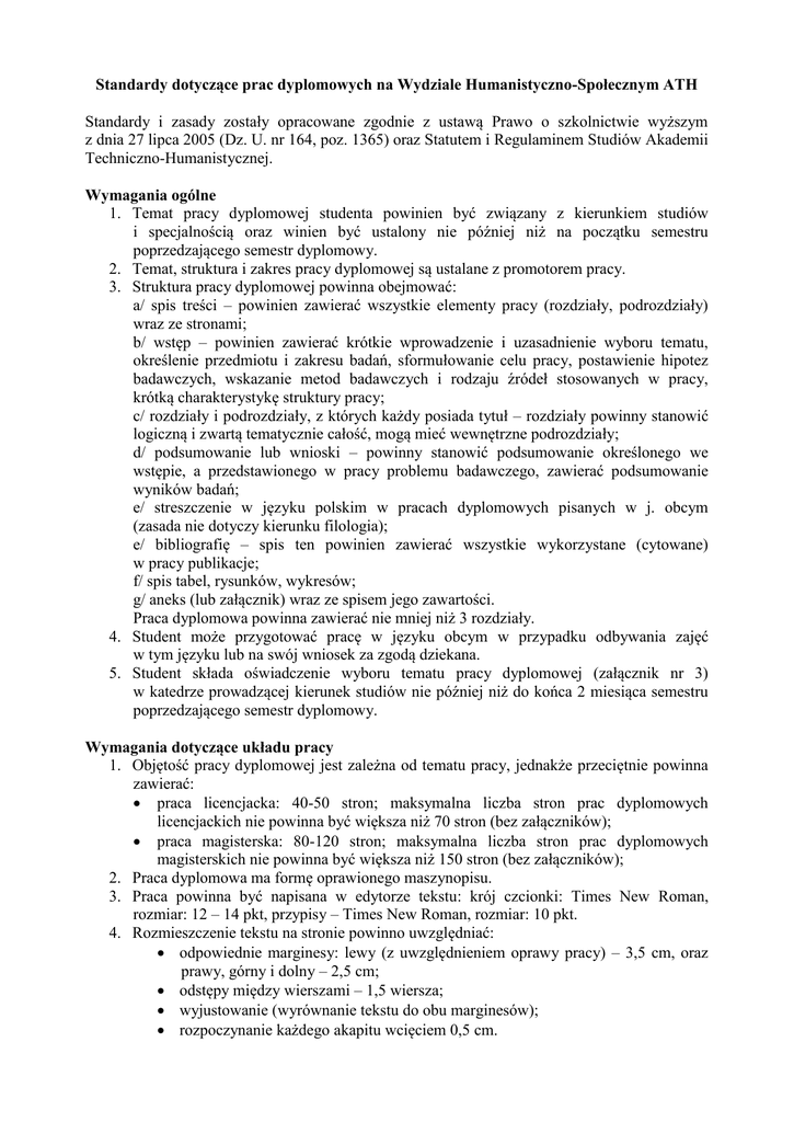 Standardy dotyczące prac dyplomowych na Wydziale Humanistyczno-Społecznym ATH Standardy i zasady zostały opracowane zgodnie z ustawą Prawo o szkolnictwie wyższym z dnia 27 lipca 2005 (Dz. U. nr 164, poz. 1365) oraz Statutem i Regulaminem Studiów Akademii Techniczno-Humanistycznej. Wymagania ogólne 1. Temat pracy dyplomowej studenta powinien być związany z kierunkiem studiów i specjalnością oraz winien być ustalony nie później niż na początku semestru poprzedzającego semestr dyplomowy. 2. Temat, struktura i zakres pracy dyplomowej są ustalane z promotorem pracy. 3. Struktura pracy dyplomowej powinna obejmować: a/ spis treści – powinien zawierać wszystkie elementy pracy (rozdziały, podrozdziały) wraz ze stronami; b/ wstęp – powinien zawierać krótkie wprowadzenie i uzasadnienie wyboru tematu, określenie przedmiotu i zakresu badań, sformułowanie celu pracy, postawienie hipotez badawczych, wskazanie metod badawczych i rodzaju źródeł stosowanych w pracy, krótką charakterystykę struktury pracy; c/ rozdziały i podrozdziały, z których każdy posiada tytuł – rozdziały powinny stanowić logiczną i zwartą tematycznie całość, mogą mieć wewnętrzne podrozdziały; d/ podsumowanie lub wnioski – powinny stanowić podsumowanie określonego we wstępie, a przedstawionego w pracy problemu badawczego, zawierać podsumowanie wyników badań; e/ streszczenie w języku polskim w pracach dyplomowych pisanych w j. obcym (zasada nie dotyczy kierunku filologia); e/ bibliografię – spis ten powinien zawierać wszystkie wykorzystane (cytowane) w pracy publikacje; f/ spis tabel, rysunków, wykresów; g/ aneks (lub załącznik) wraz ze spisem jego zawartości. Praca dyplomowa powinna zawierać nie mniej niż 3 rozdziały. 4. Student może przygotować pracę w języku obcym w przypadku odbywania zajęć w tym języku lub na swój wniosek za zgodą dziekana. 5. Student składa oświadczenie wyboru tematu pracy dyplomowej (załącznik nr 3) w katedrze prowadzącej kierunek studiów nie później niż do końca 2 miesiąca semestru poprzedzającego semestr dyplomowy. Wymagania dotyczące układu pracy 1. Objętość pracy dyplomowej jest zależna od tematu pracy, jednakże przeciętnie powinna zawierać: praca licencjacka: 40-50 stron; maksymalna liczba stron prac dyplomowych licencjackich nie powinna być większa niż 70 stron (bez załączników); praca magisterska: 80-120 stron; maksymalna liczba stron prac dyplomowych magisterskich nie powinna być większa niż 150 stron (bez załączników); 2. Praca dyplomowa ma formę oprawionego maszynopisu. 3. Praca powinna być napisana w edytorze tekstu: krój czcionki: Times New Roman, rozmiar: 12 – 14 pkt, przypisy – Times New Roman, rozmiar: 10 pkt. 4. Rozmieszczenie tekstu na stronie powinno uwzględniać: odpowiednie marginesy: lewy (z uwzględnieniem oprawy pracy) – 3,5 cm, oraz prawy, górny i dolny – 2,5 cm; odstępy między wierszami – 1,5 wiersza; wyjustowanie (wyrównanie tekstu do obu marginesów); rozpoczynanie każdego akapitu wcięciem 0,5 cm. 5. Każdy nowy rozdział powinien rozpoczynać się od nowej strony. Przyjęcie pracy dyplomowej 1. Seminaria dyplomowe prowadzą i promotorstwo prac dyplomowych sprawują profesorowie, doktorzy habilitowani lub doktorzy. 2. Bezpośrednią opiekę nad wykonaniem pracy dyplomowej sprawuje promotor. 3. Promotor, w ramach opieki nad pracą dyplomową, pomaga dyplomantowi w ustaleniu tematu pracy, jej planu i struktury, wskazaniu metod badania, pomaga interpretować wyniki oraz określa podstawowe zasady pisania pracy dyplomowej i ostateczną jej redakcję. 4. Pracę dyplomową przyjmuje promotor. Przyjęcie pracy poświadcza podpisem na stronie tytułowej. 5. Zaliczenie seminarium dyplomowego nie może być uwarunkowane złożeniem pracy dyplomowej. 6. Kopie pracy dyplomowej należy złożyć: - w dziekanacie, - u promotora, - u recenzenta bądź w katedrze prowadzącej dany kierunek. 7. Praca dyplomowa składana jest w dziekanacie wydziału najpóźniej 7 dni przed planowanym terminem obrony. a/ Egzemplarz składany w dziekanacie powinien być wydrukowany dwustronnie, w miękkiej oprawie i zawierać: - oświadczenie dyplomanta o samodzielnym wykonaniu pracy (załącznik nr 2); - płytę CD w kopercie zawierającą tekst pracy dyplomowej (format PDF), naklejoną na ostatniej stronie pracy. b/ Wraz z pracą dyplomową należy złożyć: - 4 zdjęcia formatu 45 x 65 mm; - opłatę za dyplom (należy jej dokonać na indywidualne konto studenta). Indeks z wszystkimi wymaganymi wpisami należy złożyć nie później niż 7 dni przez wyznaczonym terminem egzaminu dyplomowego; 8. Oceny pracy magisterskiej dokonuje promotor oraz jeden recenzent wyznaczony przez dziekana. Przynajmniej jeden z oceniających pracę powinien mieć tytuł naukowy, stopień naukowy doktora habilitowanego lub być zatrudnionym na stanowisku profesora nadzwyczajnego. Praca licencjacka może być oceniana przez recenzenta ze stopniem naukowym doktora. 9. Promotor i recenzent zobowiązani są do złożenia recenzji pracy dyplomowej nie później niż 3 dni przed planowanym egzaminem dyplomowym. Warunki przystąpienia do egzaminu dyplomowego 1. Warunkiem dopuszczenia do egzaminu dyplomowego jest: a/ uzyskanie zaliczenia z wszystkich przedmiotów przewidzianych w programie studiów oraz wpisu dziekana do indeksu o zaliczeniu ostatniego semestru; b/ przyjęcie pracy dyplomowej przez promotora i złożenie jej w dziekanacie; c/ przekazanie przez dziekanat komisji egzaminacyjnej kompletu dokumentów, który obejmuje indeks, protokół egzaminu dyplomowego oraz recenzje pracy dyplomowej. Egzamin dyplomowy 1. Termin egzaminu dyplomowego ustala dziekan na wniosek promotora. 2. Egzamin dyplomowy odbywa się przed powołaną przez dziekana komisją, w składzie: przewodniczący komisji, promotor, recenzent oraz członek komisji. 3. Egzamin dyplomowy jest egzaminem ustnym. Zakres egzaminu dyplomowego u