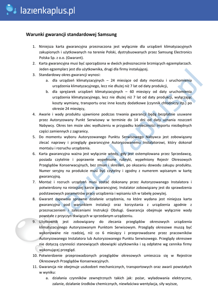 Warunki gwarancji standardowej Samsung 1. Niniejsza karta gwarancyjna przeznaczona jest wyłącznie dla urządzeń klimatyzacyjnych zakupionych i użytkowanych na terenie Polski, dystrybuowanych przez Samsung Electronics Polska Sp. z o.o. (Gwarant). 2. Karta gwarancyjna musi być sporządzona w dwóch jednoznacznie brzmiących egzemplarzach. Jeden egzemplarz jest dla użytkownika, drugi dla firmy instalującej. 3. Standardowy okres gwarancji wynosi: a. dla urządzeń klimatyzacyjnych – 24 miesiące od daty montażu i uruchomienia urządzenia klimatyzacyjnego, lecz nie dłużej niż 7 lat od daty produkcji, b. dla sprężarek urządzeń klimatyzacyjnych – 60 miesięcy od daty uruchomienia urządzenia klimatyzacyjnego, lecz nie dłużej niż 7 lat od daty produkcji, wyłączając koszty wymiany, transportu oraz inne koszty dodatkowe (czynnik chłodniczy itp.) po okresie 24 miesięcy, 4. Awarie i wady produktu ujawnione podczas trwania gwarancji będą bezpłatnie usuwane przez Autoryzowany Punkt Serwisowy w terminie do 14 dni od daty uznania roszczeń Nabywcy. Okres ten może ulec wydłużeniu w przypadku konieczności importu niezbędnych części zamiennych z zagranicy. 5. Do momentu wyboru Autoryzowanego Punktu Serwisowego Nabywca jest zobowiązany zlecać naprawy i przeglądy gwarancyjne Autoryzowanemu Instalatorowi, który dokonał montażu i rozruchu urządzenia. 6. Karta gwarancyjna ważna jest wyłącznie wtedy, gdy jest ostemplowana przez Sprzedawcę, posiada czytelnie i poprawnie wypełnione rubryki, wypełniony Rejestr Okresowych Przeglądów Konserwacyjnych, bez zmian i skreśleń, po okazaniu dowodu zakupu produktu. Numer seryjny na produkcie musi być czytelny i zgodny z numerem wpisanym w kartę gwarancyjną. 7. Montaż i rozruch urządzeń musi zostać dokonany przez Autoryzowanego Instalatora i potwierdzony na niniejszej karcie gwarancyjnej. Instalator zobowiązany jest do sprawdzenia podstawowych parametrów pracy urządzenia i wpisaniu ich w tabelę powyżej. 8. Gwarant zapewnia sprawne działanie urządzenia, na które wydana jest niniejsza karta gwarancyjna pod warunkiem instalacji oraz korzystania z urządzenia zgodnie z przeznaczeniem i zaleceniami Instrukcji Obsługi. Gwarancja obejmuje wyłącznie wady powstałe z przyczyn tkwiących w sprzedanym urządzeniu. 9. Użytkownik jest zobowiązany do zlecania przeglądów okresowych urządzenia klimatyzacyjnego Autoryzowanym Punktom Serwisowym. Przeglądy okresowe muszą być wykonywane nie rzadziej, niż co 6 miesięcy i przeprowadzane przez pracowników Autoryzowanego Instalatora lub Autoryzowanego Punktu Serwisowego. Przeglądy okresowe nie dotyczą czynności stanowiących obowiązki użytkownika i są odpłatne wg cennika firmy wykonującej przegląd. 10. Potwierdzenie przeprowadzonych przeglądów okresowych umieszcza się w Rejestrze Okresowych Przeglądów Konserwacyjnych. 11. Gwarancja nie obejmuje uszkodzeń mechanicznych, transportowych oraz awarii powstałych w wyniku: a. działania czynników zewnętrznych takich jak: pożar, wyładowania elektryczne, zalanie, działanie środków chemicznych, niewłaściwa wentylacja, siły wyższe, 12. 13. 14. 15. 16. 17. 18. 19. b. montażu, naprawy lub konserwacji urządzenia dokonywanych przez osoby nieuprawnione przez Gwaranta, c. innych będących poza kontrolą Gwaranta (np. wahania napięć, przepięcia sieci energetycznej, itd.). Gwarancja dotyczy tylko urządzenia i nie obejmuje instalacji czynnika chłodniczego, skroplin, zasilania i sterowania wykonywanych przez Autoryzowanego Instalatora, które to elementy systemu objęte są oddzielną rękojmią za wady zgodnie z przepisami kodeksu cywilnego. Gwarancji nie podlegają części urządzeń i akcesoriów podlegające zużyciu w czasie eksploatacji np. zarysowania, trudne do usunięcia zabrudzenia, wytarcia napisów itp. Instalacja, czyszczenie zewnętrzne jak i wewnętrzne, okresowa wymiana elementów przewidziana w instrukcji obsługi oraz konserwacja produktu są czynnościami odpłatnymi. W takich wypadkach koszty wezwania serwisu pokrywa użytkownik. Nabywca traci prawa gwarancyjne w przypadku: a. gdy karta gwarancyjna jest wypełniona nieprawidłowo, zamazana lub zniszczona, b. dokonania montażu, zmian konstrukcyjnych lub napraw poza Autoryzowanymi Instalatorem/Punktami Serwisowymi c. zerwania lub uszkodzenia założonych plomb, d. braku okresowych przeglądów według punktu 8. Sprzęt zainstalowany na stałe w miejscu użytkowania naprawiany jest u użytkownika w uzgodnionym terminie, lub w razie konieczności naprawy w serwisie, odbierany i dostarczany po naprawie transportem serwisu. W przypadku naprawy w miejscu użytkowania, użytkownik powinien zapewnić odpowiednie miejsce i warunki do dokonania naprawy. W przypadku zaginięcia karty gwarancyjnej nie wydaje się duplikatu. W sprawach nieuregulowanych warunkami niniejszej karty gwarancyjnej zastosowanie mają odpowiednie przepisy Kodeksu Cywilnego. Gwarancja nie wyłącza, nie ogranicza, ani nie zawiesza uprawnień kupującego wynikających z niezgodności towaru z umową. Warunki gwarancji rozszerzonej Samsung 1. Istnieje możliwość rozszerzenia okresu gwarancji dla urządzeń klimatyzacyjnych – do 60 miesięcy od daty montażu i uruchomienia urządzenia klimatyzacyjnego, lecz nie dłużej niż 7 lat od daty produkcji, wyłączając koszty wymiany, transportu oraz inne koszty dodatkowe (czynnik chłodniczy itp.). 2. Gwarancja zostanie rozszerzona po łącznym spełnieniu następujących warunków: a. system zostanie sprawdzony, uruchomiony oraz odebrany przez wykwalifikowanego pracownika Gwaranta lub inną uprawnioną do tego osobę (Autoryzowany Instalator/Autoryzowany Punkt Serwisowy), b. wypełniona zostanie tabela z pierwszej strony karty gwarancyjnej, c. produkt zostanie zarejestrowany w systemie Gwaranta (zgodnie z wytycznymi zamieszczonymi na stronie internetowej): http://www.samsung.com/pl/support/warranty/extendedWarrantyRegistrati