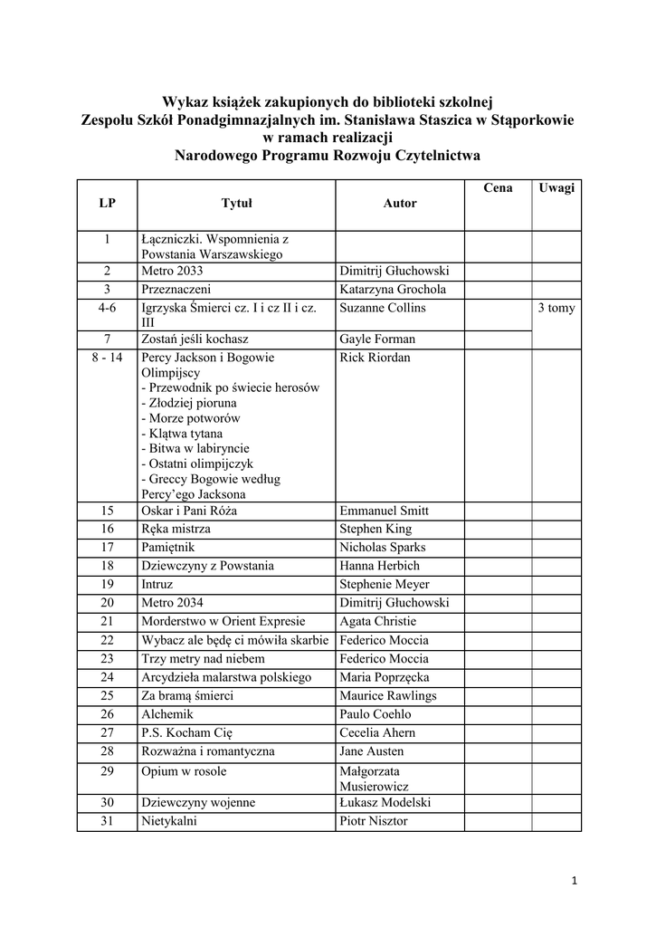 Wykaz książek zakupionych do biblioteki szkolnej Zespołu Szkół Ponadgimnazjalnych im. Stanisława Staszica w Stąporkowie w ramach realizacji Narodowego Programu Rozwoju Czytelnictwa Cena LP Tytuł 1 15 16 17 18 19 20 21 22 23 24 25 26 27 28 Łączniczki. Wspomnienia z Powstania Warszawskiego Metro 2033 Przeznaczeni Igrzyska Śmierci cz. I i cz II i cz. III Zostań jeśli kochasz Percy Jackson i Bogowie Olimpijscy - Przewodnik po świecie herosów - Złodziej pioruna - Morze potworów - Klątwa tytana - Bitwa w labiryncie - Ostatni olimpijczyk - Greccy Bogowie według Percy’ego Jacksona Oskar i Pani Róża Ręka mistrza Pamiętnik Dziewczyny z Powstania Intruz Metro 2034 Morderstwo w Orient Expresie Wybacz ale będę ci mówiła skarbie Trzy metry nad niebem Arcydzieła malarstwa polskiego Za bramą śmierci Alchemik P.S. Kocham Cię Rozważna i romantyczna 29 Opium w rosole 30 31 Dziewczyny wojenne Nietykalni 2 3 4-6 7 8 - 14 Uwagi Autor Dimitrij Głuchowski Katarzyna Grochola Suzanne Collins 3 tomy Gayle Forman Rick Riordan Emmanuel Smitt Stephen King Nicholas Sparks Hanna Herbich Stephenie Meyer Dimitrij Głuchowski Agata Christie Federico Moccia Federico Moccia Maria Poprzęcka Maurice Rawlings Paulo Coehlo Cecelia Ahern Jane Austen Małgorzata Musierowicz Łukasz Modelski Piotr Nisztor 1 32 33 - 41 Flanagan John Georgie R. R. Martin 42 43 44 45 46 Zwiadowcy Saga Pieśń lodu i ognia - Gra o tron - Starcie królów - Nawałnica mieczy. Stal i śnieg - Nawałnica mieczy. Krew i złoto - Uczta dla wron. Cienie śmierci - Uczta dla wron. Sieć spisków - Taniec ze smokami. Część I - Taniec ze smokami. Część II - Wichry zimy Sezon Burz To, co bezcenne Jeździec miedziany Pachnidło Opowieści z Narni siedmioksiąg 47 48 49 50 Jane Eyre Przebudzenie Christine Sklepik z marzeniami Charlotte Bronte Anthony de Mello Stephen King Stephen King 51 Tomasz Pruszak 52 Ziemiańskie święta i zabawy. Tradycje karnawałowe, ślubne, dożynkowe i inne Bóg nigdy nie mruga 53 54 Kwiat pustyni Nadzieje i marzenia Dirie Waris Magdalena Kordel 55 Niebo istnieje naprawdę 56 57 58 59 60 61 Andrzej Sapkowski Daniel Steell Paullina Simons Patrick Süskind C. S.Lewis Regina Brett Todd Burpo, Lynn Vincent Miłość ponad czasem. Historia inna Niffenegger Audrey niż wszystkie Poczwarka Dorota Terakowska Łowca snów Stephen King Abonent czasowo niedostępny Ewa Ostrowska Scarlett Barbara Bavaldi Rewizja Remigiusz Mróz Czarne Skrzydła Kidd Sue Monk 62 63 64 Nienawiść Upalne lato Marianny Wszyst kie tomy Jannifer Brown Katarzyna Zyskowska - Ignaciak PWN DUBE L Wydaw nictwo Literac kie BRAK 2 Sławomir koper Norman Davies Andrzej Chwalba Wiesław Adamczyk Magdalena Grzebałkowska Joanna Wieliczka Szarkowa Agnieszka Krawczyk Patrycja Bukalska Fitz Patrick Beca 65 66 67 68 69 Bodo Europa Historia Powszechna 1989 - 2011 Kiedy Bóg odwrócił wzrok 1945 Wojna i Pokój 70 Wołyń we krwi 1943 71 72 73 74 Siostry Sierpniowe dziecko ‘44 Niebezpieczne kłamstwa Nowe formy i normy czyli poprawna polszczyzna w praktyce 75 Polska poezja miłosna 76 Komunikacja językowa w Internecie Niebo istnieje… naprawdę! Jan Grzenia Bądź swoją siłą przez 365 dni w roku Kalejdoskop Imię mojej miłości PS Kocham Cię Love, Rosie Druga wojna światowa Największy wróg Hitlera Demi Lorato 77 78 79 80 81 82 83 84 85 Rotmistrz Pilecki. Ochotnik do Auschwitz 86 Targowisko próżności 87-90 Seria Niezgodna - Niezgodna - Zbuntowana - Wierna - Cztery 91 - 96 Książki Nicholasa Sparksa - Noce w w Rodanthe - Szczęściarz - Ostatnia piosenka - Na zakręcie - Jesienna miłość 97 - 101 Książki Johna Greena PWN Rebis PWN Burpo Tood MART EL PWN 2016 Dom Wydaw niczy Rafael Daniel Steel Lynn Sandi Cecelia Ahern Cecelia Ahern Antony Beevor Bogusława Wołoszański Adam Cyran Vanity Fair V. Roth 3 - Gwiazd naszych wina - 19 razy Katherine - Papierowe miasta - W śnieżną noc - Will Grayson, Will Grayson 102 Czesałam ciepłe króliki. Rozmowa z Alicją GawlikowskąŚwierczyńską 103-107 Saga Dom Nocy - Klątwa Neferet - Upadek Kalony - Przysięga Smoka - Naznaczona - Zdradzona 108 Więcej niż brzydka 109 Komunikacja językowa w internecie 110 Ćwiczenia z retoryki 122 123 Grzeczność w komunikacji językowej Hanemann Język w komunikowaniu Podróżnik WC wydanie II poprawione z 2015r. ABC pewności siebie i atrakcyjności Poczta polska. Jak to się zaczęło. Scenariusze przedstawień dla gimnazjum i liceum Szeptucha Troja. Upadek królów W służbie III Rzeszy Królowa Mafii Mężczyźni są z Marsa, kobiety z Wenus Złota skóra Ocalić jeńców 124 125 126 Znieczulenie Pielgrzym Życie na pełnej petardzie 127 128 Złudzednie Zakonnice odchodzą po cichu 111 112 113 114 115 116 117 118 119 120 121 Dariusz Zaborek Konstance Briscoe Jan Grzenia PWN Maria Załęska, Agnieszka Budzyńska - Daca Małgorzata Marcjanik PWN Stefan Chwin Marian Bugajski Wojciech Cejrowski Krzysztof Król, Jan Gajos Anna Kurnicka PWN Helion IMPUL S Katarzyna Miszczuk Dawid Gemmell Karl H. Schlesier Piotr Pytlakowski John Gray Carla Montero Lee Trimble, Eremy Dronfield Robin Cook Terry Hades Kaczkowski Jan, Żyłka Piotr Charlotte Link Marta Abramowicz 4 129 130 131 132 133 134 135 136 137 138 139 140 141 142 143 144 145 146 147 148 O Wisławie Szybborskiej Jeszcze czego! Nienachalna z urody Żywa woda Czarna samica kruka Wszystkie marzenia świata Okularnik Sprawa Niny Frank Arabska krucjata Arabska córka Arabska księżniczka Arabska krew Arabska żona Wichrowe wzgórza Bóg nigdy nie mruga Bohaterowie są zmęczeni Zabójca Hubal Upadłe damy II Rzeczypospolitej Ty jesteś moje imię 149 150 151 Mała matura Ono Siostry 152 153 Aleksandra Imię róży Rusinek Michał Paulina Młynarska Maria Czubaszek Jan Parandyk Dariusz Pawłowki Theresa Revay Katarzyna Bonda Katarzyna Bonda Tanya Valko Tanya Valko Tanya Valko Tanya Valko Tanya Valko Emily Bronte Regina Brett Maria Nurowska Maria Nurowska Jacek Komuda Kamil Janicki Katarzyna Zyskowsk