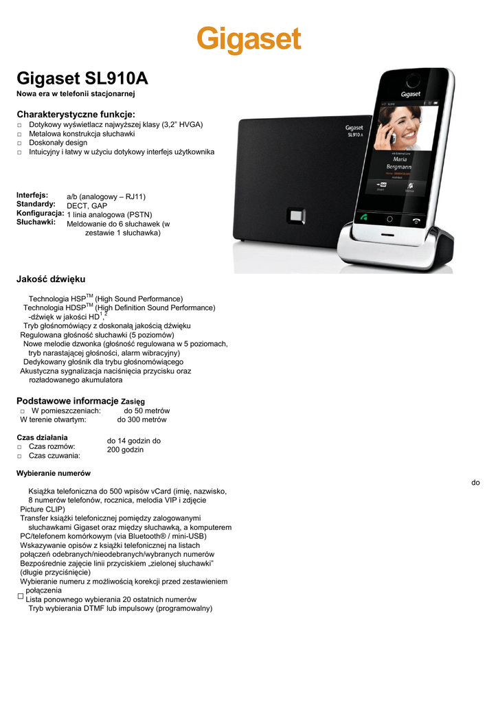 Gigaset Gigaset SL910A Nowa era w telefonii stacjonarnej Charakterystyczne funkcje: □ □ □ □ Dotykowy wyświetlacz najwyższej klasy (3,2” HVGA) Metalowa konstrukcja słuchawki Doskonały design Intuicyjny i łatwy w użyciu dotykowy interfejs użytkownika Interfejs: Standardy: Konfiguracja: Słuchawki: a/b (analogowy – RJ11) DECT, GAP 1 linia analogowa (PSTN) Meldowanie do 6 słuchawek (w zestawie 1 słuchawka) Jakość dźwięku TM Technologia HSP (High Sound Performance) TM Technologia HDSP (High Definition Sound Performance) 1 2 -dźwięk w jakości HD , Tryb głośnomówiący z doskonałą jakością dźwięku Regulowana głośność słuchawki (5 poziomów) Nowe melodie dzwonka (głośność regulowana w 5 poziomach, tryb narastającej głośności, alarm wibracyjny) Dedykowany głośnik dla trybu głośnomówiącego Akustyczna sygnalizacja naciśnięcia przycisku oraz rozładowanego akumulatora Podstawowe informacje Zasięg □ W pomieszczeniach: W terenie otwartym: Czas działania □ Czas rozmów: □ Czas czuwania: do 50 metrów do 300 metrów do 14 godzin do 200 godzin Wybieranie numerów do Książka telefoniczna do 500 wpisów vCard (imię, nazwisko, 8 numerów telefonów, rocznica, melodia VIP i zdjęcie Picture CLIP) Transfer książki telefonicznej pomiędzy zalogowanymi słuchawkami Gigaset oraz między słuchawką, a komputerem PC/telefonem komórkowym (via Bluetooth® / mini-USB) Wskazywanie opisów z książki telefonicznej na listach połączeń odebranych/nieodebranych/wybranych numerów Bezpośrednie zajęcie linii przyciskiem „zielonej słuchawki” (długie przyciśnięcie) Wybieranie numeru z możliwością korekcji przed zestawieniem połączenia □ Lista ponownego wybierania 20 ostatnich numerów Tryb wybierania DTMF lub impulsowy (programowalny) Odbieranie połączeń 2 Identyfikacja numeru dzwoniącego CLIP 20 melodii dzwonka do wyboru: -15 melodii polifonicznych - 5 melodii standardowych - wgrywanie nowych przez Gigaset QuickSync Alarm wibracyjny Oddzielne ustawienie sygnału dzwonka dla połączeń VIP i połączeń wewnętrznych Wyciszanie sygnału dzwonka w zadanych godzinach („nie przeszkadzać” - nie dotyczy połączeń VIP i połączeń wewnętrznych) Wyciszanie połączeń z numerów zastrzeżonych Połączenia nieodebrane Sygnalizacja nowych połączeń nieodebranych na wyświetlaczu (centrum wiadomości) i miganiem diody LED Lista połączeń nieodebranych do 20 pozycji, z datą i godziną 2 połączenia Komfortowa obsługa listy (dotykowe przewijanie wpisów) Możliwość bezpośredniego oddzwonienia na numery zapisane na liście (brak konieczności wpisywania numeru) Łączność Stacja bazowa: □ DECT do 6 słuchawek □ 1 linia analogowa (PSTN) □ 1 interfejs LAN do aktualizacji oprogramowania stacji bazowej Słuchawka: □ DECT □ Interfejs PC (oprogramowanie Gigaset QuickSync) dostępny przez mini-USB (brak kabla w dostawie) lub Bluetooth® (profil połączenia szeregowego) □Transfer wpisów książki telefonicznej Microsoft Outlook zdjęć z komputera PC (do funkcji Picture CLIP) □Wgrywanie Możliwość bezpośredniego oddzwonienia na numery zapisane na liście (brak konieczności wpisywania numeru) 13.09.201 1 Wersja 2.0 Gigaset Funkcje dodatkowe □Plug&Play (rozpakuj, podłącz, naładuj i rozmawiaj) Wolnostojąca stacja bazowa □ Organizer: - kalendarz z funkcją przypomnienia - budzik z funkcją drzemki 2 - synchronizacja czasu z centralą telefoniczną (przez CLIP) Łatwy dostęp do list połączeń za pomocą dotykowego interfejsu użytkownika - listy połączeń: wszystkich, wychodzących, odebranych, nieodebranych (każda lista do 20 wpisów) □Babyfon / monitoring pomieszczenia Data i czas chronione w przypadku utraty zasilania □ Anteny wewnętrzne Klawiatura Klawiatura z trzema podświetlanymi przyciskami (odbieranie połączenia „zielona słuchawka”, menu, zakończenie połączenia „czerwona słuchawka”) Programowalne długie przyciśnięcie przycisku menu (domyślnie: blokada klawiatury) Wyświetlanie klawiatury kontekstowej na ekranie Funkcje SMS 2,6 □ Obsługa wiadomości SMS do 612 znaków □ Pamięć na ok. 50 wiadomości SMS 2 ECO-DECT 3 Wyświetlacz i menu Wyświetlacz Duży, doskonały wyświetlacz dotykowy TFT o przekątnej 3,2” i rozdzielczości HVGA (320x480) Znakomita czytelność pod każdym kątem dzięki technologii TFT-VA Ekran dotykowy w technologii pojemnościowej W trybie czuwania □ 3 przewijane pulpity do wyboru (patrz poniżej) Animowane wygaszacze ekranu, w tym zegar analogowy lub cyfrowy ze wskazaniem daty □ Przeglądarka zdjęć Możliwość personalizacji (wgrywanie własnej grafiki) W trybie bezczynności (3 pulpity do wyboru) □ Ekran informacji: prekonfigurowany zegar i data, ikony zapewniające komfortowy dostęp do ważnych funkcji i skróconego wybierania numerów (ze zdjęciami Picture CLIP) Ekran wybierania: klawiatura numeryczna , dostęp do ulubionych kontaktów, książki telefonicznej, listy połączeń, połączeń wewnętrznych Ekran wiadomości: dostęp do listy połączeń nieodebranych, 6 nagrań na automatycznej sekretarce, wiadomości SMS i opuszczonych terminów/przypomnień Pasek statusu (nad każdym z ekranów): stan naładowania akumulatora, siła sygnału, tryb ECO oraz szybki dostęp do przecisków włączających interfejs Bluetooth® , budzik, Babyfon, itd. W trakcie rozmowy □ Wyświetlanie statusu (naładowanie akumulatora, siła sygnału, itd.) □ Wyświetlanie przycisków do uruchamiania funkcji: Tryb głośnomówiący, wyciszenie, klawiatura numeryczna, połączenie konferencyjne □ Wyświetlanie czasu trwania rozmowy Menu □ Najwygodniejsze menu: dotykowy interfejs dla wszystkich aplikacji i ustawień telefonu □ Ikony z opisami w 28 językach □ Łatwa obsługa dzięki możliwości przewijania ekranów i list Do 60% niższe zużycie energii (energooszczędny zasilacz impulsowy na wyposażeniu) 4 Tryb ECO – manualna re