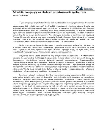 Zdradnik, polegający na błędnym przeciwzwrocie społecznym Natalia Dudkowiak Tytuł niniejszego artykułu to definicja terminu: taknietak. Stworzył go Bronisław Trentowski, językoznawca, który chciał „oczyścić” język polski z zapożyczeń z języków obcych. Z wielu jego bzdurnych, ale też nieco zabawnych haseł, przyjęła się i używana jest do dziś jedynie jaźń. Pogodzić musiał się zaś z utratą wielu, np.: chowanną, która miała zastąpić pedagogikę, czy myślinią, w miejsce logiki. Człowiek obdarzony głębokim umysłem miał nazywać się mysłowcem, a tamten świat (świat pośmiertny) to nic innego jak tameczność. Poza niezwykłą śmiałością w kombinatoryce językowej, Trentowski popełniał główny błąd przy tworzeniu definicji, tłumaczył hasła słowami ze swojego słownika, których już nie wyjaśniał. Niezrozumiałe terminy nie mogły się przyjąć, tak było z czerpańcem (‘samit pierwszy umysłników grzędy trzeciej’) czy taknietakiem. Ciężka praca przywołanego językoznawcy przypadła na przełom wieków XIX i XX, kiedy to, w związku z rozwojem technicznym i społecznym, gwałtownie wzrosło zapotrzebowanie na nowe słowa. Ogromna ich ilość wprowadzana była sztucznie, a przyjąć mogły się tylko takie, które respektowały reguły języka, np.: iloczyn, iloraz, cięciwa, średnica, odcinek. Oczywiście, nawet udane zmiany nie były przyjmowane bez sprzeciwu – niektórzy chcieli powrotu do nazewnictwa łacińskiego, bezskutecznie chciano udany termin czasownik (który był tłumaczeniem niemieckiego terminu Zeitwort) zastąpić sprawomianem. A szaleńcom klasy Trentowskiego wtórował Jacek Przybylski, profesor Akademii Krakowskiej, maniakalny producent nowych wyrazów, cechujący się brakiem umiaru i zdrowego rozsądku. Z jego pomysłów przyjął się tylko pomnik i wszechnica, a odrzucono wiele: językoślednię w miejsce gramatyki; rozczertnię zamiast interpunkcji. Wielką literę nazwać chciał bukwą wielkawą, sylabę – złogą, czasownik – głagołem, zdrabnianie – pieszczoceniem, a zgrubianie – grubaszeniem. Szczęściem o takich regulacjach decydują wewnętrzne zasady językowe, na które wywrzeć może wpływ jedynie społeczność użytkowników, a nie jednostka. Dziś spotykamy sie z podobnymi procesami. W języku zadomawiają się słowa potrzebne, ułatwiające ludziom komunikację, np.: telewizja, video, kserokopiarka, frustracja (tworzone z słów greckich i łacińskich), a prawdziwy szturm przypuszczają zapożyczenia z języków obcych (głównie angielskiego): folder, serial, weekend, komputer. Na co dzień nie zastanawiamy się nad tym, ale warto zwrócić uwagę, że to, co nas najbardziej śmieszy – w reklamie, kabarecie, dowcipie – zwykle ma charakter językowy, polega na łamaniu reguł, na sprytnej metaforyce, czy nawiązywaniu do skojarzeń pozajęzykowych: rarka plusa, wielka wyprz, czasoumilacz. Takie zabawne neologizmy naznaczają język potoczny. W użyciu pozostają krótko, ale za sprawą mediów są długo czytelne. -1-