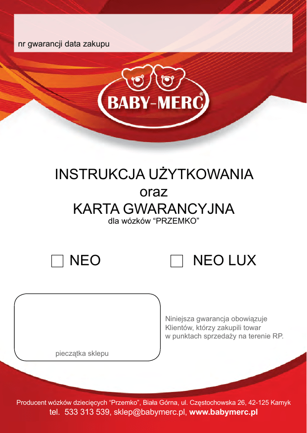 nr gwarancji data zakupu INSTRUKCJA UŻYTKOWANIA oraz KARTA GWARANCYJNA dla wózków “PRZEMKO” NEO NEO LUX Niniejsza gwarancja obowiązuje Klientów, którzy zakupili towar w punktach sprzedaży na terenie RP. pieczątka sklepu Producent wózków dziecięcych “Przemko”, Biała Górna, ul. Częstochowska 26, 42-125 Kamyk tel. 533 313 539, [email protected], www.babymerc.plwww.babymerc.pl SZANOWNI RODZICE Gratulujemy Państwu właściwego wyboru wózka dziecięcego Naszej firmy. Stworzyliśmy ten wózek z miłości do dzieci, a także by spełnić oczekiwania rodziców. Funkcjonalność i bezpieczeństwo Twojego dziecka, to dla Nas priorytet. Wózek został wykonany tylko z komponentów najwyższej jakości. Przed użytkowaniem należy dokładnie przeczytać niniejszą instrukcję i zachować ją na później. Bezpieczeństwo Twojego dziecka może być zagrożone, jeśli zalecenia instrukcji nie będą stosowane. WARUNKI GWARANCJI 1. Firma PPHU PRZEMKO udziela 24 miesięcy gwarancji na zakupiony przez Państwa wózek. 2. Gwarancja na sprzedany towar konsumpcyjny nie wyłącza, nie ogranicza ani nie zawiesza uprawnień Kupującego wynikających z niezgodności towaru z umową (DZ.U nr.141 poz.1176 ustawa z dnia 27.07.2002r. o szczególnych warunkach sprzedaży konsumenckiej oraz o zmianie Kodeksu Cywilnego). 3. Wózek zgłoszony do reklamacji powinien być czysty i kompletny. 4. W przypadku reklamacji, użytkownik dostarcza wózek wraz z kartą gwarancyjną do punktu zakupu, a sprzedawca odsyła wózek do właściwego serwisu, tylko wtedy gdy roszczenia Klienta są uzasadnione. 5. Wady fizyczne wózka ujawnione w okresie gwarancji będą usuwane bezpłatnie w terminie do 21 dni roboczych od daty dostarczenia go do punktu serwisowego. 6. Sposób naprawy wózka lub wymiany na nowy ustala producent. 7. Gwarancją nie są objęte: zgubienie drobnych elementów wyposażenia bądź konstrukcji wózka, uszkodzenia powstałe w wyniku niewłaściwego przechowywania bądź użytkowania, wady powstałe w wyniku dokonywania napraw i przeróbek przez osoby nieupoważnione, uszkodzenia powstałe z winy nabywcy, uszkodzenia mechaniczne i termiczne (takie jak: zmiana koloru tkaniny powstała przez długotrwałe działanie promieni słonecznych lub przez użycie niewłaściwych środków piorących), rozdarcia materiału, otarcia, uszkodzenia folii i siatek wynikłe z niewłaściwego użytkowania, w przypadku zastosowania kół pompowanych, gwarancja nie obejmuje przebicia dętek, jak również naturalnego zużywania się opon, obdarcia powłoki lakierniczej z winy użytkownika, korozji elementów wynikłych z narażenia wózka na warunki o podniesionej wilgotności powietrza. 8. W przypadku nieuzasadnionego wezwania do naprawy, wszystkie koszty ponosi Klient. • • • • • • • • • 9. PPHU “PRZEMKO” zobowiązuje się do wymiany przedmiotu reklamacji na nowy w następujących przypadkach: gdy w okresie gwarancji dokonano 4 napraw, a wózek nadal będzie wykazywał wady, po stwierdzeniu wady fabrycznej niemożliwej do usunięcia, 10. Koszty dostawy do serwisu pokrywa kupujący, wyjątkiem jest zakup towaru z uwzględnieniem gwarancji door to door. Rodzaj gwarancji ustala sprzedający, Klient w momencie zakupu jest poinformowany przez sprzedawcę o rodzaju gwarancji. • • OSTRZEŻENIA I UWAGI Przed rozpoczęciem użytkowania wózka konieczne jest uważne zapoznanie się z poniższą instrukcją i zachowanie jej na przyszłość w przeciwnym wypadku życie Twojego dziecka może zostać narażone na niebezpieczeństwo. Zawsze użytkuj wózek zgodnie z instrukcją i przeznaczeniem. PRZEZNACZENIE: Wózek jest przeznaczony do przewożenia jednego dziecka, którego masa nie przekracza 15 kg. Maksymalne obciążenie koszyka na zakupy to 4 kg a kieszeni to 1 kg. Wózek nie może być używany jako kołyska. OSTRZEŻENIE: Zostawienie dziecka bez opieki może być niebezpieczne. OSTRZEŻENIE: Używaj pasów bezpieczeństwa zawsze, gdy Twoje dziecko zacznie samodzielnie siadać. OSTRZEŻENIE: Przed użyciem wózka sprawdź czy gondola lub siedzisko zostało poprawnie zamontowane do podwozia. OSTRZEŻENIE: Zawsze używaj pasa krokowego w połączeniu z pasem biodrowym. OSTRZEŻENIE: Przed użyciem, upewnij się że mechanizmy składania zostały zablokowane. OSTRZEŻENIE: Każde obciążenie na rączce wpływa na stabilność wózka. Obciąże- nie torby zawieszonej na rączce wózka nie może przekroczyć 1,5 kg. OSTRZEŻENIE: Wyrób nie jest odpowiedni do biegania i jazdy na rolkach. OSTRZEŻENIE: Nie używaj materacyka grubszego niż 20 mm. Trzymaj plastikowe części opakowania z dala od dziecka, aby uniknąć niebezpieczeństwa, uduszenia. Zawsze, gdy chcesz zaparkować, używaj hamulca. Unikaj sytuacji, które wymagają używania wózka w sposób ekstremalny i zmniejszają kontrolę nad dzieckiem i wózkiem. Kiedy prowadzisz wózek z dzieckiem w środku jego prędkość powinna być dostosowana do szybkości kroku. Bieganie czy ślizganie nie są wskazane. Bądź ostrożny kiedy używasz windy a Twoje dziecko jest w wózku. Nie przenoś dziecka w wózku. Upewnij się, że ręce Twoje dziecka pozostają poza zasięgiem miejsc, w których mogą zostać przyszczypnięte, kiedy wózek albo jego część są składane, rozkładane lub w inny sposób zmieniane. OSTRZEŻENIE: Miej na uwadze to, że małe części, takie jak: zdejmowane nakładki zabezpieczające osie w czasie transportu, mogą zostać połknięte przez dziecko i doprowadzą do jego uduszenia. Stelaż wózka, gondolę i siedzisko spacerowe wyjąć z pudełka i zdjąć opakowanie foliowe. Opakowanie należy zachować do ewentualnych celów reklamacyjnych. 2. Rozkładanie wózka Przytrzymaj nogą dolną belkę zawieszenia, jednocześnie podnieś rączkę wózka do góry, aż do momentu usłyszenia charakterystycznego kliknięcia - będzie to oznaczało, że blokady mechanizmu zostały odpowiednio zapięte. <<<<<<<<<<<<< 6. Montaż