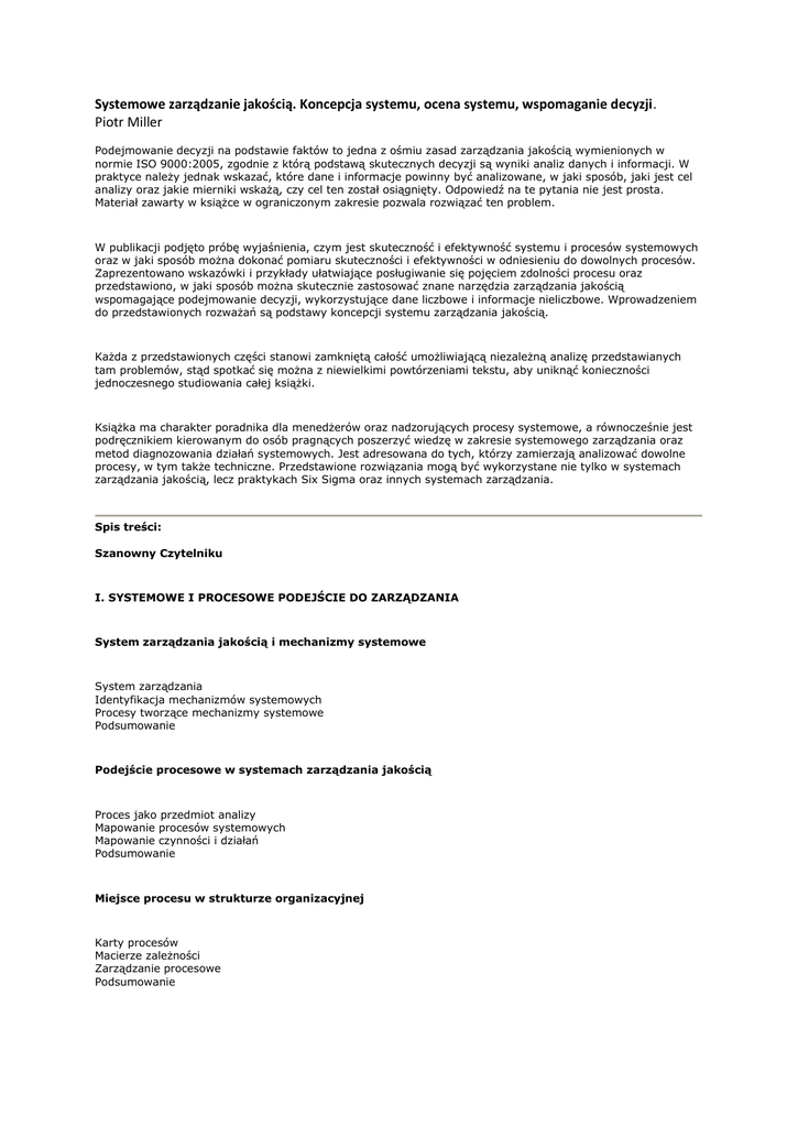 Systemowe zarządzanie jakością. Koncepcja systemu, ocena systemu, wspomaganie decyzji. Piotr Miller Podejmowanie decyzji na podstawie faktów to jedna z ośmiu zasad zarządzania jakością wymienionych w normie ISO 9000:2005, zgodnie z którą podstawą skutecznych decyzji są wyniki analiz danych i informacji. W praktyce należy jednak wskazać, które dane i informacje powinny być analizowane, w jaki sposób, jaki jest cel analizy oraz jakie mierniki wskażą, czy cel ten został osiągnięty. Odpowiedź na te pytania nie jest prosta. Materiał zawarty w książce w ograniczonym zakresie pozwala rozwiązać ten problem. W publikacji podjęto próbę wyjaśnienia, czym jest skuteczność i efektywność systemu i procesów systemowych oraz w jaki sposób można dokonać pomiaru skuteczności i efektywności w odniesieniu do dowolnych procesów. Zaprezentowano wskazówki i przykłady ułatwiające posługiwanie się pojęciem zdolności procesu oraz przedstawiono, w jaki sposób można skutecznie zastosować znane narzędzia zarządzania jakością wspomagające podejmowanie decyzji, wykorzystujące dane liczbowe i informacje nieliczbowe. Wprowadzeniem do przedstawionych rozważań są podstawy koncepcji systemu zarządzania jakością. Każda z przedstawionych części stanowi zamkniętą całość umożliwiającą niezależną analizę przedstawianych tam problemów, stąd spotkać się można z niewielkimi powtórzeniami tekstu, aby uniknąć konieczności jednoczesnego studiowania całej książki. Książka ma charakter poradnika dla menedżerów oraz nadzorujących procesy systemowe, a równocześnie jest podręcznikiem kierowanym do osób pragnących poszerzyć wiedzę w zakresie systemowego zarządzania oraz metod diagnozowania działań systemowych. Jest adresowana do tych, którzy zamierzają analizować dowolne procesy, w tym także techniczne. Przedstawione rozwiązania mogą być wykorzystane nie tylko w systemach zarządzania jakością, lecz praktykach Six Sigma oraz innych systemach zarządzania. Spis treści: Szanowny Czytelniku I. SYSTEMOWE I PROCESOWE PODEJŚCIE DO ZARZĄDZANIA System zarządzania jakością i mechanizmy systemowe System zarządzania Identyfikacja mechanizmów systemowych Procesy tworzące mechanizmy systemowe Podsumowanie Podejście procesowe w systemach zarządzania jakością Proces jako przedmiot analizy Mapowanie procesów systemowych Mapowanie czynności i działań Podsumowanie Miejsce procesu w strukturze organizacyjnej Karty procesów Macierze zależności Zarządzanie procesowe Podsumowanie II. SKUTECZNOŚĆ I EFEKTYWNOŚĆ PROCESÓW Aspekty i mierniki skuteczności Przedmiot analizy skuteczności Cele do osiągnięcia Mierniki skuteczności Wartości mierników skuteczności Monitorowanie wartości mierników skuteczności Analiza przypadku – część 1 Cele szczegółowe Cele ogólne Analiza przypadku – część 2 Podsumowanie Pomiar skuteczności Skuteczność a stwierdzone niezgodności z wymaganiami – braki Skuteczność a stwierdzone niezgodności z wymaganiami – wady Skuteczność a stwierdzone niezgodności z wymaganiami – wartości parametrów Skuteczność a zróżnicowane stany akceptacji Skończone zbiory wartości parametrów Zależność pomiędzy liczbą braków a liczbą wad Analiza przypadku – część 3 Braki jako podstawa szacowania skuteczności Wady jako podstawa szacowania skuteczności Wartość parametru jako podstawa szacowania skuteczności Zestawienie wyników i ocena skuteczności Podsumowanie Skuteczność działań złożonych Skuteczność jako wynik złożonych procesów wytwarzania Wady jako podstawa szacowania skuteczności w złożonych procesach wytwarzania Skuteczność w osiąganiu równocześnie realizowanych celów Skuteczność procesów wykorzystujących systemowe działania kontrolne i naprawcze Ekonomiczne aspekty skuteczności systemu Wykorzystanie oprogramowania komputerowego do analizy procesów złożonych Analiza przypadku – część 4 Analiza przypadku – część 5 Podsumowanie Koszty strat Braki jako podstawa szacowania kosztów strat Wady jako podstawa szacowania kosztów strat Wartość parametru jako podstawa szacowania kosztów strat Zbiór skończony wartości parametru jako podstawa szacowania kosztów strat Szacowanie kosztów strat na podstawie estymatorów z próby Analiza przypadku – część 6 Przypadek „wad” Przypadek „braków” Przypadek „wartości parametrów” Zbiorcze ujęcie kosztów strat Podsumowanie Efektywność procesów Efektywność procesu złożonego Efektywność procesów wytwarzania Analiza przypadku – część 7 Podsumowanie Wskaźniki procesowe w Six Sigma Ukryte fabryki Wskaźnik wydajności operacyjnej, pierwotnej i końcowej Wskaźnik wydajności przejściowej Wskaźnik wydajności procesu Wskaźnik wydajności mierzonej w toku Wskaźnik wydajności pierwszego przejścia Znormalizowany wskaźnik wydajności Miary procesu w Six Sigma Podsumowanie III. ANALIZA ZDOLNOŚCI PROCESÓW Zdolność procesu Potencjał procesu – metoda udziałów procentowych Zdolność procesu – metoda udziałów procentowych Zdolność procesu – metoda frakcji niezgodności poza granicami Zdolność procesów z uwzględnieniem rozrzutu średniej Zdolność krótkoterminowa i długoterminowa Zdolność krótkoterminowa ZST i długoterminowa ZLT Kompleksowa ocena zdolności procesu Inne formuły wskaźników zdolności procesu Zdolność procesu na podstawie liczby braków Podsumowanie Zdolność procesu – przypadek I Analiza stabilności procesu Badanie istotności różnicy pomiędzy zmiennością w próbie i między próbami Zdolność krótkoterminowa Krótkoterminowa zdolność ZST Analiza zdolności krótkoterminowej Rozkład wyników w dłuższym okresie jako podstawa określenia zdolności długoterminowej Analiza zbioru wszystkich wyników pomiaru – rozkład normalny Zdolność długoterminowa na podstawie wszystkich wyników – roz