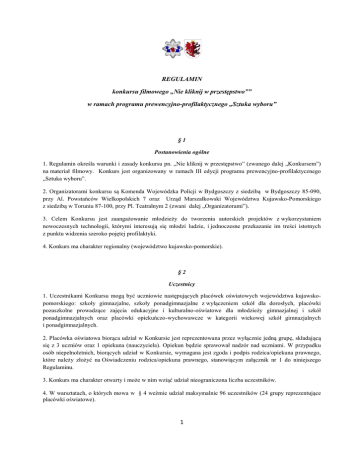REGULAMIN konkursu filmowego „Nie kliknij w przestępstwo”” w ramach programu prewencyjno-profilaktycznego „Sztuka wyboru” §1 Postanowienia ogólne 1. Regulamin określa warunki i zasady konkursu pn. „Nie kliknij w przestępstwo” (zwanego dalej „Konkursem”) na materiał filmowy. Konkurs jest organizowany w ramach III edycji programu prewencyjno-profilaktycznego „Sztuka wyboru”. 2. Organizatorami konkursu są Komenda Wojewódzka Policji w Bydgoszczy z siedzibą w Bydgoszczy 85-090, przy Al. Powstańców Wielkopolskich 7 oraz Urząd Marszałkowski Województwa Kujawsko-Pomorskiego z siedzibą w Toruniu 87-100, przy Pl. Teatralnym 2 (zwani dalej „Organizatorami”). 3. Celem Konkursu jest zaangażowanie młodzieży do tworzenia autorskich projektów z wykorzystaniem nowoczesnych technologii, którymi interesują się młodzi ludzie, i jednoczesne przekazanie im treści istotnych z punktu widzenia szeroko pojętej profilaktyki. 4. Konkurs ma charakter regionalny (województwo kujawsko-pomorskie). §2 Uczestnicy 1. Uczestnikami Konkursu mogą być uczniowie następujących placówek oświatowych województwa kujawskopomorskiego: szkoły gimnazjalne, szkoły ponadgimnazjalne z wyłączeniem szkół dla dorosłych, placówki pozaszkolne prowadzące zajęcia edukacyjne i kulturalno-oświatowe dla młodzieży gimnazjalnej i szkół ponadgimnazjalnych oraz placówki opiekuńczo-wychowawcze w kategorii wiekowej szkół gimnazjalnych i ponadgimnazjalnych. 2. Placówka oświatowa biorąca udział w Konkursie jest reprezentowana przez wyłącznie jedną grupę, składającą się z 3 uczniów oraz 1 opiekuna (nauczyciela). Opiekun będzie sprawował nadzór nad uczniami. W przypadku osób niepełnoletnich, biorących udział w Konkursie, wymagana jest zgoda i podpis rodzica/opiekuna prawnego, które należy złożyć na Oświadczeniu rodzica/opiekuna prawnego, stanowiącym załącznik nr 1 do niniejszego Regulaminu. 3. Konkurs ma charakter otwarty i może w nim wziąć udział nieograniczona liczba uczestników. 4. W warsztatach, o których mowa w § 4 weźmie udział maksymalnie 96 uczestników (24 grupy reprezentujące placówki oświatowe). 1 §3 Zgłoszenia 1. Placówki oświatowe, aby wziąć udział w Konkursie zobowiązane są do dostarczenia Organizatorom: Wniosku uczestnictwa, stanowiącego załącznik nr 2 do niniejszego Regulaminu (w którym zawarte będzie uzasadnienie chęci uczestnictwa w Konkursie), Formularza zgłoszeniowego, stanowiącego załącznik nr 4 do niniejszego Regulaminu, opcjonalnie mogą zostać dołączone następujące elementy: 1) przygotowany przez uczniów jeden materiał filmowy (zwany dalej „demo”) - spot, film, reportaż itp., który mógł zostać już zaprezentowany w ramach innego przedsięwzięcia i obrazuje potencjał uczestników. Demo powinno posiadać następujące parametry: a) tematyka: dowolna, b) czas trwania: dowolny, c) parametry: materiał filmowy video wykonany techniką cyfrową przy użyciu kamery video, telefonu komórkowego, aparatu fotograficznego itp., zapisany na płycie CD/DVD w formacie: mov, mpg, mp4, avi, mpg, mpeg2, divx w postaci pojedynczego pliku, d) płyta z materiałem filmowym musi być opisana według schematu: nazwa placówki, tytuł filmu, 2) jeden scenariusz filmu zawierający elementy profilaktyczno-edukacyjne, 3) jedna prezentacja multimedialna zawierająca elementy profilaktyczno-edukacyjne, 4) jedna dowolna forma literacka zawierająca elementy profilaktyczno-edukacyjne. 2. Aby zgłosić się do Konkursu, obligatoryjne jest złożenie Wniosku uczestnictwa oraz Formularza zgłoszeniowego, o których mowa w ustępie 1, natomiast pozostałe elementy mogą zostać do niego dołączone opcjonalnie i w dowolnej konfiguracji. 3. Placówki oświatowe dostarczają Organizatorom do dnia 30 czerwca 2014 r. osobiście lub za pośrednictwem poczty (liczy się data stempla pocztowego) materiały wymienione w ustępie 1 na następujący adres: Komenda Wojewódzka Policji w Bydgoszczy Wydział Komunikacji Społecznej Al. Powstańców Wielkopolskich 7, 85-090 Bydgoszcz z dopiskiem „Sztuka wyboru - film”. §4 Warsztaty 1. Spośród nadesłanych zgłoszeń, organizatorzy wyłonią 24 grupy - reprezentantów placówek oświatowych, które wezmą udział w jednej z edycji weekendowych warsztatów filmowych, które odbędą się w Bydgoszczy. 2. W pierwszej kolejności o zakwalifikowaniu się na warsztaty decydować będzie: 1) nie uczestniczenie w warsztatach podczas poprzednich edycji Konkursu, 2 2) ocena złożonych materiałów wymienionych w § 3 ust. 1. 3. W przypadku zgłoszenia się maksymalnie 24 grup, wszyscy uczestnicy Konkursu wezmą udział w warsztatach. 4. Placówki oświatowe zakwalifikowane na warsztaty zostaną powiadomione o tym fakcie do dnia 1 sierpnia 2014 r. za pośrednictwem strony internetowej Konkursu (www.sztukawyboru.pl) oraz poczty elektronicznej lub/i telefonicznie. 5. Grupa reprezentująca placówkę oświatową powinna dysponować podczas warsztatów sprzętem do nagrywania materiału filmowego (kamera, aparat cyfrowy z funkcją nagrywania). 6. Dla uczestników warsztatów spoza Bydgoszczy, Organizatorzy Konkursu zapewnią nocleg na czas trwania warsztatów. Koszty noclegów oraz wyżywienia w ramach warsztatów filmowych pokrywają Organizatorzy. Koszty dojazdu na warsztaty filmowe pokrywają uczestnicy. 7. W przypadku rezygnacji zakwalifikowanych uczestników z udziału w warsztatach, Organizator zastrzega sobie prawo obciążenia ich kosztami organizacyjnymi. 8. Warunkiem organizacji warsztatów jest udział w etapie kwalifikacyjnym co najmniej 12 grup reprezentujących placówki oświatowe. 9. Nie uczestniczenie w warsztatach nie wyklucza z udziału w Konkursie. §4 Zasady i warunki Konkursu. 1. Warunkiem udziału w Konkursie jest złożenie Wniosku uczestnictwa oraz Formularza zgłoszeniowego, o których mowa w § 3 ust. 1, oraz jeżeli jest to wymagane Oświadczenia rodzica/o