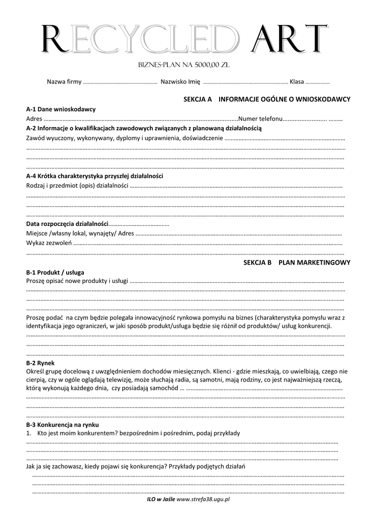 R ecycled Art Biznes-Plan na 5000,00 zł Nazwa firmy ……………………………………….………… Nazwisko Imię ……………………………...………………………… Klasa ………….…… SEKCJA A INFORMACJE OGÓLNE O WNIOSKODAWCY A-1 Dane wnioskodawcy Adres ………………………………………………………………….............................................Numer telefonu.......................... ……… A-2 Informacje o kwalifikacjach zawodowych związanych z planowaną działalnością Zawód wyuczony, wykonywany, dyplomy i uprawnienia, doświadczenie ……………………………………………..…………………… …………………………………………………………………………………………………………………………………………………………………………………… …………………………………………………………………………………………………………………………………………………………………………..……… ………………………………………………………………………………………………………………………………………………………………..………………… A-4 Krótka charakterystyka przyszłej działalności Rodzaj i przedmiot (opis) działalności ……………………………………………………………………………………………………………….……… …………………………………………………………………………………………………………………………………………………………………………………… …………………………………………………………………………………………………………………………………………………………………………..……… ………………………………………………………………………………………………………………………………………………………………..………………… Data rozpoczęcia działalności………………………………… Miejsce /własny lokal, wynajęty/ Adres …………………………………………………………………………………………………………………… Wykaz zezwoleń ……………………………………………………………………………………………………………………………………………….……… …………………………………………………………………………………………………………………………………………………………………………..……… SEKCJA B PLAN MARKETINGOWY B-1 Produkt / usługa Proszę opisać nowe produkty i usługi ……………………………………………..………………………………………………………………………… …………………………………………………………………………………………………………………………………………………………………………………… …………………………………………………………………………………………………………………………………………………………………………..……… ………………………………………………………………………………………………………………………………………………………………..………………… Proszę podać na czym będzie polegała innowacyjność rynkowa pomysłu na biznes (charakterystyka pomysłu wraz z identyfikacja jego ograniczeń, w jaki sposób produkt/usługa będzie się różnił od produktów/ usług konkurencji. …………………………………………………………………………………………………………………………………………………………………………………… …………………………………………………………………………………………………………………………………………………………………………..……… ………………………………………………………………………………………………………………………………………………………………..………………… B-2 Rynek Określ grupę docelową z uwzględnieniem dochodów miesięcznych. Klienci - gdzie mieszkają, co uwielbiają, czego nie cierpią, czy w ogóle oglądają telewizję, może słuchają radia, są samotni, mają rodziny, co jest najważniejszą rzeczą, którą wykonują każdego dnia, czy posiadają samochód … ………………………………………………………………………………………. …………………………………………………………………………………………………………………………………………………………………………………… …………………………………………………………………………………………………………………………………………………………………………..……… ………………………………………………………………………………………………………………………………………………………………..………………… B-3 Konkurencja na rynku 1. Kto jest moim konkurentem? bezpośrednim i pośrednim, podaj przykłady ………………………………………………………………………………………………………………………………………………………………………..…..… ……………………………………………………………………………………………………………………………………………………………….