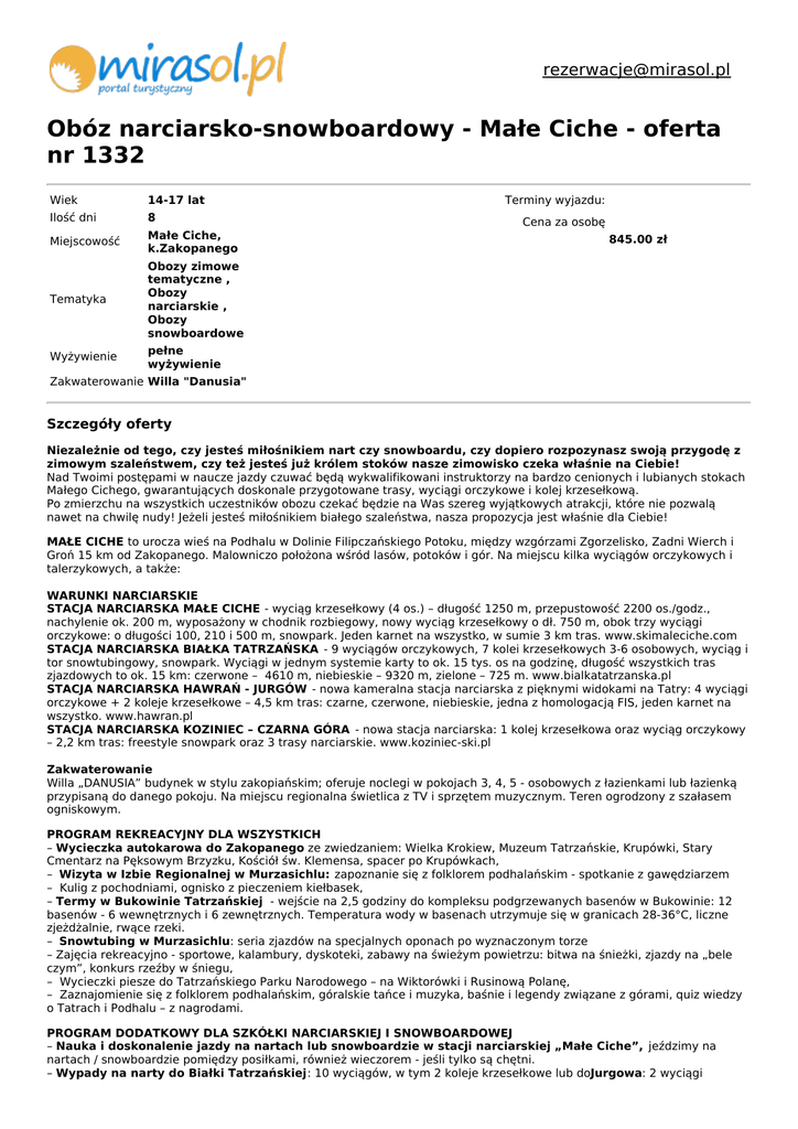 [email protected] Obóz narciarsko-snowboardowy - Małe Ciche - oferta nr 1332 Wiek 14-17 lat Ilość dni 8 Miejscowość Małe Ciche, k.Zakopanego Tematyka Obozy zimowe tematyczne , Obozy narciarskie , Obozy snowboardowe Wyżywienie pełne wyżywienie Terminy wyjazdu: Cena za osobę 845.00 zł Zakwaterowanie Willa "Danusia" Szczegóły oferty Niezależnie od tego, czy jesteś miłośnikiem nart czy snowboardu, czy dopiero rozpozynasz swoją przygodę z zimowym szaleństwem, czy też jesteś już królem stoków nasze zimowisko czeka właśnie na Ciebie! Nad Twoimi postępami w naucze jazdy czuwać będą wykwalifikowani instruktorzy na bardzo cenionych i lubianych stokach Małego Cichego, gwarantujących doskonale przygotowane trasy, wyciągi orczykowe i kolej krzesełkową. Po zmierzchu na wszystkich uczestników obozu czekać będzie na Was szereg wyjątkowych atrakcji, które nie pozwalą nawet na chwilę nudy! Jeżeli jesteś miłośnikiem białego szaleństwa, nasza propozycja jest właśnie dla Ciebie! MAŁE CICHE to urocza wieś na Podhalu w Dolinie Filipczańskiego Potoku, między wzgórzami Zgorzelisko, Zadni Wierch i Groń 15 km od Zakopanego. Malowniczo położona wśród lasów, potoków i gór. Na miejscu kilka wyciągów orczykowych i talerzykowych, a także: WARUNKI NARCIARSKIE STACJA NARCIARSKA MAŁE CICHE - wyciąg krzesełkowy (4 os.) – długość 1250 m, przepustowość 2200 os./godz., nachylenie ok. 200 m, wyposażony w chodnik rozbiegowy, nowy wyciąg krzesełkowy o dł. 750 m, obok trzy wyciągi orczykowe: o długości 100, 210 i 500 m, snowpark. Jeden karnet na wszystko, w sumie 3 km tras. www.skimaleciche.com STACJA NARCIARSKA BIAŁKA TATRZAŃSKA - 9 wyciągów orczykowych, 7 kolei krzesełkowych 3-6 osobowych, wyciąg i tor snowtubingowy, snowpark. Wyciągi w jednym systemie karty to ok. 15 tys. os na godzinę, długość wszystkich tras zjazdowych to ok. 15 km: czerwone – 4610 m, niebieskie – 9320 m, zielone – 725 m. www.bialkatatrzanska.pl STACJA NARCIARSKA HAWRAŃ - JURGÓW - nowa kameralna stacja narciarska z pięknymi widokami na Tatry: 4 wyciągi orczykowe + 2 koleje krzesełkowe – 4,5 km tras: czarne, czerwone, niebieskie, jedna z homologacją FIS, jeden karnet na wszystko. www.hawran.pl STACJA NARCIARSKA KOZINIEC – CZARNA GÓRA - nowa stacja narciarska: 1 kolej krzesełkowa oraz wyciąg orczykowy – 2,2 km tras: freestyle snowpark oraz 3 trasy narciarskie. www.koziniec-ski.pl Zakwaterowanie Willa „DANUSIA” budynek w stylu zakopiańskim; oferuje noclegi w pokojach 3, 4, 5 - osobowych z łazienkami lub łazienką przypisaną do danego pokoju. Na miejscu regionalna świetlica z TV i sprzętem muzycznym. Teren ogrodzony z szałasem ogniskowym. PROGRAM REKREACYJNY DLA WSZYSTKICH – Wycieczka autokarowa do Zakopanego ze zwiedzaniem: Wielka Krokiew, Muzeum Tatrzańskie, Krupówki, Stary Cmentarz na Pęksowym Brzyzku, Kościół św. Klemensa, spacer po Krupówkach, – Wizyta w Izbie Regionalnej w Murzasichlu: zapoznanie się z folklorem podhalańskim - spotkanie z gawędziarzem – Kulig z pochodniami, ognisko z pieczeniem kiełbasek, – Termy w Bukowinie Tatrzańskiej - wejście na 2,5 godziny do kompleksu podgrzewanych basenów w Bukowinie: 12 basenów - 6 wewnętrznych i 6 zewnętrznych. Temperatura wody w basenach utrzymuje się w granicach 28-36°C, liczne zjeżdżalnie, rwące rzeki. – Snowtubing w Murzasichlu: seria zjazdów na specjalnych oponach po wyznaczonym torze – Zajęcia rekreacyjno - sportowe, kalambury, dyskoteki, zabawy na świeżym powietrzu: bitwa na śnieżki, zjazdy na „bele czym”, konkurs rzeźby w śniegu, – Wycieczki piesze do Tatrzańskiego Parku Narodowego – na Wiktorówki i Rusinową Polanę, – Zaznajomienie się z folklorem podhalańskim, góralskie tańce i muzyka, baśnie i legendy związane z górami, quiz wiedzy o Tatrach i Podhalu – z nagrodami. PROGRAM DODATKOWY DLA SZKÓŁKI NARCIARSKIEJ I SNOWBOARDOWEJ – Nauka i doskonalenie jazdy na nartach lub snowboardzie w stacji narciarskiej „Małe Ciche”, jeździmy na nartach / snowboardzie pomiędzy posiłkami, również wieczorem - jeśli tylko są chętni. – Wypady na narty do Białki Tatrzańskiej: 10 wyciągów, w tym 2 koleje krzesełkowe lub doJurgowa: 2 wyciągi krzesełkowe + kolej krzesełkowa – 3 km tras lub Czarnej Góry: nowa stacja narciarska: 1 kolej krzesełkowa oraz wyciąg orczykowy, freestyle snowpark oraz 3 trasy narciarskie. CO ZABRAĆ? Należy spakować: sprawny sprzęt narciarski – możliwość wypożyczenia na miejscu, mały plecak, okulary przeciwsłoneczne, krem z filtrem, ew. strój kąpielowy. Zalecamy zabranie kasków narciarskich lub snowboardowych – dla uczestników do 15 lat obowiązkowe! Organizator z powodu małej ilości uczestników zastrzega sobie prawo do odwołania wyjazdu z danego miasta, możliwość zmiany miejsca i godziny wyjazdu oraz środka transportu. Poszczególne programy (narty, snowboard, rekreacja) realizowane są przy min. 10 uczestnikach. Maksymalny bagaż : 1 torba podróżna lub plecak max 20 kg + bagaż podręczny + 1 para nart lub snowboard + buty. Cena zawiera: *Zakwaterowanie: Willa DANUSIA, pokoje 3, 4, 5 - osobowe z łazienkami lub łazienka przypisana do pokoju. *Wyżywienie: 3 posiłki dziennie + podwieczorek w stołówce na miejscu (bardzo smaczna kuchnia domowa). Pierwsze świadczenie - kolacja w dniu przyjazdu; ostatnie świadczenie śniadanie + suchy prowiant na drogę w dniu wyjazdu. *Ubezpieczenie NNW (do 5.000 zł). *Program wg oferty. *Opiekę kadry instruktorsko-wychowawczej.Kierownik oraz wychowawcy-instruktorzy narciarstwa lub snowboardu z uprawnieniami MENiS, wychowawca dla grupy rekreacyjnej. *Opieka lekarska na telefon. Programy i koszty dodatkowe (dla chętnych): *Dopłata za wyjazdy z poszczególnych miast zgodnie z tabelą. *Ubezpieczenie SIGNAL IDUNA SKI (zalecane, obejmuje sprzęt narciarski i OC - szkody rzeczowe i osobowe) - 15 zł. *Ubezpieczenie od ko