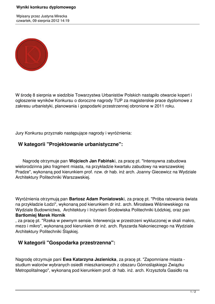 Wyniki konkursu dyplomowego Wpisany przez Justyna Mirecka czwartek, 09 sierpnia 2012 14:19 W środę 8 sierpnia w siedzibie Towarzystwa Urbanistów Polskich nastąpiło otwarcie kopert i ogłoszenie wyników Konkursu o doroczne nagrody TUP za magisterskie prace dyplomowe z zakresu urbanistyki, planowania i gospodarki przestrzennej obronione w 2011 roku. Jury Konkursu przyznało następujące nagrody i wyróżnienia: W kategorii "Projektowanie urbanistyczne": Nagrodę otrzymuje pan Wojciech Jan Fabiński, za pracę pt. "Intensywna zabudowa wielorodzinna jako fragment miasta, na przykładzie kwartału zabudowy na warszawskiej Pradze", wykonaną pod kierunkiem prof. nzw. dr hab. inż arch. Joanny Giecewicz na Wydziale Architektury Politechniki Warszawskiej. Wyróżnienia otrzymują pan Bartosz Adam Poniatowski, za pracę pt. "Próba ratowania świata na przykładzie Łodzi", wykonaną pod kierunkiem dr inż. arch. Mirosława Wiśniewskiego na Wydziale Budownictwa, Architektury i Inżynierii Środowiska Politechniki Łódzkiej, oraz pan Bartłomiej Marek Hornik , za pracę pt. "Rzeka w pewnym sensie. Interwencja w przestrzeni wykluczonej w skali makro, mezo i mikro", wykonaną pod kierunkiem dr inż. arch. Ryszarda Nakoniecznego na Wydziale Architektury Politechniki Śląskiej. W kategorii "Gospodarka przestrzenna": Nagrodę otrzymuje pani Ewa Katarzyna Jezienicka, za pracę pt. "Zapomniane miasta studium walorów wybranych osiedli mieszkaniowych z obszaru Górnośląskiego Związku Metropolitalnego", wykonaną pod kierunkiem prof. dr hab. inż. arch. Krzysztofa Gasidło na 1/2 Wyniki konkursu dyplomowego Wpisany przez Justyna Mirecka czwartek, 09 sierpnia 2012 14:19 Wydziale Architektury Politechniki Śląskiej. Wyróżnienia otrzymują pani Agnieszka Eleonora Turek, za pracę pt. "Rewitalizacja obszarów poprzemysłowych jako kierunek zrównoważonego rozwoju miast na przykładzie dzielnicy Wola w Warszawie", wykonaną pod kierunkiem dr inż. arch. Małgorzaty Mireckiej na Wydziale Geodezji i Kartografii Politechniki Warszawskiej, oraz pani Katarzyna Agata Senczak , za pracę pt. "Silesia Airea - scenariusz zagospodarowania przestrzennego związanego ze strefą okołolotniskową MPL w Pyrzowicach", wykonaną pod kierunkiem dr inż. arch. Michała Stangela na Wydziale Architektury Politechniki Śląskiej. Zwycięzcom i wyróżnionym serdecznie gratulujemy i zapraszamy na ceremonię wręczenia nagród, która odbędzie się podczas IV Kongresu Urbanistyki Polskiej w Lublinie, w piątek 21 września o godzinie 15:15. Pozostałych autorów zapraszamy do odbioru zgłoszonych prac w siedzibie TUP przy ul. Lwowskiej 5/100 w Warszawie w godzinach pracy biura, lub po wcześniejszym uzgodnieniu terminu i sposobu odbioru. Sponsorem konkursu jest kancelaria: 2/2