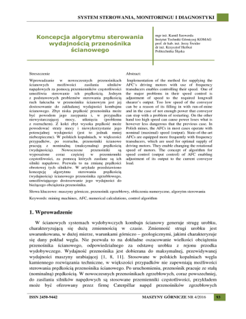 SYSTEM STEROWANIA, MONITORINGU I DIAGNOSTYKI Koncepcja algorytmu sterowania wydajnością przenośnika ścianowego mgr inż. Kamil Szewerda Instytut Techniki Górniczej KOMAG prof. dr hab. inż. Jerzy Świder dr inż. Krzysztof Herbuś Politechnika Śląska Streszczenie Abstract: Wprowadzanie w nowoczesnych przenośnikach ścianowych możliwości zasilania silników napędowych za pomocą przemienników częstotliwości umożliwia sterowanie ich prędkością. Jednym z podstawowych problemów sterowania prędkością ruch łańcucha w przenośniku ścianowym jest jej dostosowanie do zakładanej wydajności kombajnu ścianowego. Zbyt niska prędkość przenośnika może być powodem jego zasypania i, w przypadku niewystarczającej mocy, utknięcia (problemu z rozruchem). Z kolei zbyt wysoka prędkość może powodować straty mocy i niewykorzystanie jego potencjalnej wydajności (jest to jednak mniej niebezpieczne). W polskich kopalniach, w większości przypadków, po rozruchu, przenośniki ścianowe pracują z nominalną (maksymalną) prędkością (wydajnością). Nowoczesne przenośniki są wyposażone coraz częściej w przemienniki częstotliwości, za pomocą których zasilane są ich silniki napędowe. Pozwala to na zmianę prędkości obrotowej tych silników. W artykule przedstawiono koncepcję algorytmu sterowania prędkością (wydajnością) ścianowego przenośnika zgrzebłowego, umożliwiającego dostosowanie jego wydajności do bieżącego obciążenia przenośnika. Implementation of the method for supplying the AFC’s driving motors with use of frequency transducers enables controlling their speed. One of the major problems in their speed control is adjustment of speed to the required longwall shearer’s output. Too low speed of the conveyor can be a reason of its filling in with run-of-mine and in the case of not enough power that conveyor can stop with a problem of restarting. On the other hand too high speed can cause power loses what is however less dangerous that the previous case. In Polish mines, the AFCs in most cases operate with nominal (maximal) speed (output). State-of-the-art AFCs are equipped more frequently with frequency transducers, which are used for optimal supply of driving motors. They enable changing the rotational speed of motors. The concept of algorithm for speed control (output control) of AFC enabling adjustment of its output to the current conveyor load. Słowa kluczowe: maszyny górnicze, przenośnik zgrzebłowy, obliczenia numeryczne, algorytm sterowania Keywords: mining machines, AFC, numerical calculations, control algorithm 1. Wprowadzenie W ścianowych systemach wydobywczych kombajn ścianowy generuje strugę urobku, charakteryzującą się dużą zmiennością w czasie. Zmienność strugi urobku jest uwarunkowana, w dużej mierze, warunkami górniczo – geologicznymi, jakimi charakteryzuje się dany pokład węgla. Nie pozwala to na dokładne oszacowanie wielkości obciążenia przenośnika ścianowego, odpowiedzialnego za odstawę urobku z rejonu przodka wydobywczego. Wydajność przenośnika jest dobierana do maksymalnej, przewidywanej wydajności maszyny urabiającej [1, 8, 11]. Stosowane w polskich kopalniach węgla kamiennego rozwiązania techniczne, w większości przypadków nie zapewniają możliwości sterowania prędkością przenośnika ścianowego. Po uruchomieniu, przenośnik pracuje ze stałą (nominalną) prędkością. W nowoczesnych przenośnikach zgrzebłowych, coraz powszechniej, do zasilania silników napędowych są stosowane przemienniki częstotliwości, przykładem może być oferowany przez firmę Caterpillar napęd przenośników zgrzebłowych ISSN 2450-9442 MASZYNY GÓRNICZE NR 4/2016 93 SYSTEM STEROWANIA, MONITORINGU I DIAGNOSTYKI typu VFD-A800/W800 lub rozwiązanie opracowane w ramach projektu ICON koordynowanego przez Instytut Techniki Górniczej KOMAG. Zastosowanie przemienników częstotliwości umożliwia regulację prędkości obrotowej silników napędowych, a z nią – regulację prędkości ruchu przenośnika, a tym samym jego wydajności [2, 9, 10, 15, 16]. W artykule przedstawiono opracowaną koncepcję algorytmu sterowania prędkością przenośnika zgrzebłowego, poprzez sterowanie nastaw przemienników częstotliwości, służących do zasilania jego silników napędowych. 2. Model obliczeniowy ścianowego przenośnika zgrzebłowego Opracowanie koncepcji algorytmu sterowania prędkością ruchu przenośnika zgrzebłowego, poprzez zmianę częstotliwości napięcia zasilania silników elektrycznych, wymagało przeprowadzenia serii testów i prób numerycznych. Analizowano wpływ zmiany częstotliwości napięcia zasilania silników elektrycznych na wartość natężenia prądu w tych silnikach, przy różnym poziomie obciążenia górnej nitki łańcucha zgrzebłowego przenośnika. Do symulacji numerycznych posłużył model numeryczny przenośnika ścianowego typu RYBNIK 850, o długości 200 m, z dwoma silnikami napędowymi o mocy 315 kW. Model obliczeniowy składał się z dwóch modułów. Moduł pierwszy, to model fizykalny przenośnika zgrzebłowego (rys. 1). Składał się on z szeregu brył sztywnych, połączonych za pomocą więzów geometrycznych oraz elementów sprężysto – tłumiących. W modelu fizykalnym zdefiniowano także wektory sił i momentów oraz sposób oddziaływania poszczególnych brył pomiędzy sobą. W modelu zabudowano również przetworniki stanu napięcia łańcucha zgrzebłowego na zejściu z bębnów napędowych na napędzie zwrotnym i wysypowym przenośnika. Drugi moduł modelu obliczeniowego składał się z modelu silników elektrycznych. Zastosowano dwa silniki elektryczne: jeden zlokalizowany na napędzie wysypowym, a drugi – na napędzie zwrotnym przenośnika. Oba silniki były zasilane poprzez przemienniki częstotliwości. Sposób zamodelowania silników elektrycznych pozwalał na zmianę prędkości obrotowej silników, poprzez zmianę częstotli