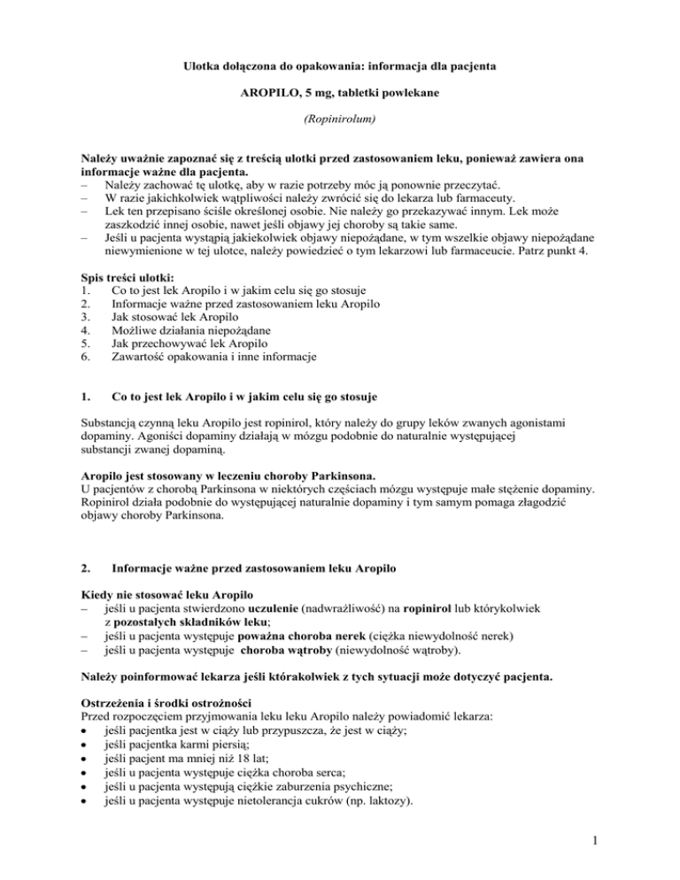 Ulotka dołączona do opakowania: informacja dla pacjenta AROPILO, 5 mg, tabletki powlekane (Ropinirolum) Należy uważnie zapoznać się z treścią ulotki przed zastosowaniem leku, ponieważ zawiera ona informacje ważne dla pacjenta. – Należy zachować tę ulotkę, aby w razie potrzeby móc ją ponownie przeczytać. – W razie jakichkolwiek wątpliwości należy zwrócić się do lekarza lub farmaceuty. – Lek ten przepisano ściśle określonej osobie. Nie należy go przekazywać innym. Lek może zaszkodzić innej osobie, nawet jeśli objawy jej choroby są takie same. – Jeśli u pacjenta wystąpią jakiekolwiek objawy niepożądane, w tym wszelkie objawy niepożądane niewymienione w tej ulotce, należy powiedzieć o tym lekarzowi lub farmaceucie. Patrz punkt 4. Spis treści ulotki: 1. Co to jest lek Aropilo i w jakim celu się go stosuje 2. Informacje ważne przed zastosowaniem leku Aropilo 3. Jak stosować lek Aropilo 4. Możliwe działania niepożądane 5. Jak przechowywać lek Aropilo 6. Zawartość opakowania i inne informacje 1. Co to jest lek Aropilo i w jakim celu się go stosuje Substancją czynną leku Aropilo jest ropinirol, który należy do grupy leków zwanych agonistami dopaminy. Agoniści dopaminy działają w mózgu podobnie do naturalnie występującej substancji zwanej dopaminą. Aropilo jest stosowany w leczeniu choroby Parkinsona. U pacjentów z chorobą Parkinsona w niektórych częściach mózgu występuje małe stężenie dopaminy. Ropinirol działa podobnie do występującej naturalnie dopaminy i tym samym pomaga złagodzić objawy choroby Parkinsona. 2. Informacje ważne przed zastosowaniem leku Aropilo Kiedy nie stosować leku Aropilo jeśli u pacjenta stwierdzono uczulenie (nadwrażliwość) na ropinirol lub którykolwiek z pozostałych składników leku; jeśli u pacjenta występuje poważna choroba nerek (ciężka niewydolność nerek) jeśli u pacjenta występuje choroba wątroby (niewydolność wątroby). Należy poinformować lekarza jeśli którakolwiek z tych sytuacji może dotyczyć pacjenta. Ostrzeżenia i środki ostrożności Przed rozpoczęciem przyjmowania leku leku Aropilo należy powiadomić lekarza: jeśli pacjentka jest w ciąży lub przypuszcza, że jest w ciąży; jeśli pacjentka karmi piersią; jeśli pacjent ma mniej niż 18 lat; jeśli u pacjenta występuje ciężka choroba serca; jeśli u pacjenta występują ciężkie zaburzenia psychiczne; jeśli u pacjenta występuje nietolerancja cukrów (np. laktozy). 1 Należy poinformować lekarza jeżeli pacjent lub jego rodzina/opiekun zauważą nietypowe zachowania będące wynikiem nieodpartego impulsu, przymusu, natrętnego wykonywania pewnych czynności, szkodliwych dla pacjenta lub innych osób. Takie zachowania są zwane zaburzeniami kontroli impulsów i mogą obejmować uzależnienie od hazardu, nadmierne objadanie się lub wydawanie pieniędzy, nadmierny popęd seksualny lub nasilone myśli i odczucia seksualne. Lekarz może zdecydować o dostosowaniu dawki lub odstawieniu leku. Należy powiedzieć lekarzowi jeśli którykolwiek z wymienionych powyżej stanów dotyczy pacjenta. Lekarz może zdecydować, że lek Aropilo nie jest odpowiednim lekiem dla pacjenta lub może zalecić wykonanie dodatkowych badań kontrolnych w trakcie leczenia. Dzieci i młodzież Leku Aropilo nie należy stosować u dzieci. Lek Aropilo nie jest przeznaczony do stosowania u pacjentów w wieku poniżej 18 lat. Aropilo a inne leki Należy powiedzieć lekarzowi lub farmaceucie o wszystkich lekach przyjmowanych przez pacjenta obecnie lub ostatnio, a także o lekach, które pacjent planuje przyjmować. Niektóre leki mogą mieć wpływ na działanie leku Aropilo lub też zwiększać ryzyko działań niepożądanych. Lek Aropilo może mieć też wpływ na działanie innych leków. Do tych leków należą: lek przeciwdepresyjny fluwoksamina leki stosowane w innych zaburzeniach psychicznych, na przykład sulpiryd HZT (hormonalna terapia zastępcza) metoklopramid, który jest lekiem stosowanym w leczeniu nudności i zgagi antybiotyki: cyprofloksacyna i enoksacyna jakiekolwiek inne leki stosowane w chorobie Parkinsona Należy poinformować lekarza, jeśli pacjent przyjmuje lub niedawno przyjmował którykolwiek z tych leków. Lek Aropilo z jedzeniem i piciem Przyjmowanie leku Aropilo wraz z jedzeniem może zmniejszyć prawdopodobieństwo wymiotów i uczucia mdłości. W razie możliwości zaleca się przyjmowanie leku z jedzeniem. Ciąża, karmienie piersią i wpływ na płodność Przed zastosowaniem leku należy poradzić się lekarza lub farmaceuty. Lek Aropilo nie jest zalecany w czasie ciąży, o ile lekarz nie stwierdzi, że korzyść z przyjmowania leku przewyższa potencjalne ryzyko dla płodu. Lek Aropilo nie jest zalecany dla kobiet karmiących, ponieważ może mieć wpływ na laktację. Jeśli pacjentka jest w ciąży lub karmi piersią, przypuszcza że może być w ciąży lub gdy planuje mieć dziecko, powinna poradzić się lekarza lub farmaceuty przed zastosowaniem tego leku. Lekarz może zalecić odstawienie leku Aropilo. Prowadzenie pojazdów i obsługiwanie maszyn Ropinirol może powodować senność i czasami nagłe niekontrolowane napady snu. W przypadku wystąpienia takich objawów nie należy prowadzić pojazdów ani wykonywać czynności, podczas których osłabiona czujność może narazić pacjenta lub inne osoby na ryzyko poważnego zranienia lub śmierci (np. obsługa maszyn), dopóki te objawy nie ustąpią. Ważne informacje o niektórych składnikach leku Aropilo Tabletki zawierają laktozę. Jeśli u pacjenta stwierdzono nietolerancję niektórych cukrów, takich jak laktoza, przed zażyciem tego leku należy skonsultować się z lekarzem. 2 Palenie tytoniu i stosowanie leku Aropilo Należy poinformować lekarza o rozpoczęciu lub zaprzestaniu palenia tytoniu podczas stosowania leku Aropilo. Lekarz może stwierdzić potrzebę dostosowania dawki. 3. Jak stosować lek Aropilo Lek