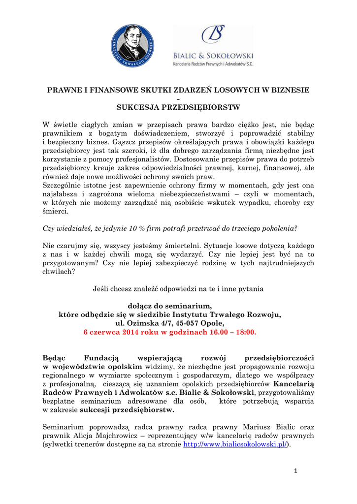 PRAWNE I FINANSOWE SKUTKI ZDARZEŃ LOSOWYCH W BIZNESIE SUKCESJA PRZEDSIĘBIORSTW W świetle ciągłych zmian w przepisach prawa bardzo ciężko jest, nie będąc prawnikiem z bogatym doświadczeniem, stworzyć i poprowadzić stabilny i bezpieczny biznes. Gąszcz przepisów określających prawa i obowiązki każdego przedsiębiorcy jest tak szeroki, iż dla dobrego zarządzania firmą niezbędne jest korzystanie z pomocy profesjonalistów. Dostosowanie przepisów prawa do potrzeb przedsiębiorcy kreuje zakres odpowiedzialności prawnej, karnej, finansowej, ale również daje nowe możliwości ochrony swoich praw. Szczególnie istotne jest zapewnienie ochrony firmy w momentach, gdy jest ona najsłabsza i zagrożona wieloma niebezpieczeństwami – czyli w momentach, w których nie możemy zarządzać nią osobiście wskutek wypadku, choroby czy śmierci. Czy wiedziałeś, że jedynie 10 % firm potrafi przetrwać do trzeciego pokolenia? Nie czarujmy się, wszyscy jesteśmy śmiertelni. Sytuacje losowe dotyczą każdego z nas i w każdej chwili mogą się wydarzyć. Czy nie lepiej jest być na to przygotowanym? Czy nie lepiej zabezpieczyć rodzinę w tych najtrudniejszych chwilach? Jeśli chcesz znaleźć odpowiedzi na te i inne pytania dołącz do seminarium, które odbędzie się w siedzibie Instytutu Trwałego Rozwoju, ul. Ozimska 4/7, 45-057 Opole, 6 czerwca 2014 roku w godzinach 16.00 – 18:00. Będąc Fundacją wspierającą rozwój przedsiębiorczości w województwie opolskim widzimy, że niezbędne jest propagowanie rozwoju regionalnego w wymiarze społecznym i gospodarczym, dlatego we współpracy z profesjonalną, cieszącą się uznaniem opolskich przedsiębiorców Kancelarią Radców Prawnych i Adwokatów s.c. Bialic & Sokołowski, przygotowaliśmy bezpłatne seminarium adresowane dla osób, które potrzebują wsparcia w zakresie sukcesji przedsiębiorstw. Seminarium poprowadzą radca prawny radca prawny Mariusz Bialic oraz prawnik Alicja Majchrowicz – reprezentujący w/w kancelarię radców prawnych (sylwetki trenerów dostępne są na stronie http://www.bialicsokolowski.pl/). 1 Udział w seminarium jest bezpłatny, wymagamy jedynie uprzedniej rezerwacji miejsca (ilość miejsc jest ograniczona). Zapraszamy wszystkie osoby zainteresowane wskazaną w planie tematyką! PLAN SEMINARIUM 1. Sukcesja w biznesie: przekazanie kolejnemu pokoleniu, upublicznienie (sprzedaż), likwidacja – jaki scenariusz wybrałeś dla swojej firmy? zagadnienia pojęciowe sukcesji w biznesie, sukcesja rodzinna i pozarodzinna, podstawowe zasady sukcesji, analiza wskaźników firmy, optymalizacja prawna i podatkowa firmy, sukcesja firmy indywidualnej i spółki cywilnej – jak to zrobić?, rola testamentu w sukcesji, instrumentu finansowe zabezpieczające pasywa majątkowe i oszczędności firmy. 2. Plan sukcesji: dostrzeżenie problemów prawnych już istniejących i sposoby ich rozwiązywania (nierzetelni kontrahenci, problemy pracownicze, brak sukcesorów, nieprawidłowa forma prawna, niekorzystna forma opodatkowania), przykłady tworzenia planów sukcesji, przekształcanie firm, nowoczesna ochrona prawna przedsiębiorcy. 3. Prezentacja Kancelarii - nowoczesne sposoby na ochronę prawną przedsiębiorcy, zaproszenie na spotkania indywidualne z prawnikami, doradcami podatkowymi oraz finansistami. Zgłoszenia należy składać drogą elektroniczną na adres: [email protected] lub telefonicznie pod numerami kom. 884848411 775559595/ Osoba do kontaktu: Michalina Młynek 2