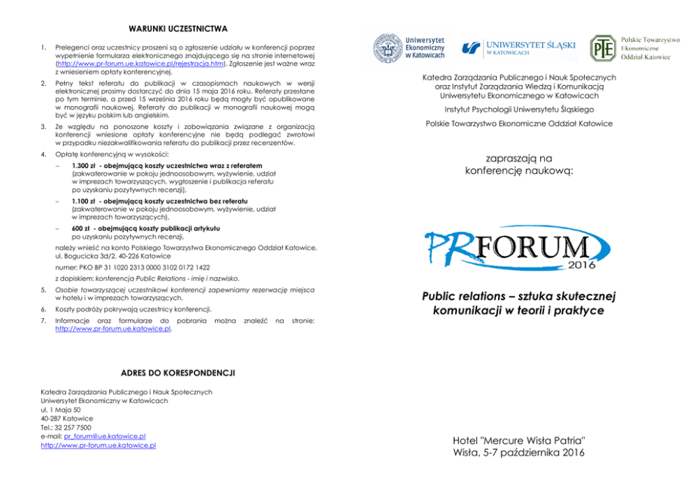 WARUNKI UCZESTNICTWA 1. Prelegenci oraz uczestnicy proszeni są o zgłoszenie udziału w konferencji poprzez wypełnienie formularza elektronicznego znajdującego się na stronie internetowej (http://www.pr-forum.ue.katowice.pl/rejestracja.htm). Zgłoszenie jest ważne wraz z wniesieniem opłaty konferencyjnej. 2. Pełny tekst referatu do publikacji w czasopismach naukowych w wersji elektronicznej prosimy dostarczyć do dnia 15 maja 2016 roku. Referaty przesłane po tym terminie, a przed 15 września 2016 roku będą mogły być opublikowane w monografii naukowej. Referaty do publikacji w monografii naukowej mogą być w języku polskim lub angielskim. 3. Ze względu na ponoszone koszty i zobowiązania związane z organizacją konferencji wniesione opłaty konferencyjne nie będą podlegać zwrotowi w przypadku niezakwalifikowania referatu do publikacji przez recenzentów. 4. Opłatę konferencyjną w wysokości: 1.300 zł - obejmującą koszty uczestnictwa wraz z referatem (zakwaterowanie w pokoju jednoosobowym, wyżywienie, udział w imprezach towarzyszących, wygłoszenie i publikacja referatu po uzyskaniu pozytywnych recenzji), 1.100 zł - obejmującą koszty uczestnictwa bez referatu (zakwaterowanie w pokoju jednoosobowym, wyżywienie, udział w imprezach towarzyszących), 600 zł - obejmującą koszty publikacji artykułu po uzyskaniu pozytywnych recenzji, Katedra Zarządzania Publicznego i Nauk Społecznych oraz Instytut Zarządzania Wiedzą i Komunikacją Uniwersytetu Ekonomicznego w Katowicach Instytut Psychologii Uniwersytetu Śląskiego Polskie Towarzystwo Ekonomiczne Oddział Katowice zapraszają na konferencję naukową: należy wnieść na konto Polskiego Towarzystwa Ekonomicznego Oddział Katowice, ul. Bogucicka 3d/2, 40-226 Katowice numer: PKO BP 31 1020 2313 0000 3102 0172 1422 z dopiskiem: konferencja Public Relations - imię i nazwisko. 5. Osobie towarzyszącej uczestnikowi konferencji zapewniamy rezerwację miejsca w hotelu i w imprezach towarzyszących. 6. Koszty podróży pokrywają uczestnicy konferencji. 7. Informacje oraz formularze do pobrania http://www.pr-forum.ue.katowice.pl. można znaleźć na Public relations – sztuka skutecznej komunikacji w teorii i praktyce stronie: ADRES DO KORESPONDENCJI Katedra Zarządzania Publicznego i Nauk Społecznych Uniwersytet Ekonomiczny w Katowicach ul. 1 Maja 50 40-287 Katowice Tel.: 32 257 7500 e-mail: [email protected] http://www.pr-forum.ue.katowice.pl Hotel "Mercure Wisła Patria" Wisła, 5-7 października 2016 PATRONAT HONOROWY PODSTAWOWE INFORMACJE Katedra Zarządzania Publicznego i Nauk Społecznych oraz Instytut Zarządzania Wiedzą i Komunikacją Uniwersytetu Ekonomicznego w Katowicach, we współpracy z Instytutem Psychologii Uniwersytetu Śląskiego i Polskim Towarzystwem Ekonomicznym Oddział Katowice zapraszają na XI konferencję pt.: PR FORUM 2016. Public relations – sztuka skutecznej komunikacji w teorii i w praktyce, która odbywać się będzie w dniach 5 – 7 października 2016 roku w Hotelu "Mercure Wisła Patria" w Wiśle, ul. Kopydło 20. Celem konferencji jest integracja środowiska specjalistów zajmujących się naukowo, dydaktycznie i praktycznie działalnością public relations. Artykuły prezentowane w trakcie konferencji zostaną opublikowane w: czasopiśmie naukowym „Studia Ekonomiczne. Zeszyty Naukowe Uniwersytetu Ekonomicznego w Katowicach”, ISSN 2083-8611, Lista B czasopism punktowanych MNiSW, obecnie 10 pkt., czasopiśmie naukowym „Społeczeństwo i Edukacja”, ISSN 1898-0171, Lista B czasopism punktowanych MNiSW, obecnie 7 pkt., monografii naukowej – 4 pkt. za publikację artykułu w języku polskim, 5 pkt za publikację artykułu w języku angielskim. Podstawą kwalifikacji artykułu do odpowiedniej publikacji będzie ocena recenzentów. Warunkiem publikacji jest: przesłanie tekstu artykułu sformatowanego zgodnie z wymogami edytorskimi w wersji elektronicznej (plik.doc/plik.docs) na adres Komitetu Organizacyjnego [email protected], przesłanie wydrukowanego i podpisanego o przeniesieniu autorskich praw majątkowych, oświadczenia Artykuły nie powinny przekraczać 15 stron (20 000 znaków ze spacjami). Do artykułu należy dołączyć słowa kluczowe i streszczenie, nie przekraczające 100 słów, w języku polskim i angielskim oraz notkę o autorze/autorach. 1. 2. 3. Znaczenie public relations w gospodarce, polityce, społeczeństwie. Nowe media a skuteczność działań public relations. Współczesne wyzwania wobec public relations: PR w działalności organizacji non-profit. 4. 5. Kształtowanie wizerunku osób zagrożonych wykluczeniem społecznym. Wyzwania dydaktyki public relations: kształcenie akademickie a oczekiwania praktyków public relations, profesjonalizacja i licencjonowanie zawodu specjalisty ds. public relations. Rola i znaczenie PR w projektach kooperacyjnych (partnerstwa międzyorganizacyjne). Relacje między PR a HR. Czy public relations wewnętrzne to konkurencja czy wsparcie dla HR? 6. 7. KOMITET NAUKOWY: prof. dr hab. Aldona Frączkiewicz-Wronka – przewodnicząca Uniwersytet Ekonomiczny w Katowicach prof. zw. dr hab. Przemysław Deszczyński prof. dr hab. Kazimierz Perechuda Uniwersytet Ekonomiczny w Poznaniu Uniwersytet Ekonomiczny we Wrocławiu prof. Fred Freundlich, PhD prof. zw. dr hab. Krystyna Wojcik Mondragon/Spain prof. zw. dr hab. Jerzy Gołuchowski dr hab. Małgorzata Dobrowolska Uniwersytet Ekonomiczny w Katowicach prof. zw. dr hab. Iwona Hofman Uniwersytet Śląski dr hab. Zbigniew Spendel Uniwersytet Marii Curie-Skłodowskiej w Lublinie prof. Saioa Arando Lasagabaste, PhD Uniwersytet Śląski dr Magda Pieczka Mondragon/Spain Queen Margaret University in Edinburgh prof. zw. dr hab. Ryszard Ławniczak dr n. med. Hanna Saryusz-Wolska Wojskowa Akademia Techniczna w Warszawie Autora uzyskanie pozytywnych recenzji, uiszczenie opłaty konferencyjnej. Artykuły, przesłane w terminie do dnia 15 maja 2016 roku, które uzyskają pozytywną op