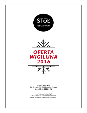 oferta wigilijna 2016 Restauracja STÓŁ Św. Anny 4, 31-008 Kraków, Poland tel. +48 12 422 21 91 www.restauracjastol.pl www.facebook.com/restauracjastol/ www.instagram.com/restauracjastol/ Menu wigilijne I Cena zestawu 59 pln/os. Przystawki Śledź macerowany w oleju lnianym z cebulką, grzybami i żurawiną lub Pasztet z królika w cieście chlebowym Zupy Wigilijna zupa grzybowa z łazankami lub Barszcz czerwony z uszkami Dania główne Filet z karpia w sosie polskim / puree z ziemniaków i grochu / gołąbek z kapustą i grzybami lub Szynka pieczona w pomarańczach i goździkach / kasza z wędzonymi śliwkami / sos borowikowy / tradycyjna kapusta z grochem lub Strudel z ciasta drożdżowego z grzybami i kaszą gryczaną / sos piernikowy Deser Makówki lub Ciasto piernikowe z czekoladą Napoje zawarte w cenie menu: tradycyjny kompot z suszonych owoców, soki owocowe, woda Opcja dodatkowa zimna Cena 19 pln/os. płyta Karp po żydowsku Szczupak faszerowany leśnymi grzybami Pasztet z gęsi w cieście chlebowym Śledzie macerowane w trzech odsłonach: z żurawiną, grzybami, oliwa Sałatka jarzynowa Sałatka śledziowa Menu wigilijne II Cena zestawu 79 pln/os. PRZYSTAWKI Kulebiak drożdżowy z kapustą i grzybami / sos borowikowy lub Roladki z kaczki z suszonymi owocami i bakaliami / konfitura z cebuli i pomarańczy Zupy Krem z borowików z torcikiem grzybowym lub Barszcz czerwony z pasztecikiem francuskim lub uszkami lub Krem z kasztanów i orzechów włoskich Dania główne Kaczka pieczona w dwojniaku / kluseczki z suszonymi śliwkami / czerwona kapusta z miodem / konfitura z kwaśnych rajskich jabłek lub Filet z sandacza w kruszonce z bakalii / duszone grzyby leśne / ziemniaczane puree / pieczone buraki z goździkami lub Pieczona szynka z dzika w jałowcu / pierogi z kapustą i grzybami / sos żurawinowy z rumiankiem Deser Kutia z makiem lub Sernik świąteczny lub Moczka wigilijna Napoje zawarte w cenie menu: tradycyjny kompot z suszonych owoców, soki owocowe, woda Opcja dodatkowa zimna Cena 19 pln/os. płyta Karp po żydowsku Szczupak faszerowany leśnymi grzybami Pasztet z gęsi w cieście chlebowym Śledzie macerowane w trzech odsłonach: z żurawiną, grzybami, oliwa Sałatka jarzynowa Sałatka śledziowa Restauracja STÓŁ Św. Anny 4, 31-008 Kraków, Poland tel. +48 12 422 21 91 Rezerwacje +48 693 414 411 +48 502 246 505 mail: [email protected] www.restauracjastol.pl www.facebook.com/restauracjastol/ www.instagram.com/restauracjastol/