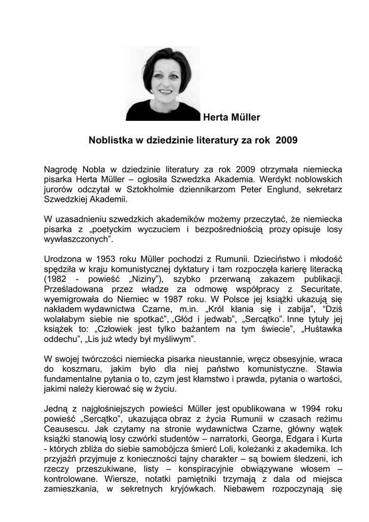 Herta Müller Noblistka w dziedzinie literatury za rok 2009 Nagrodę Nobla w dziedzinie literatury za rok 2009 otrzymała niemiecka pisarka Herta Müller – ogłosiła Szwedzka Akademia. Werdykt noblowskich jurorów odczytał w Sztokholmie dziennikarzom Peter Englund, sekretarz Szwedzkiej Akademii. W uzasadnieniu szwedzkich akademików możemy przeczytać, że niemiecka pisarka z „poetyckim wyczuciem i bezpośredniością prozy opisuje losy wywłaszczonych”. Urodzona w 1953 roku Müller pochodzi z Rumunii. Dzieciństwo i młodość spędziła w kraju komunistycznej dyktatury i tam rozpoczęła karierę literacką (1982 - powieść „Niziny”), szybko przerwaną zakazem publikacji. Prześladowana przez władze za odmowę współpracy z Securitate, wyemigrowała do Niemiec w 1987 roku. W Polsce jej książki ukazują się nakładem wydawnictwa Czarne, m.in. „Król kłania się i zabija”, “Dziś wolałabym siebie nie spotkać”, „Głód i jedwab”, „Sercątko”. Inne tytuły jej książek to: „Człowiek jest tylko bażantem na tym świecie”, „Huśtawka oddechu”, „Lis już wtedy był myśliwym”. W swojej twórczości niemiecka pisarka nieustannie, wręcz obsesyjnie, wraca do koszmaru, jakim było dla niej państwo komunistyczne. Stawia fundamentalne pytania o to, czym jest kłamstwo i prawda, pytania o wartości, jakimi należy kierować się w życiu. Jedną z najgłośniejszych powieści Müller jest opublikowana w 1994 roku powieść „Sercątko”, ukazująca obraz z życia Rumunii w czasach reżimu Ceausescu. Jak czytamy na stronie wydawnictwa Czarne, główny wątek książki stanowią losy czwórki studentów – narratorki, Georga, Edgara i Kurta - których zbliża do siebie samobójcza śmierć Loli, koleżanki z akademika. Ich przyjaźń przyjmuje z konieczności tajny charakter – są bowiem śledzeni, ich rzeczy przeszukiwane, listy – konspiracyjnie obwiązywane włosem – kontrolowane. Wiersze, notatki pamiętniki trzymają z dala od miejsca zamieszkania, w sekretnych kryjówkach. Niebawem rozpoczynają się przesłuchania. Kapitan służby bezpieczeństwa Pjele psychicznie i fizycznie pastwi się nad rzekomymi wywrotowcami. Prześladowania jeszcze bardziej wzmacniają emocjonalną więź czwórki. Ich przyjaźń jest pancerzem ochronnym, oazą normalności w świecie, w którym dyktatura wypacza relacje międzyludzkie. Herta Müller jest laureatką wielu prestiżowych nagród literackich, w tym Nagrody im. Kleista (1994), Europejskiej Nagrody Literackiej Aristeion (1995), Nagrody Fundacji im. Konrada Adenauera w dziedzinie literatury (2004) oraz Berliner Literaturpreis-Heiner-Müller-Gastprofessur (2005). www.salonkulturalny.pl/literacka-nagroda-nobla-2009-dla-herty-muller/ Literacki Nobel 2009 Redakcja G-punkt , 08-10-2009 14:54 Znamy już laureata, a raczej laureatkę, Literackiej Nagrody Nobla 2009. Akademia Szwedzka przyznała wyróżnienie niemieckiej pisarce - Hercie Müller- tej, która łącząc intensywność poezji i szczerość prozy przedstawia świat wygnanych. Jak co roku werdykt jury Literackiej Nagrody Nobla zaskoczył. Tym razem przewidywania giełdowe się nie sprawdziły. Typowany Amos Oz musi poczekać do przyszłego roku. A tymczasem Niemcy mogą zacząć świętować, Herta Müller jest bowiem jedną z najwybitniejszych postaci współczesnej literatury niemieckiej. Urodzona w rumuńskim Banacie, spędziła dzieciństwo i młodość w kraju komunistycznej dyktatury. W Rumunii rozpoczęła się jej kariera literacka, ale w niedługim czasie pisarka została ukarana zakazem publikacji. Wyemigrowała do Niemiec i tam została do dziś. Jej proza zdobyła uznanie na całym świecie, o czym świadczą liczne przekłady i nagrody ( m.in. Nagroda im. Kleista, Europejska Nagroda Literacka Aristeion , International IMPAC Dublin Literary Award , Nagroda im. Kafki oraz Nagroda Fundacji im. Konrada Adenauera w dziedzinie literatury). Nie szukam tematów, to one mnie znajdują. Gdyby nie uwierał mnie bagaż doświadczeń, nie musiałabym o tym pisać. Nie przeżyłam na szczęście aż tak wielkiego dramatu, jak więźniowie obozów koncentracyjnych. Nie mogę i nie chcę się z nimi porównywać. Ale myślę, że pisanie o dramacie historii jest potrzebne nowym pokoleniom- tak o swojej twórczości wypowiada się sama autorka. Jej książki to konstrukcje zbudowane z gestów, spojrzeń, barwnych detali. Müller w swych tekstach dotyka tematów trudnych i niewygodnych. W Polsce ukazały się m.in. „Sercątko”, „Dziś wolałabym siebie nie spotkać”, „Głód i jedwab”. http://gpunkt.pl/content/literacki_nobel_2009